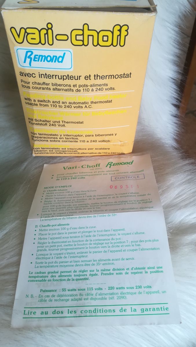 Vend chauffe biberon et petits pots "Vari-choff" de la marque Remond en parfait état de fonctionnement. Thermostat réglable de 1 à 11.