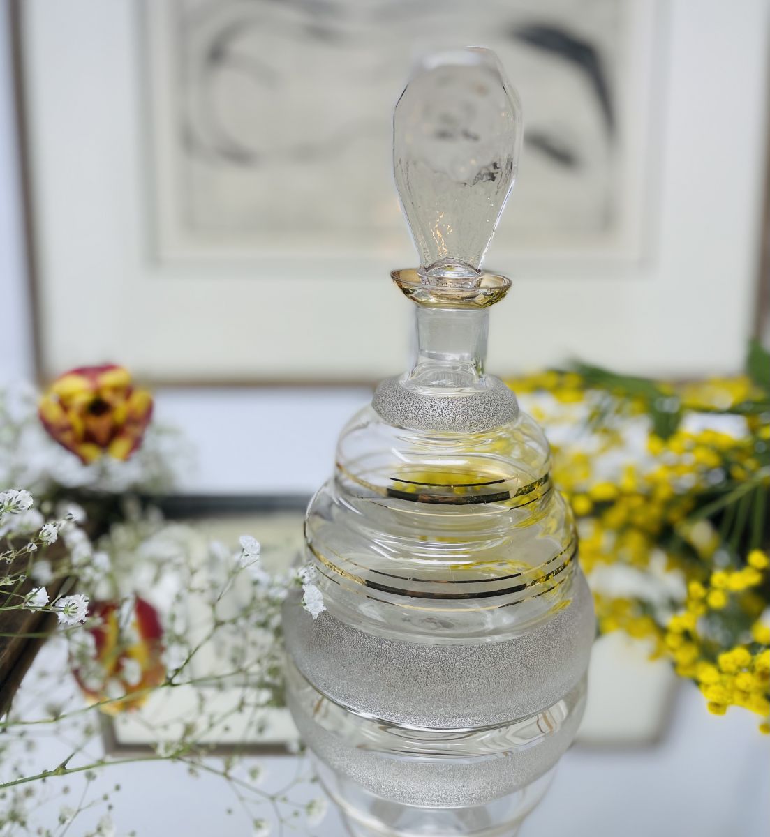 Bouteille de forme pyramidale en verre blanc granité et rayures dorées, une allure art déco tout en rondeur et douceur.. Un joli bouchon octogonal en verre bullé. Elle est très graphique.
