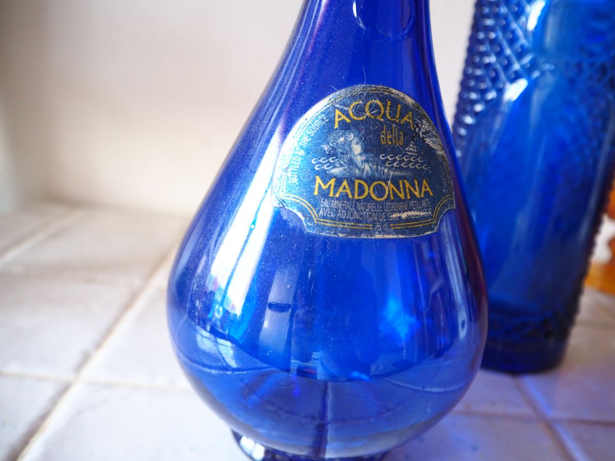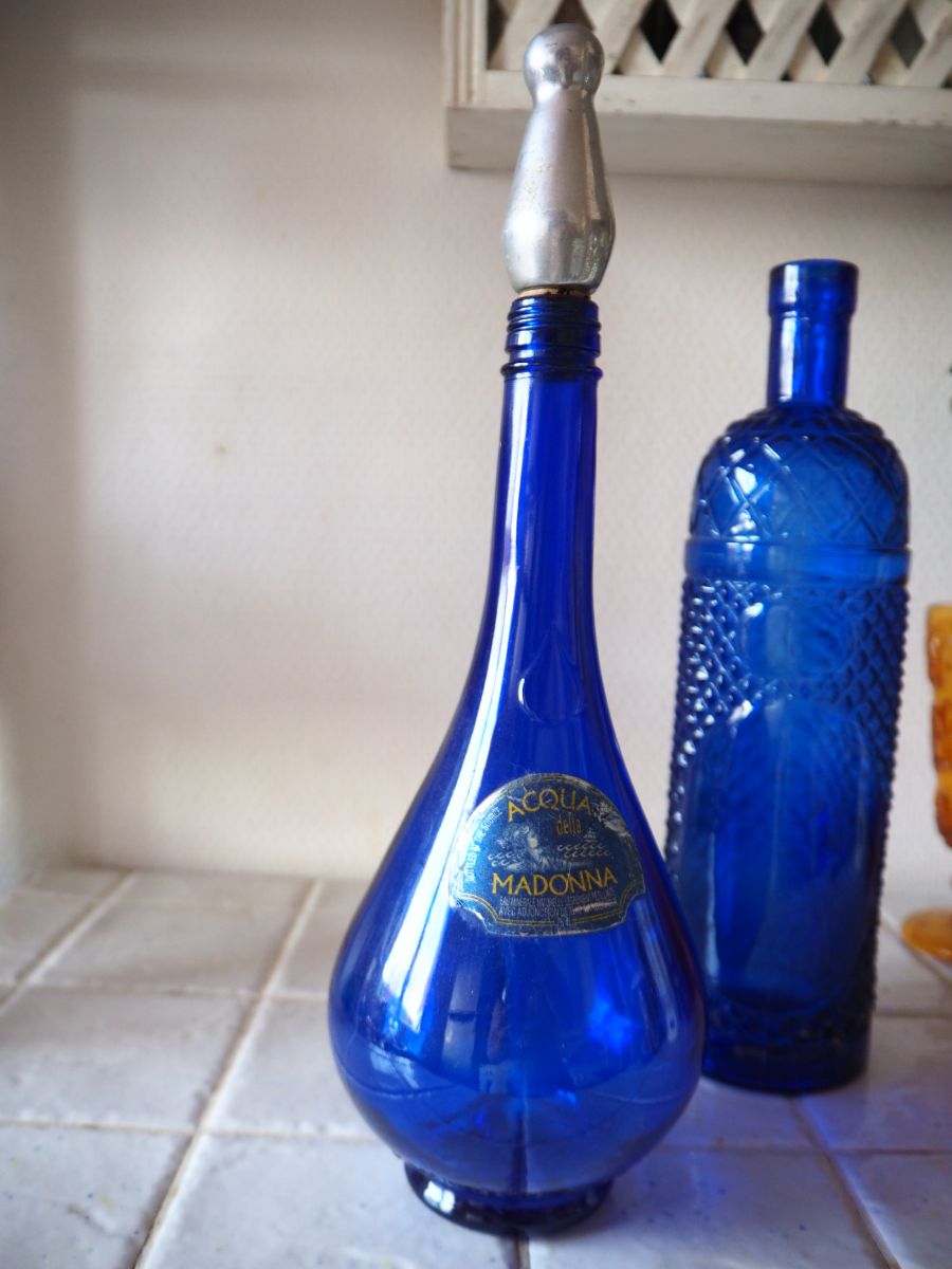 La seconde avec son étiquette de la marque ACQUA DELA MADONNA est en forme de goutte d'eau ou lampe de génie. Le bouchon en étain n'est pas d'origine mais lui donne une jolie allure ! Elle mesure 27cm + un bouchon de 8cm.