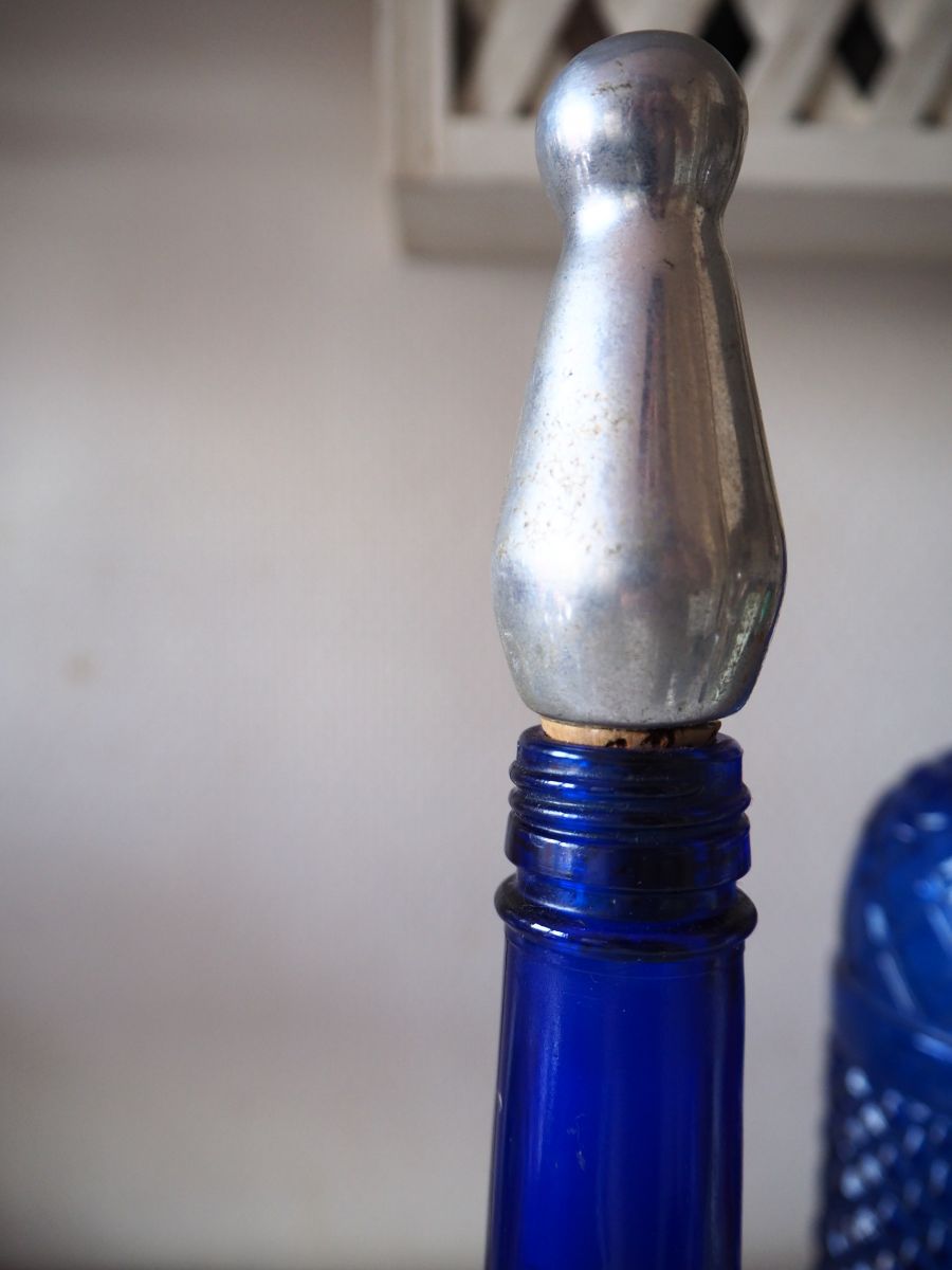 La première, sans bouchon, est en verre biseauté et très décoratif. Elle mesure 30cm.