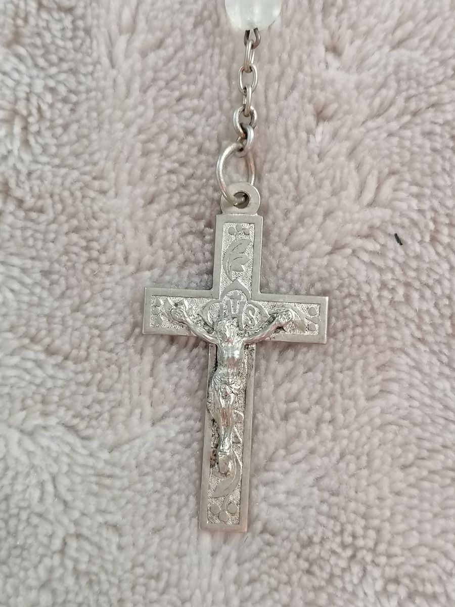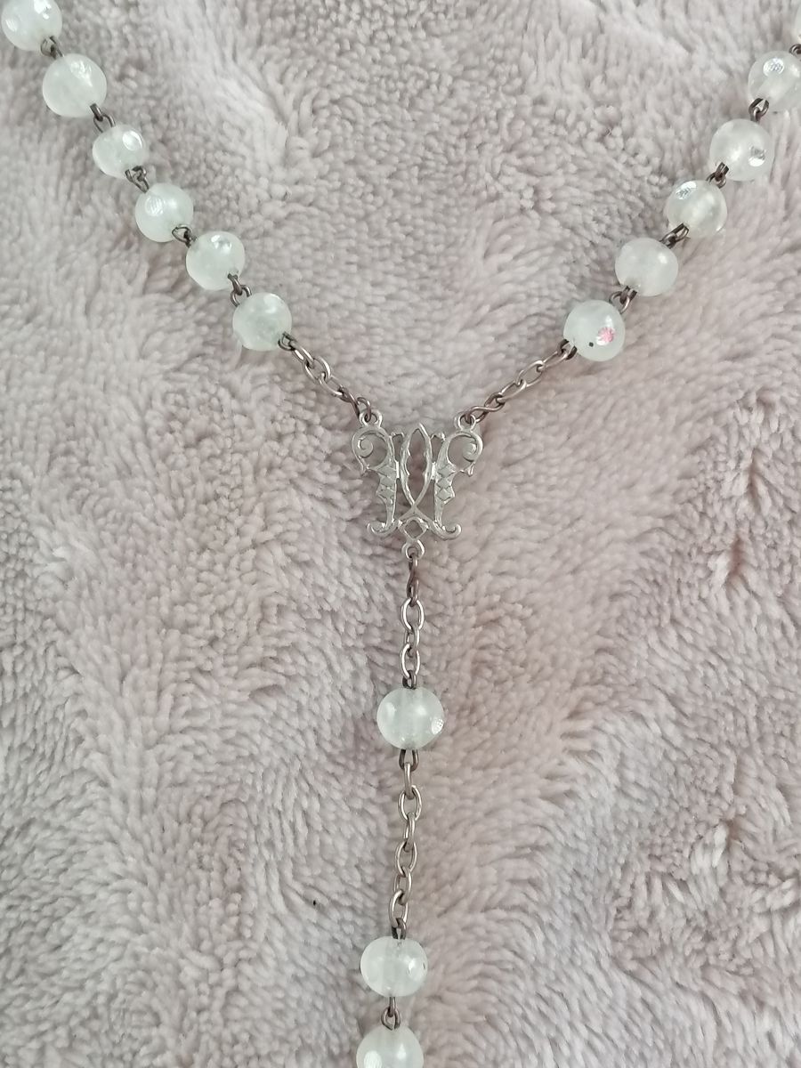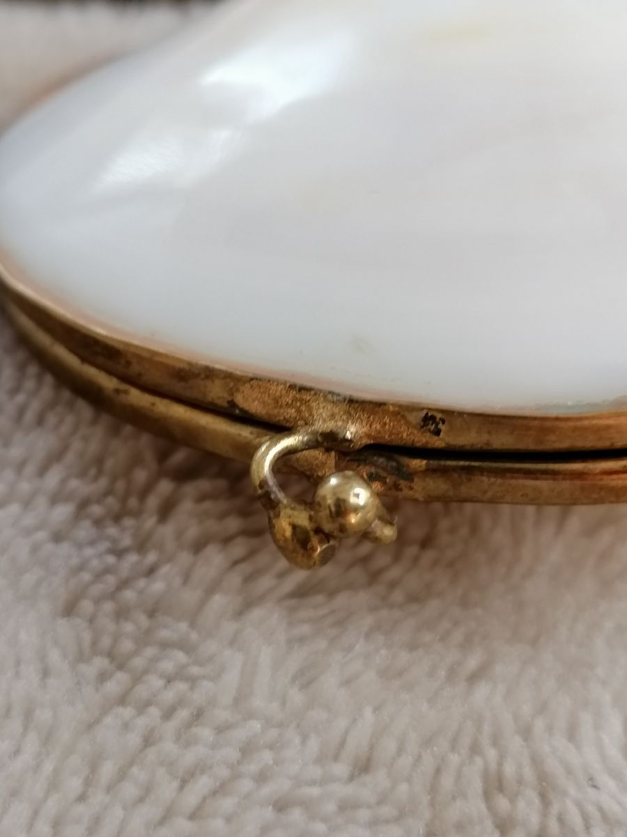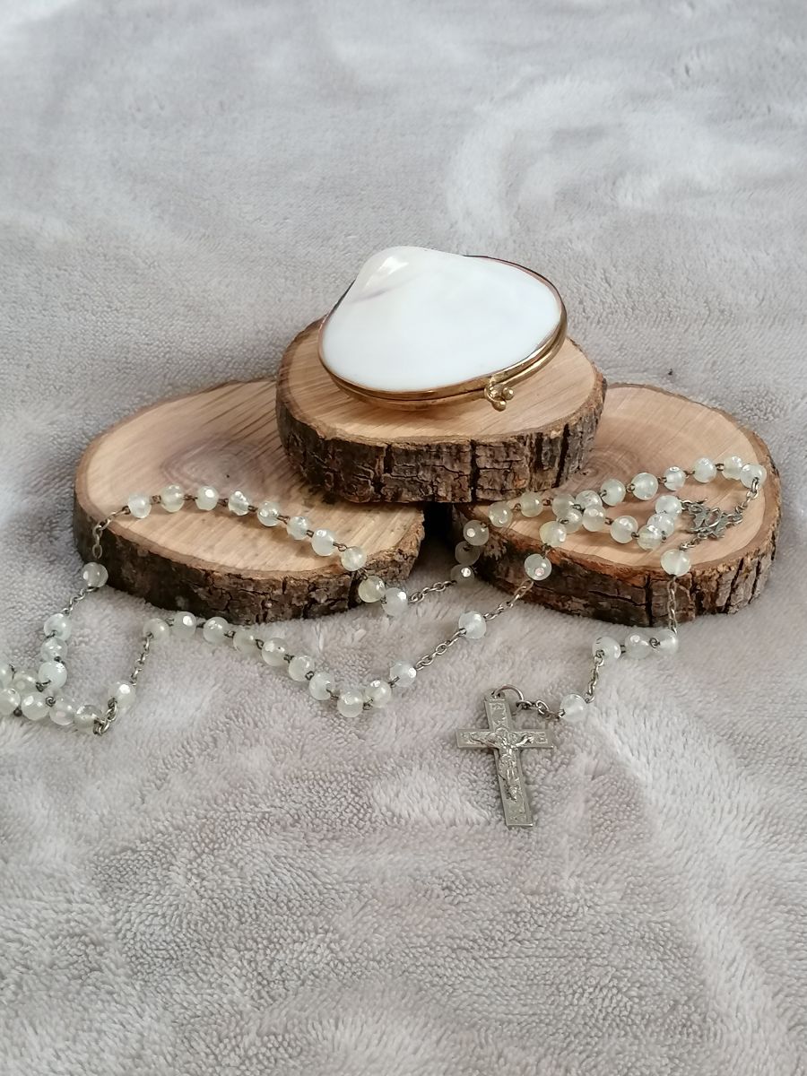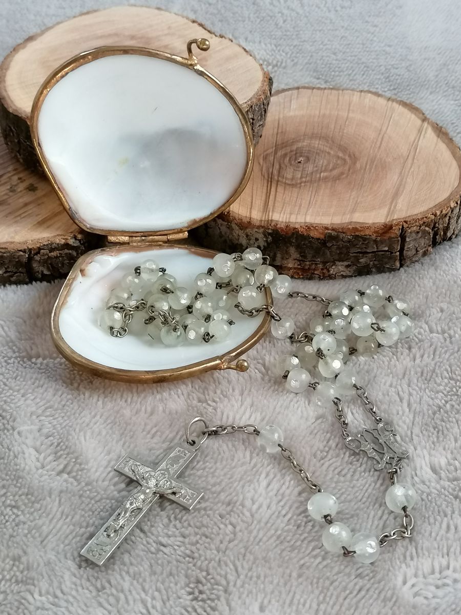 Superbe boîte à chapelet ancienne en coquillage et laiton , vendue avec un chapelet en perles de verre et argent.