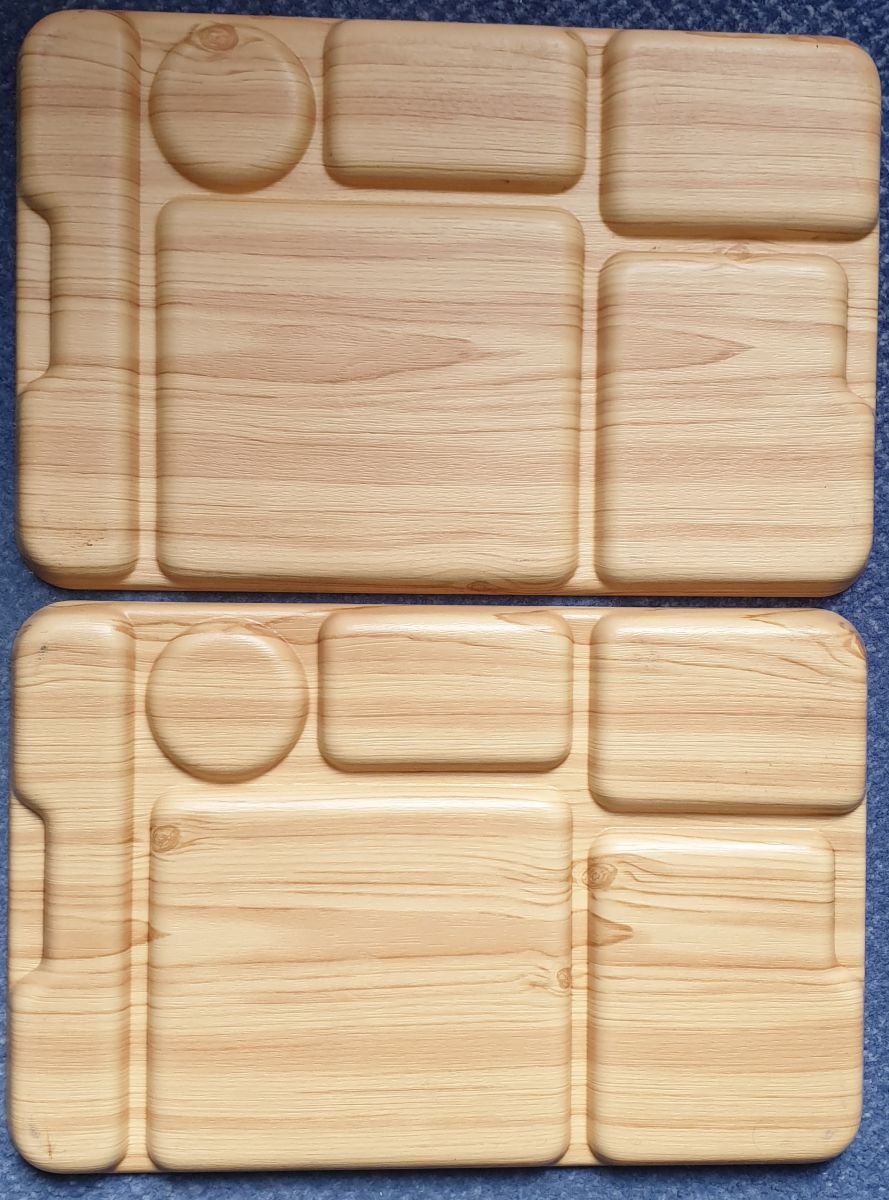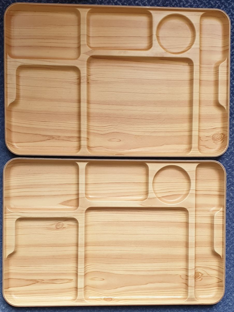 Lot de 2 plateaux repas vintage Caleppio ROBEX crème - imitation bois, Made in Italy, datant des années 1970 Matière : En plastique moulé imitation bois Ce plateau est décrit par son fabricant comme étant incassable, idéal pour les aliments chauds ou froids. il comporte 6 compartiments en relief. Marquage au dos : « Caleppio / C 4370 » Bel élément rétro au design scandinave, toujours tendance. Très bon état. Dimensions : • Épaisseur : 2 cms (0.78 inch ) • Longueur : 40.5 cms (15.74 inch ) • Largeur : 26.5 cms (10.23 inch ) • Poids : 400 g chaque plateau