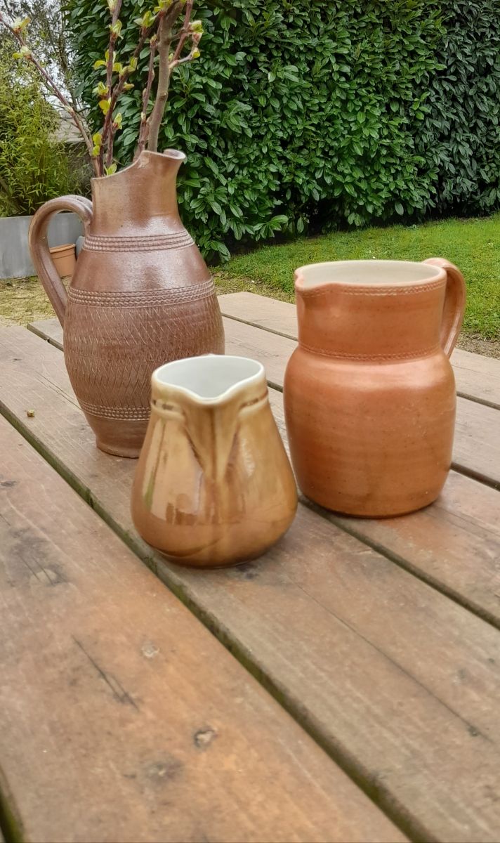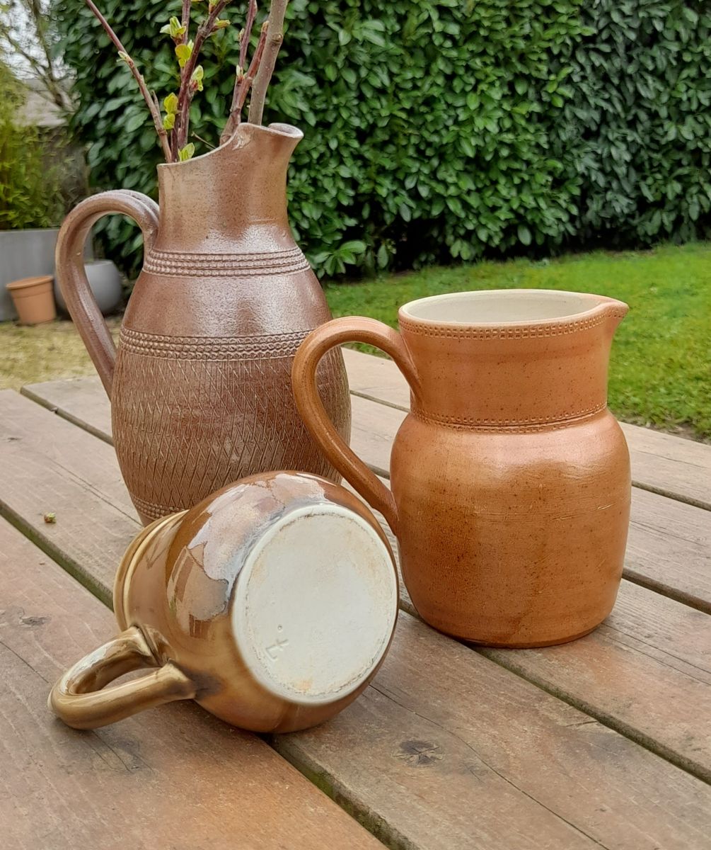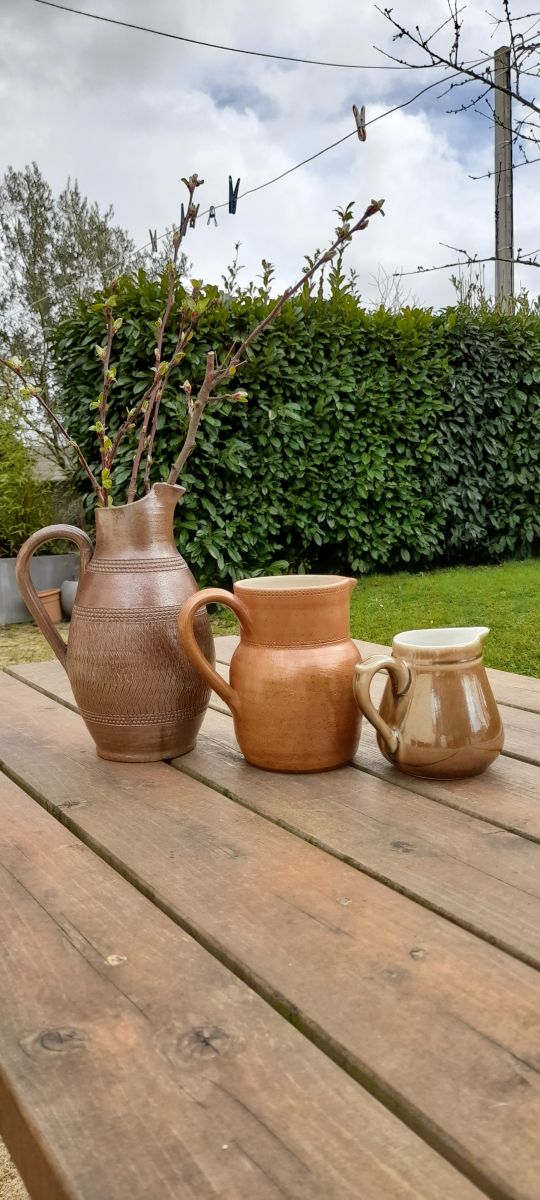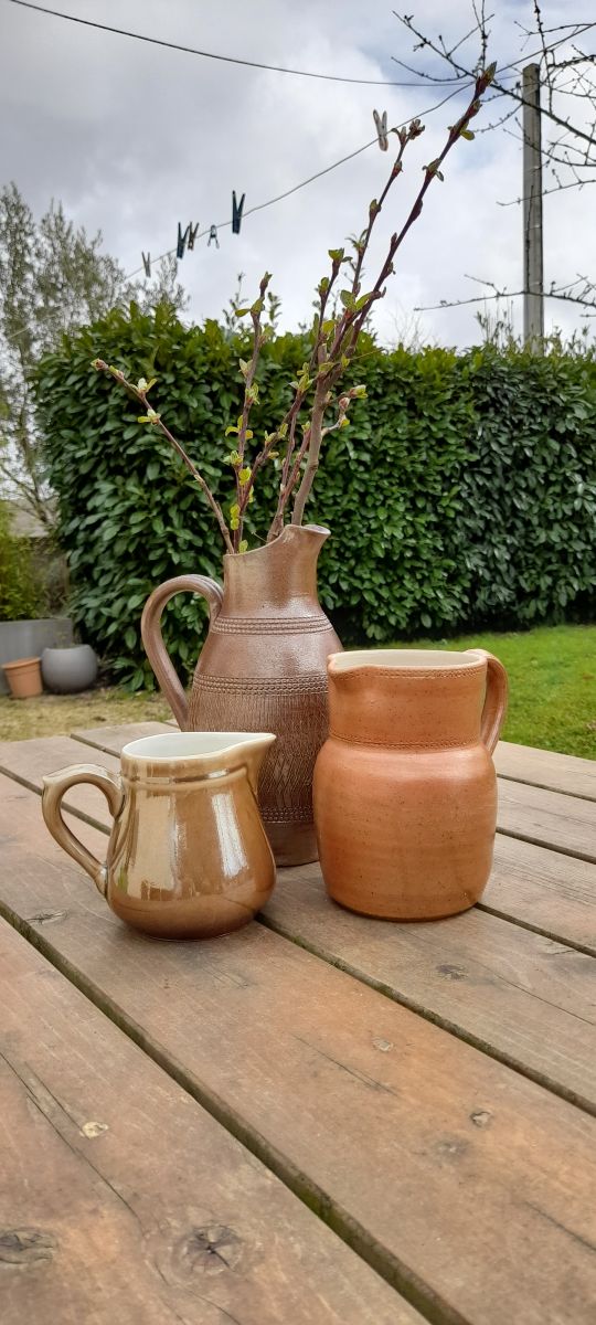 Le petit pot verseur de lait est en faïence brillante marron irisé qui, je trouve????, donne une belle harmonie à l'ensemble.