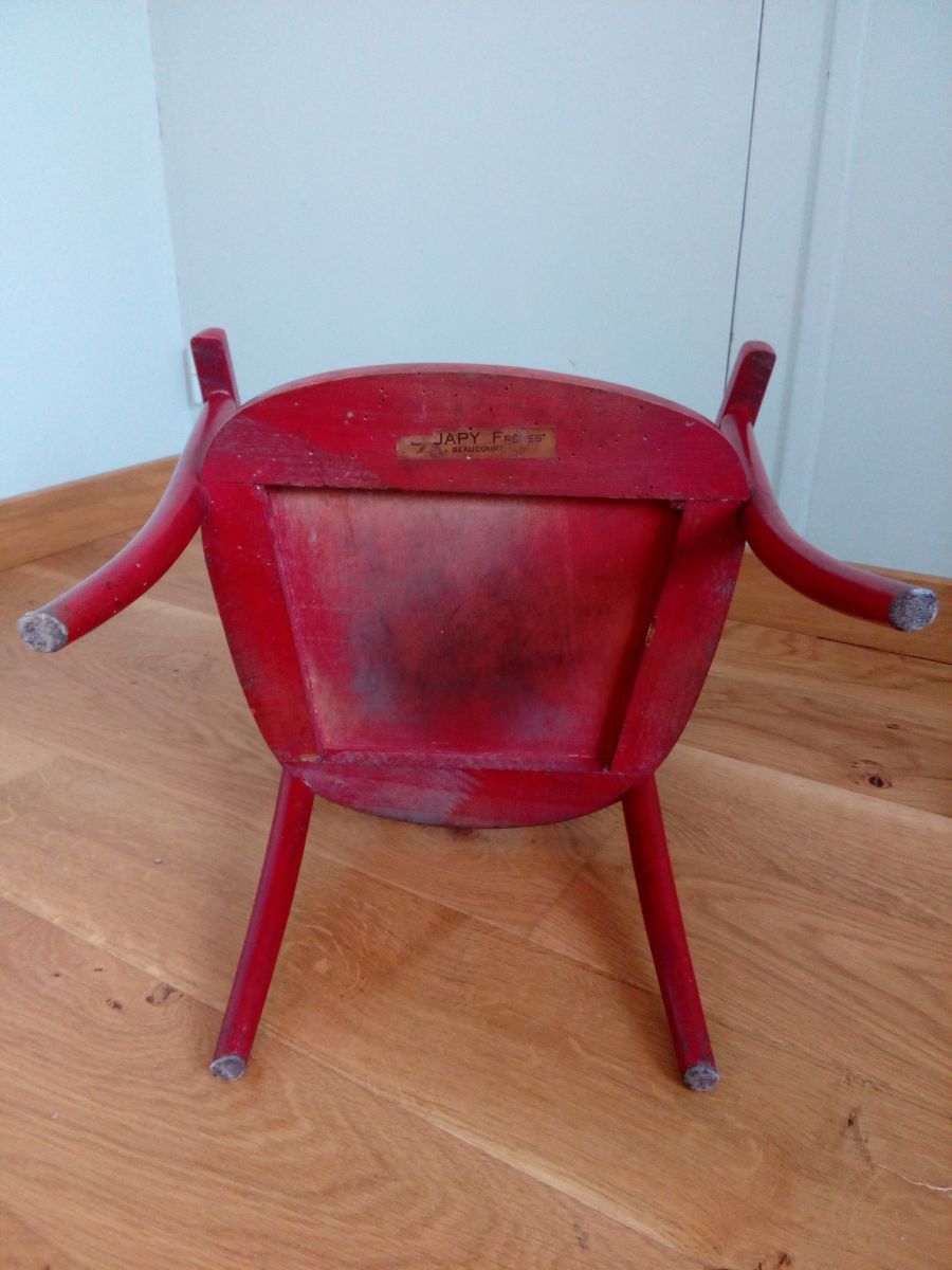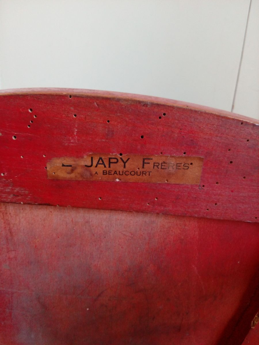 Magnifique fauteuil d'enfant, en bois courbé, laqué en rouge (d'origine je pense), avec une patine incroyable, inimitable et pour cause, ce fauteuil a plus de 80 ans ! Il est de la marque Japy frères à Beaucourt et comporte une étiquette partielle en dessous. Il est rare, je n'en ai pas retrouvé de semblable lors de mes recherches. Mais j'ai retrouvé sa trace sur un catalogue de mobilier Japy, il s'agit du siège enfant n°83 livré normalement en teinte nature, le laquage couleur se faisait sur demande avec paiement d'un supplément. Or, d'après mes recherches, l'entreprise Japy, qu'on connaît mieux comme quincaillier et horloger a vendu sa branche « mobilier » à la maison Baumann en mai 1939. Ce qui permet de dater ce fauteuil d'avant mai 1939 et explique aussi pourquoi ce fauteuil ressemble beaucoup à certains modèles estampillés Baumann. Vu son âge, il est en bon état, encore solide et stable. Mais il ne cache pas son âge avec des taches et marques nombreuses et diverses et notamment des trous de vrillettes que j'ai traités par injection de vinaigre blanc. Je l'ai nettoyé et j'ai ajouté de petits patins en feutrine (non présents sur les photos). Il mesure 45 cm au plus haut, 24 cm de hauteur d'assise, 35 cm de largeur, 35 cm de profondeur et pèse environ 1, 7 kg.