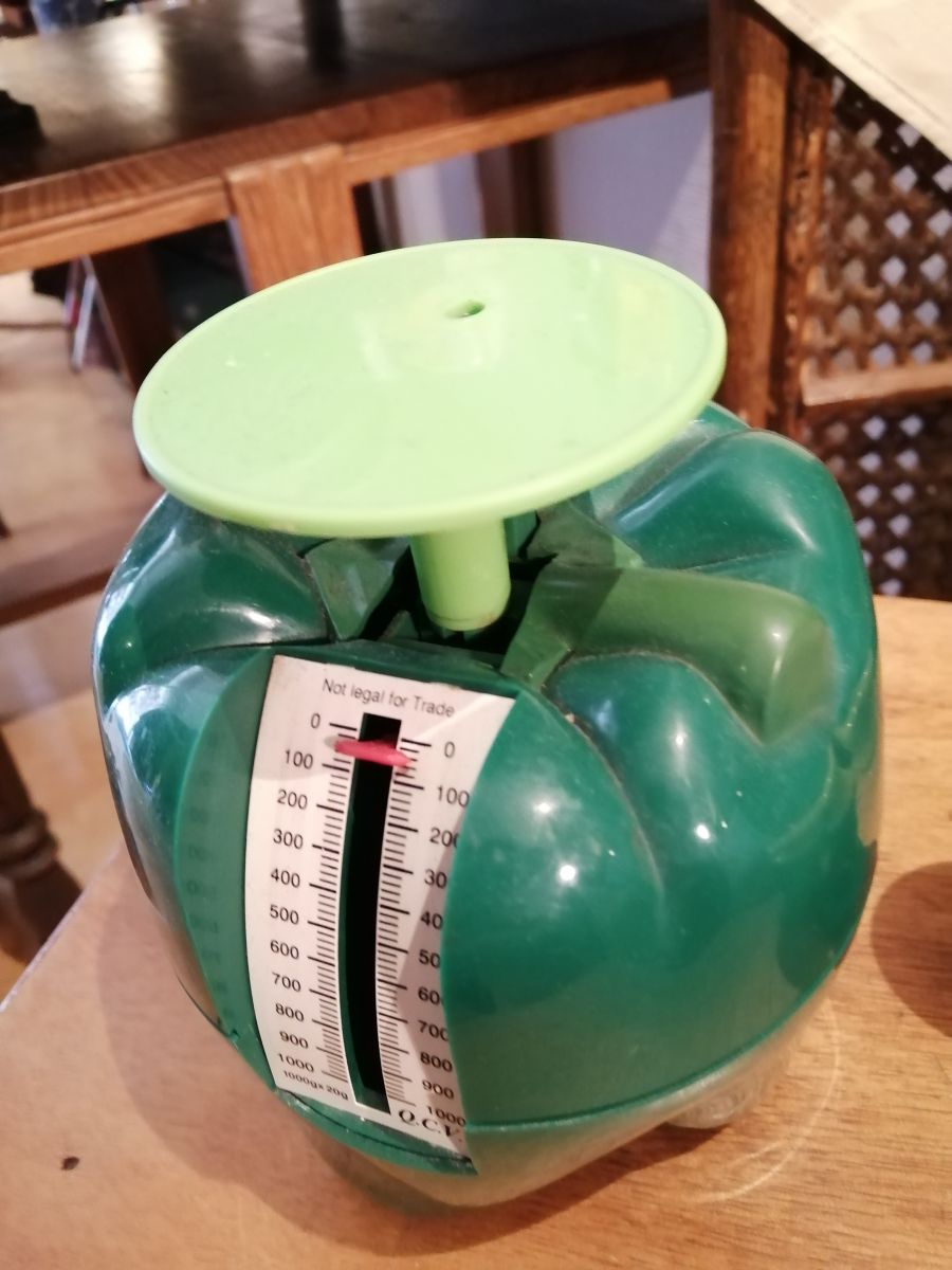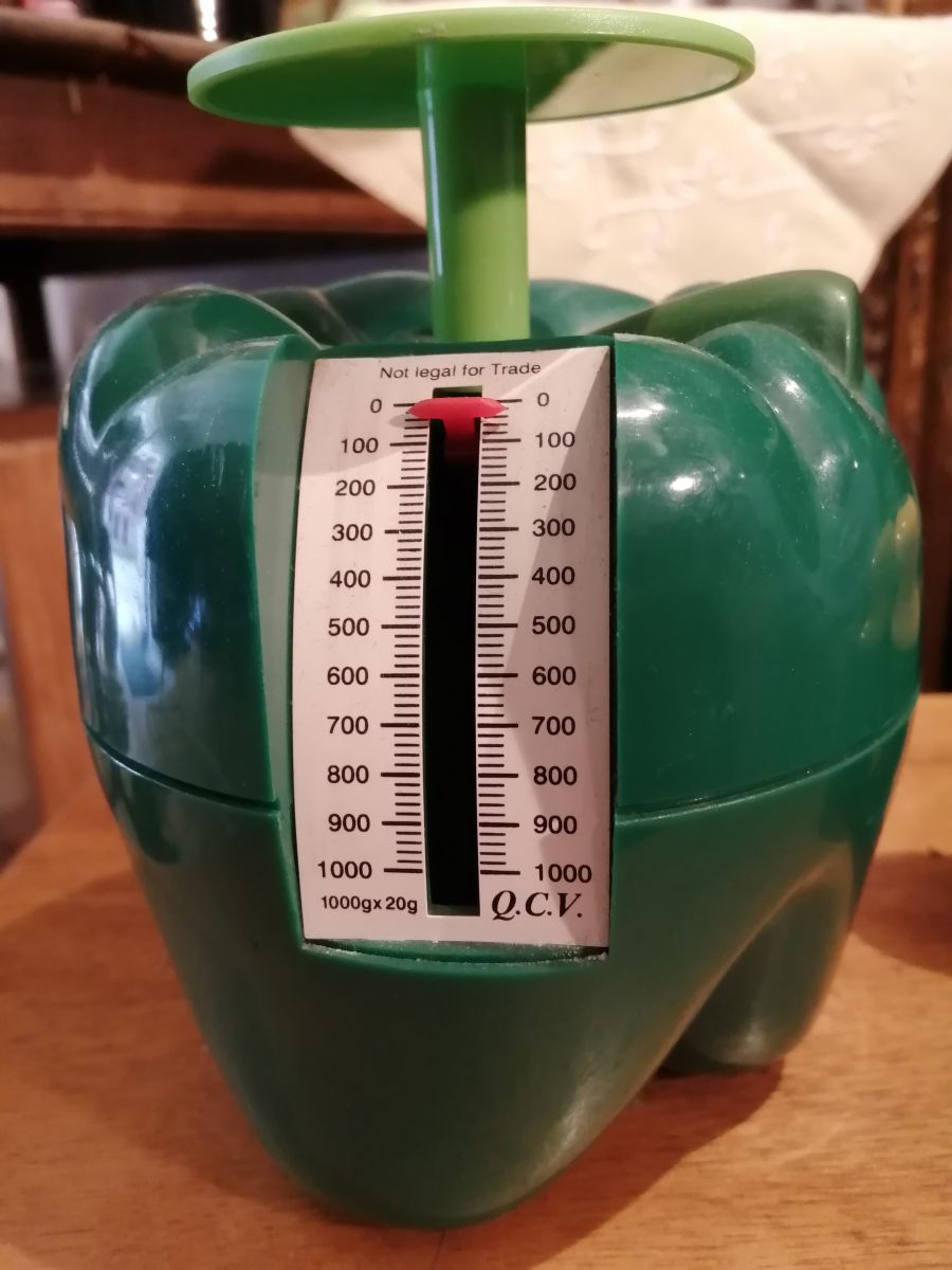 Authentique balance vintage verte en forme de poivron. Objet sympa et pratique pour une déco originale !