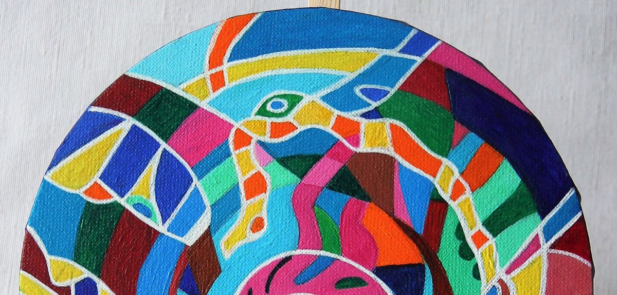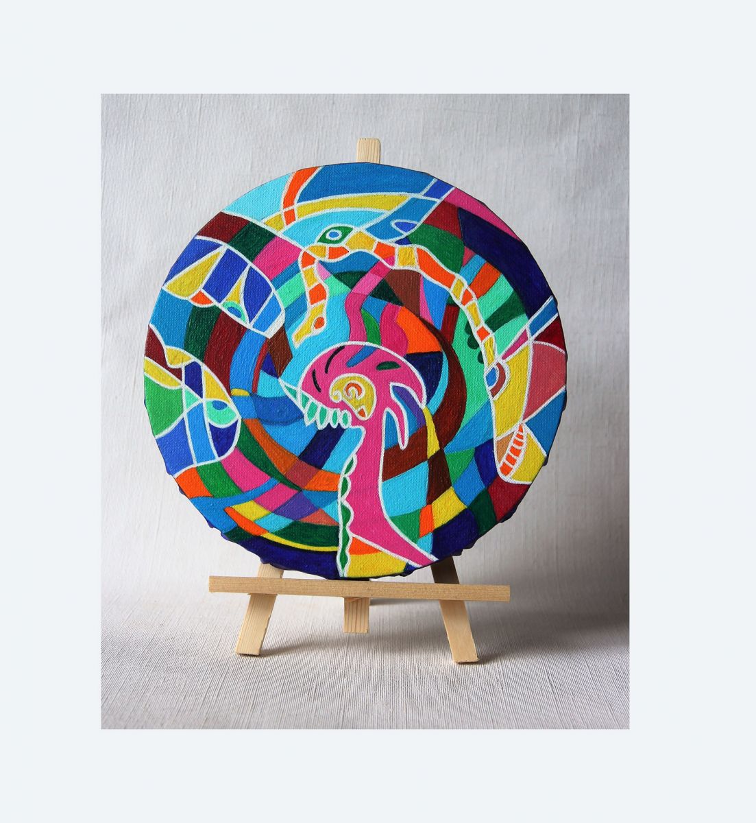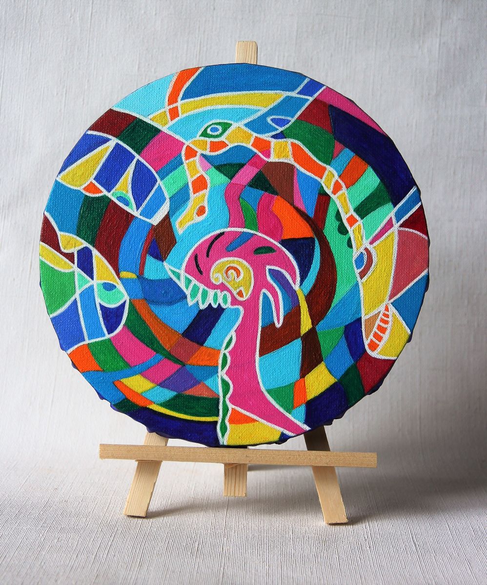 Décoration murale pièce unique de style art singulier. Peinture sur toile châssis petit format rond. Animaux et personnages fantastiques.