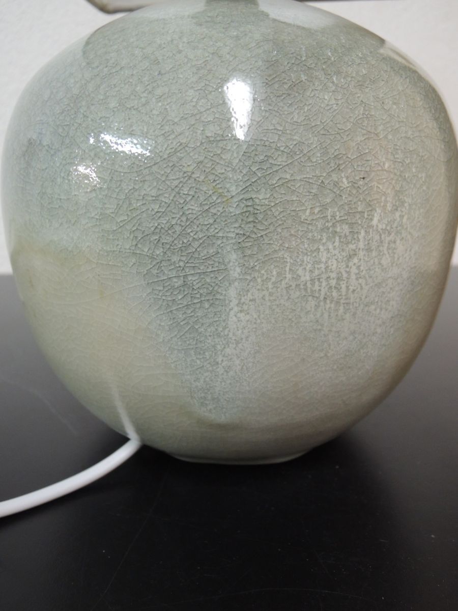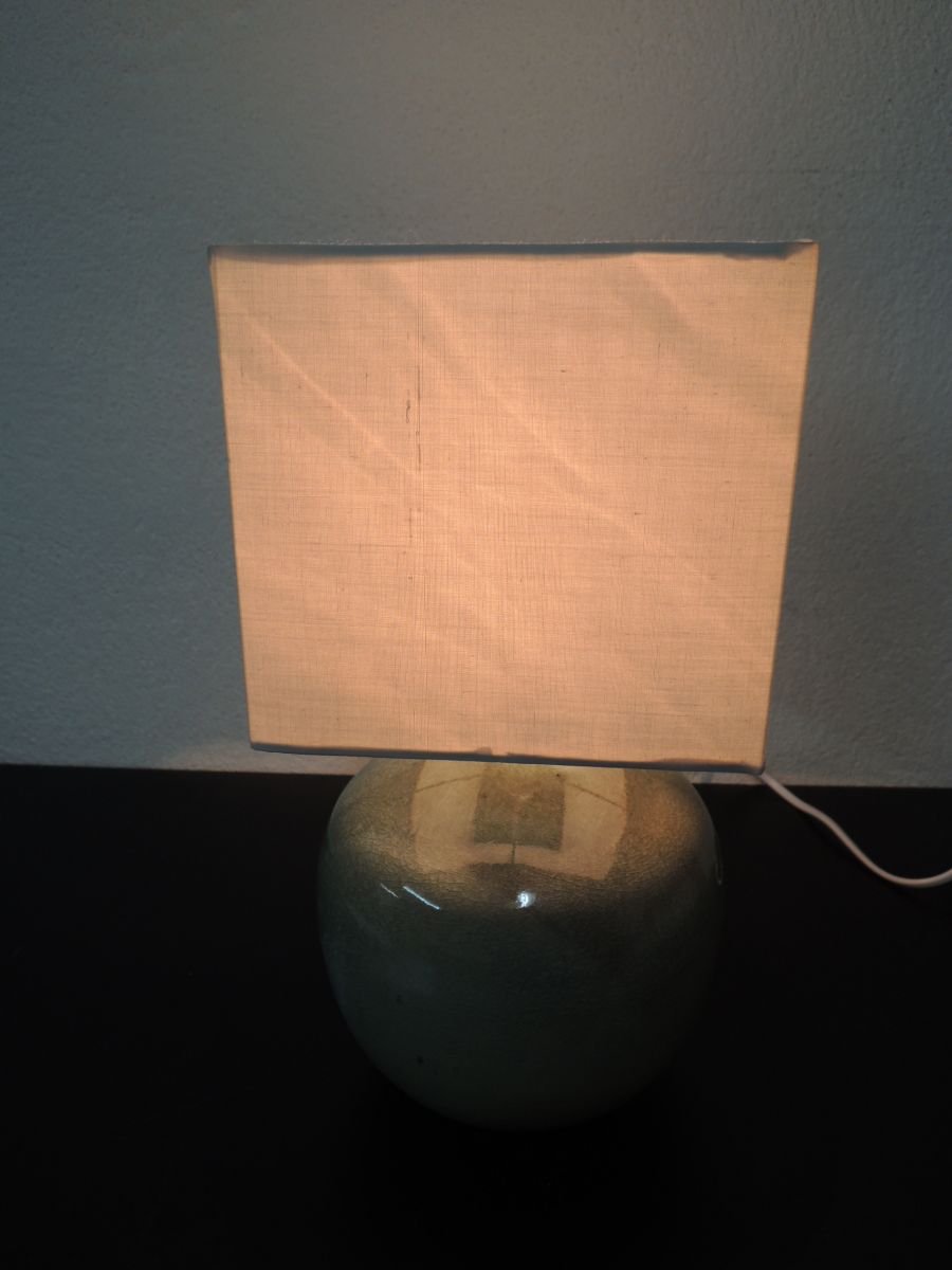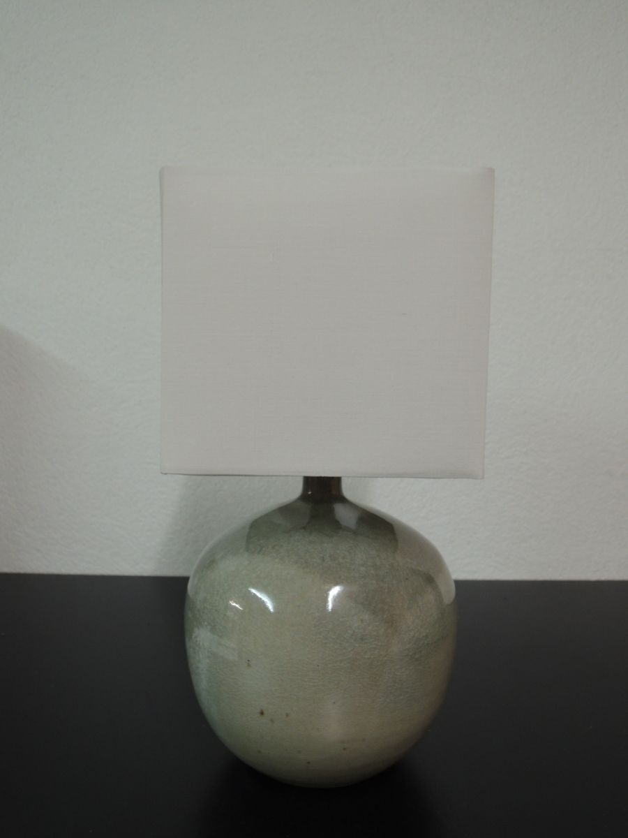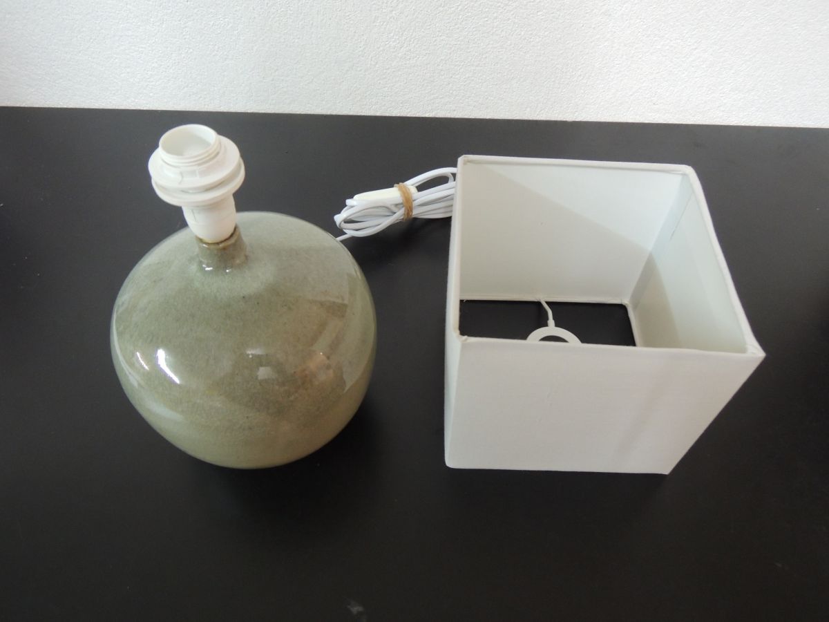Lampe avec fut en céramique fait à artisanalement (signé par le potier) dans les tons gris émeraude, abat jour carré en toile synthétique. Équipée d'une douille à vis (type E14). Électricité révisée (douille et câble avec interrupteur neufs).