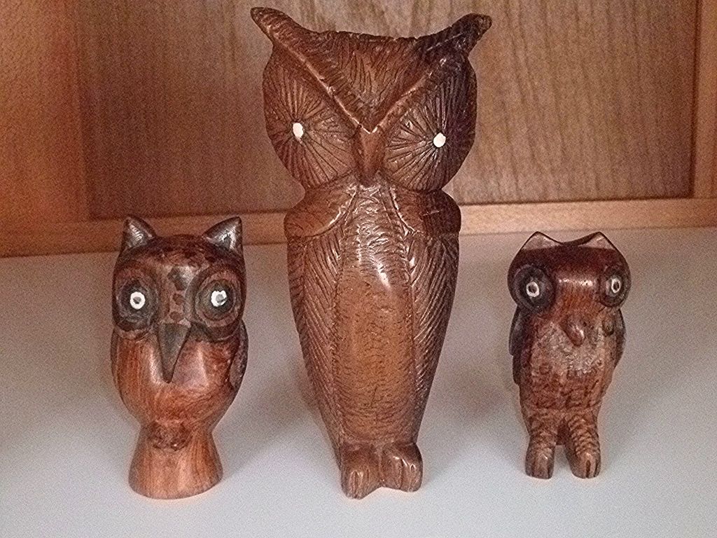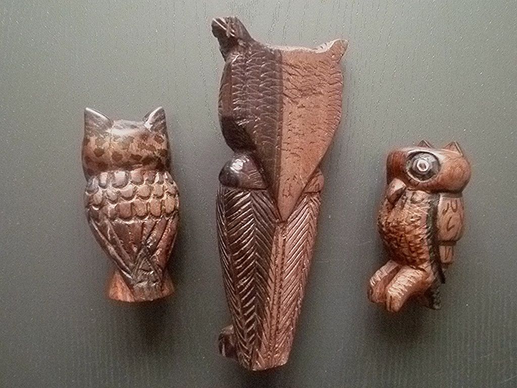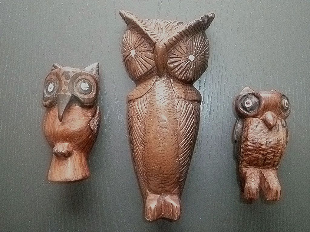 lot de 3 hibous , chouettes en bois sculpté artisanal