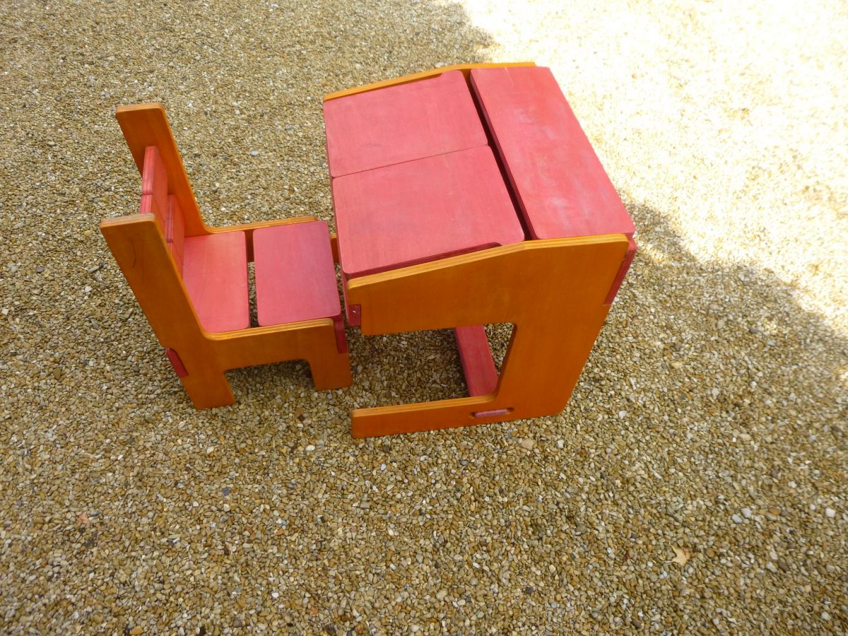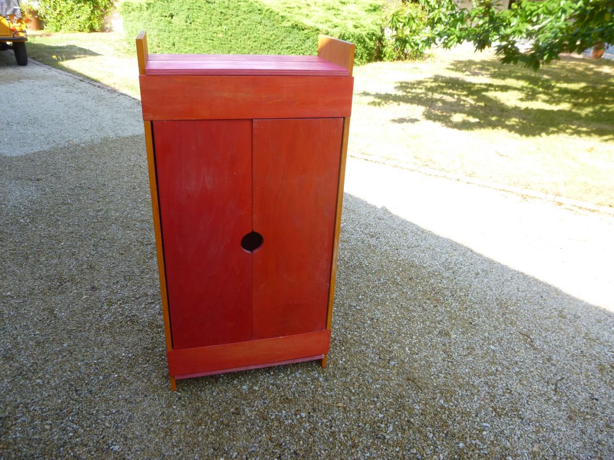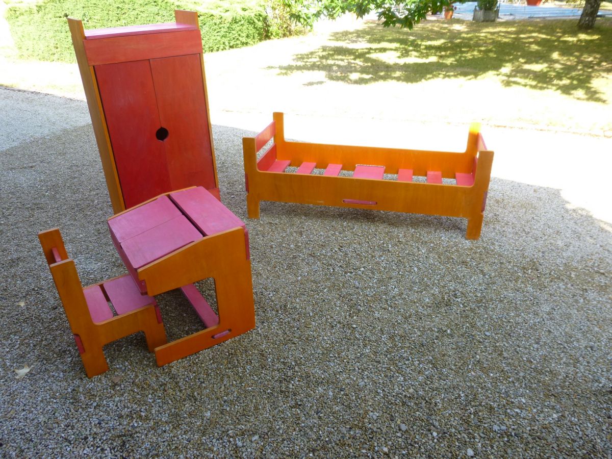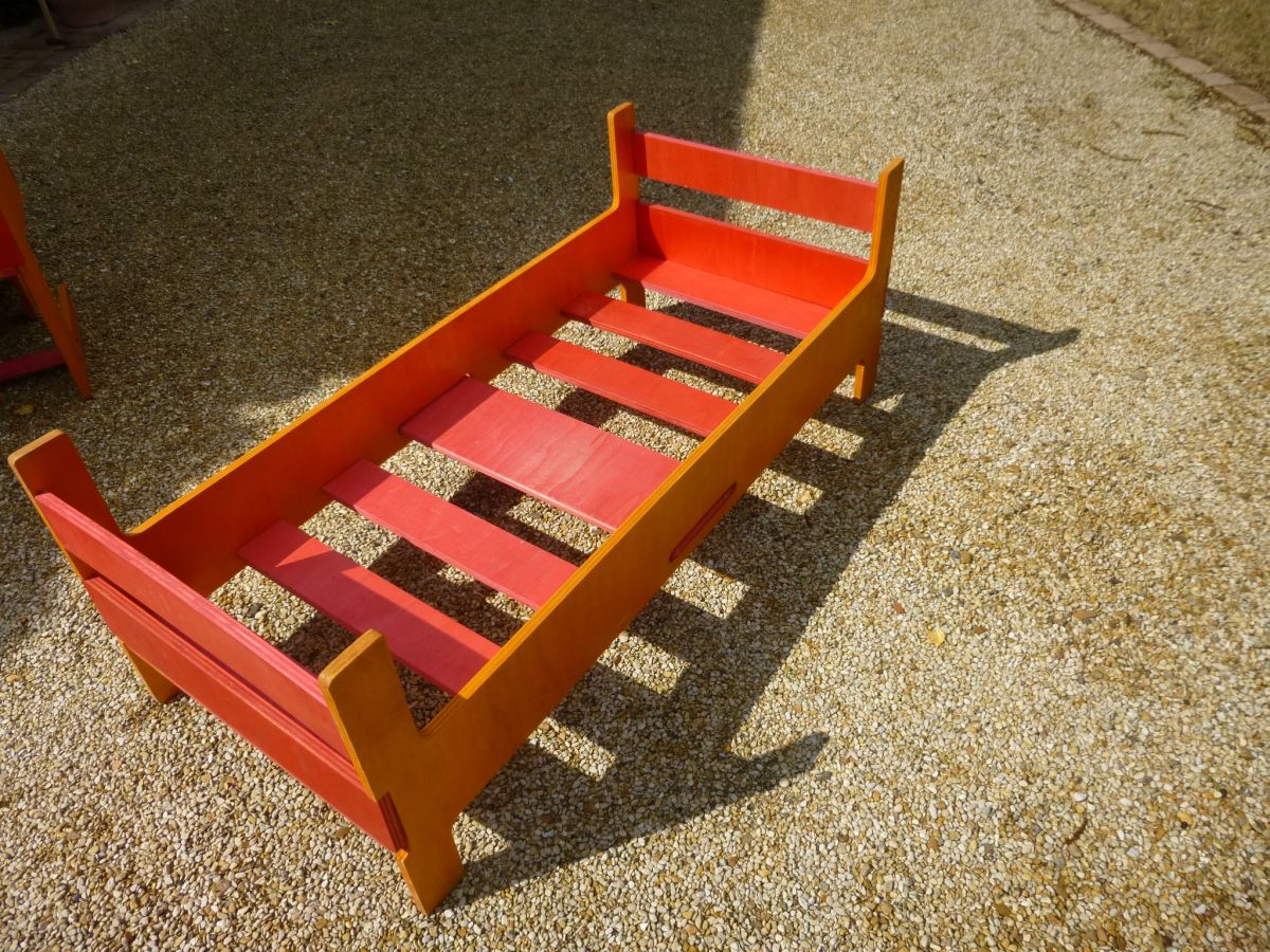 Ce chambre est en contreplaqué (médium) de 18mm d'épaisseur teinté en orangé et rouge, l'ensemble des éléments est assemblé par chevilles de bois ce qui rend ce lit démontable ce que je ne conseille pas car c'est un peu galère à assembler. Compte tenu de l'âge et de l'utilisation il comporte certains défauts qui n'en affectent pas la solidité. La teinte rouge est passée par endroit mais peu se reteinter et l'on peut constater certains petits "gnons" et gribouillis peu visibles. Le couchage fait 140cm de long et 60cm de large. On trouve facilement des matelas de cette dimension.