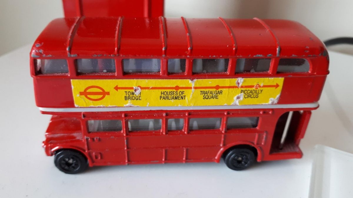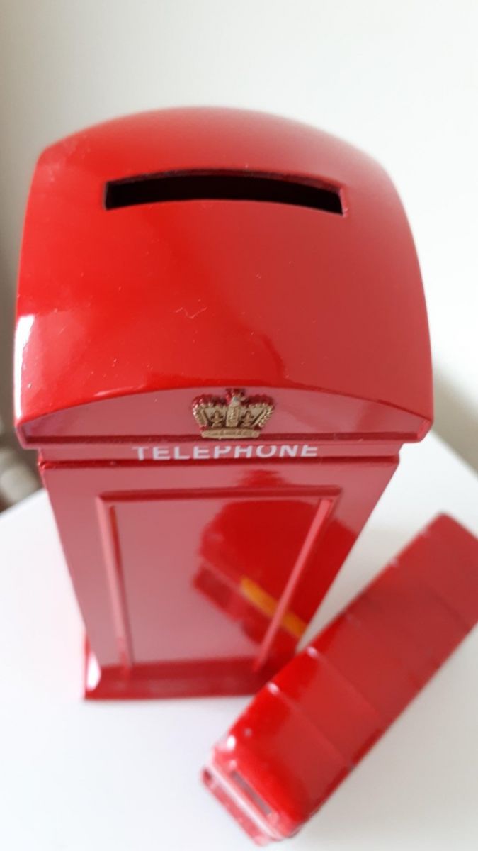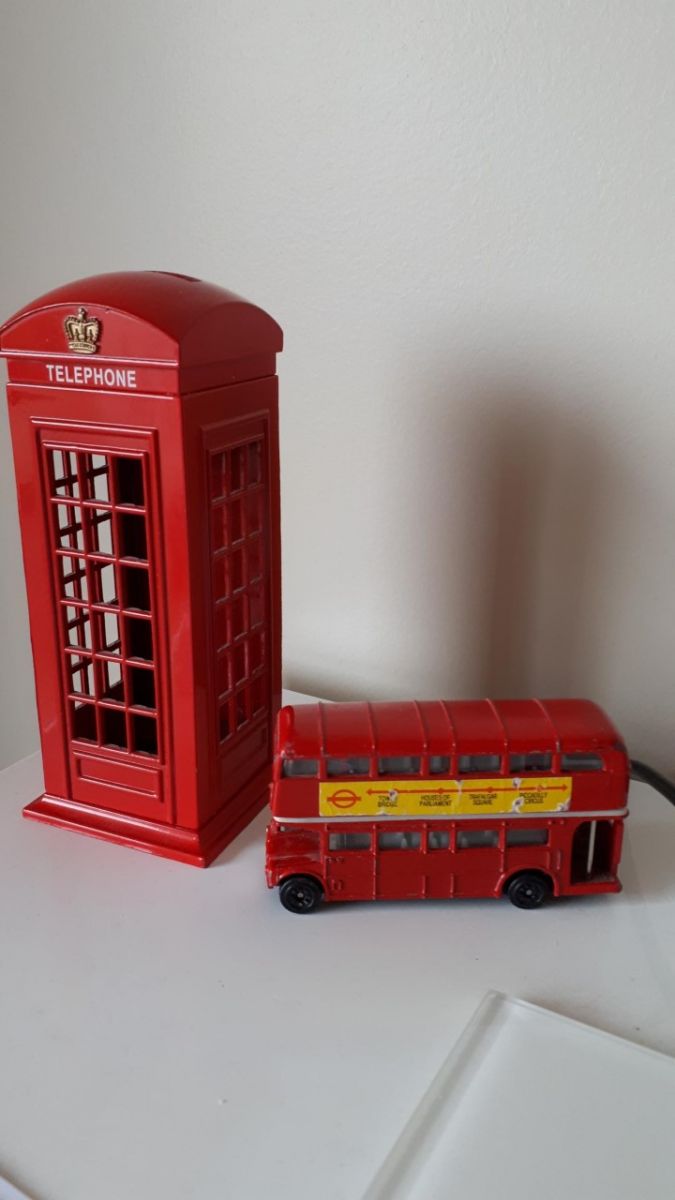 Lot de 2 articles, une tirelire en forme de cabine Londonienne et un petit bus typique de Londres dim : 9x5 cm.