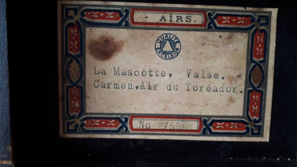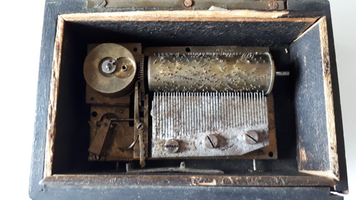 Boîte à musique ancienne mécanique. La manette est cassée. On peut tout de même passer les airs en actionnant avec le doigt.
