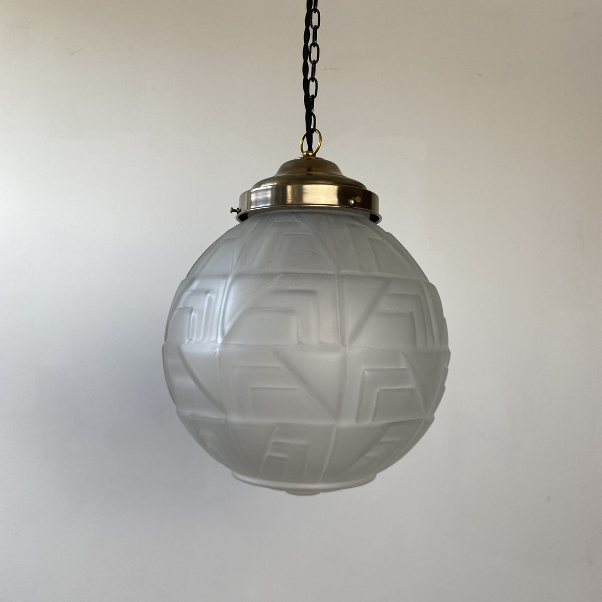 Imposante et ancienne suspension Art-Déco en verre moulé dépoli. Lumière douce.