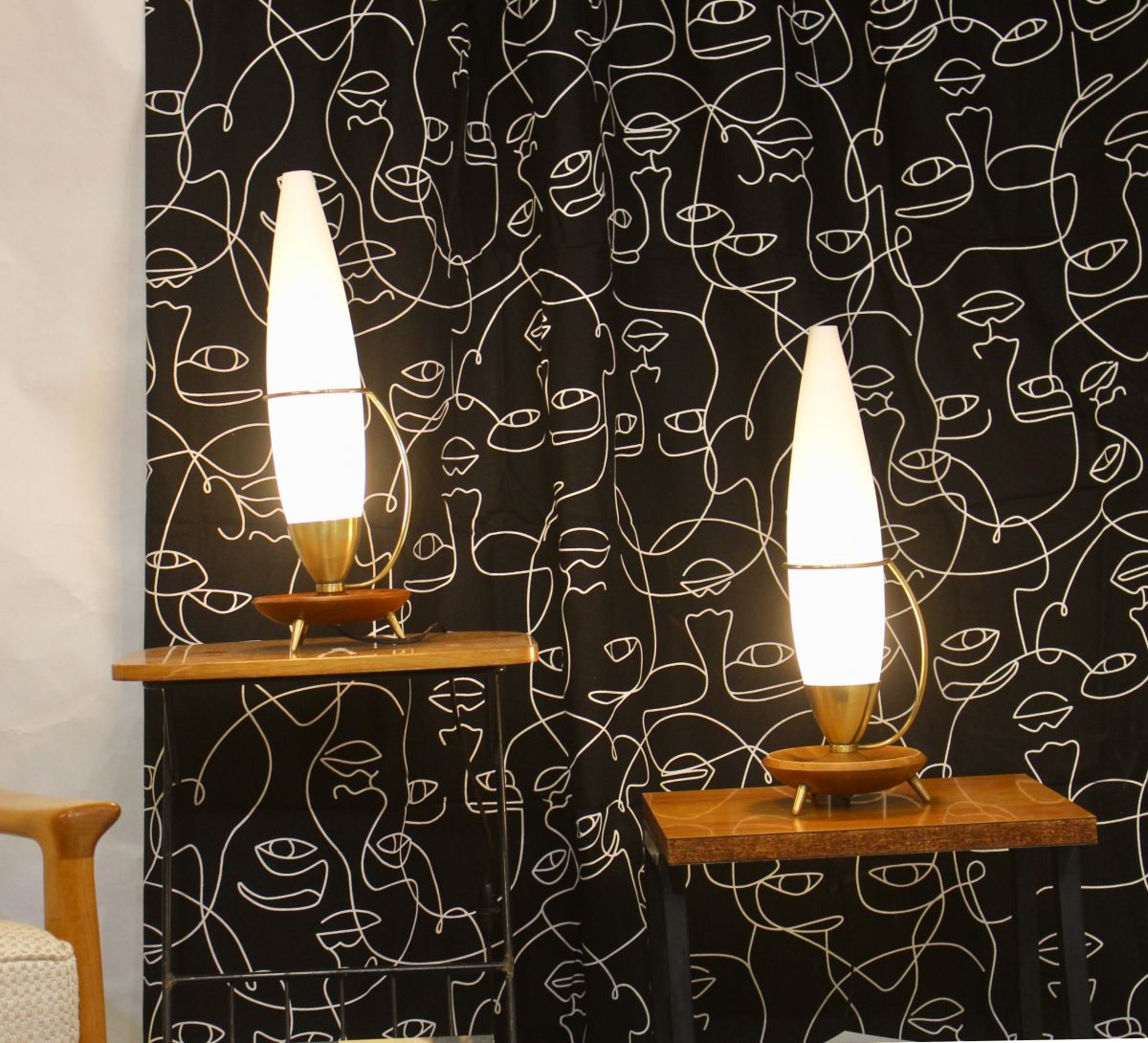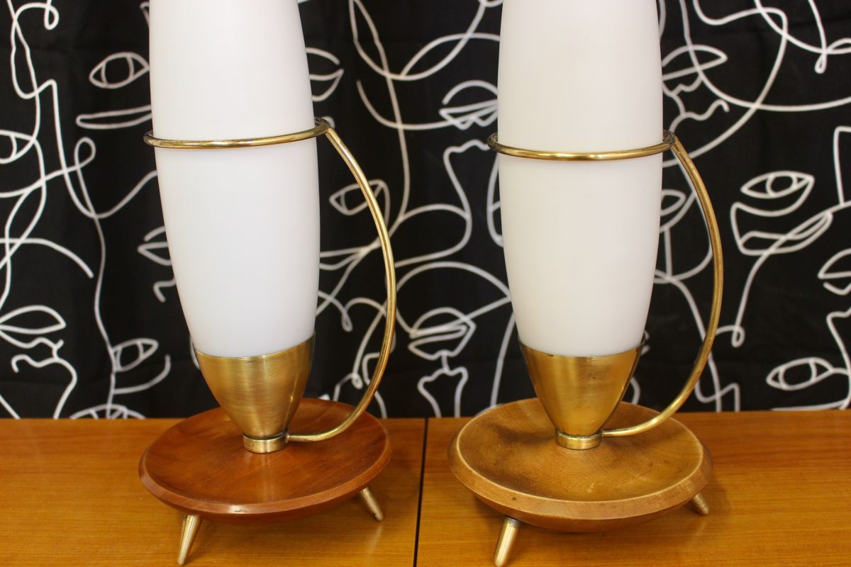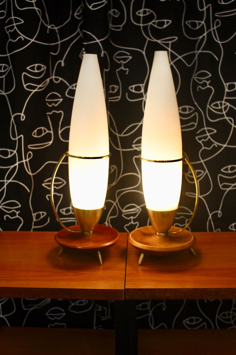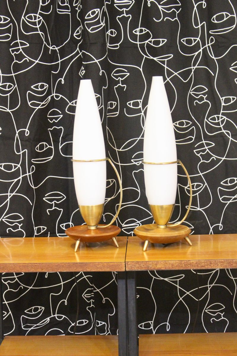 Paire de lampe en teck pied, laiton verre en opaline dépoli années 60 Elle est en très bonne état.