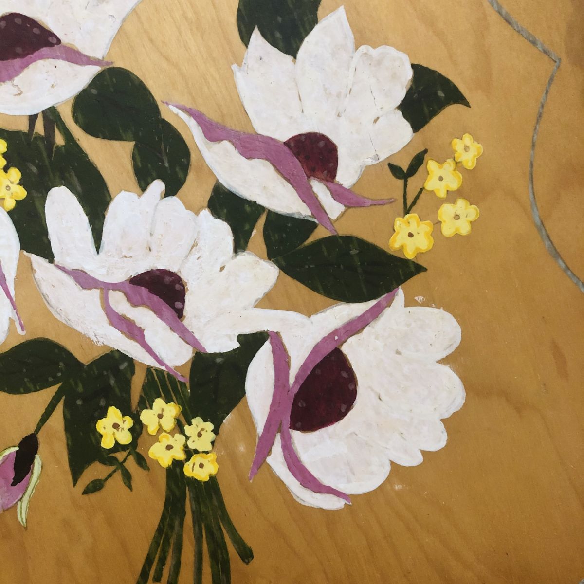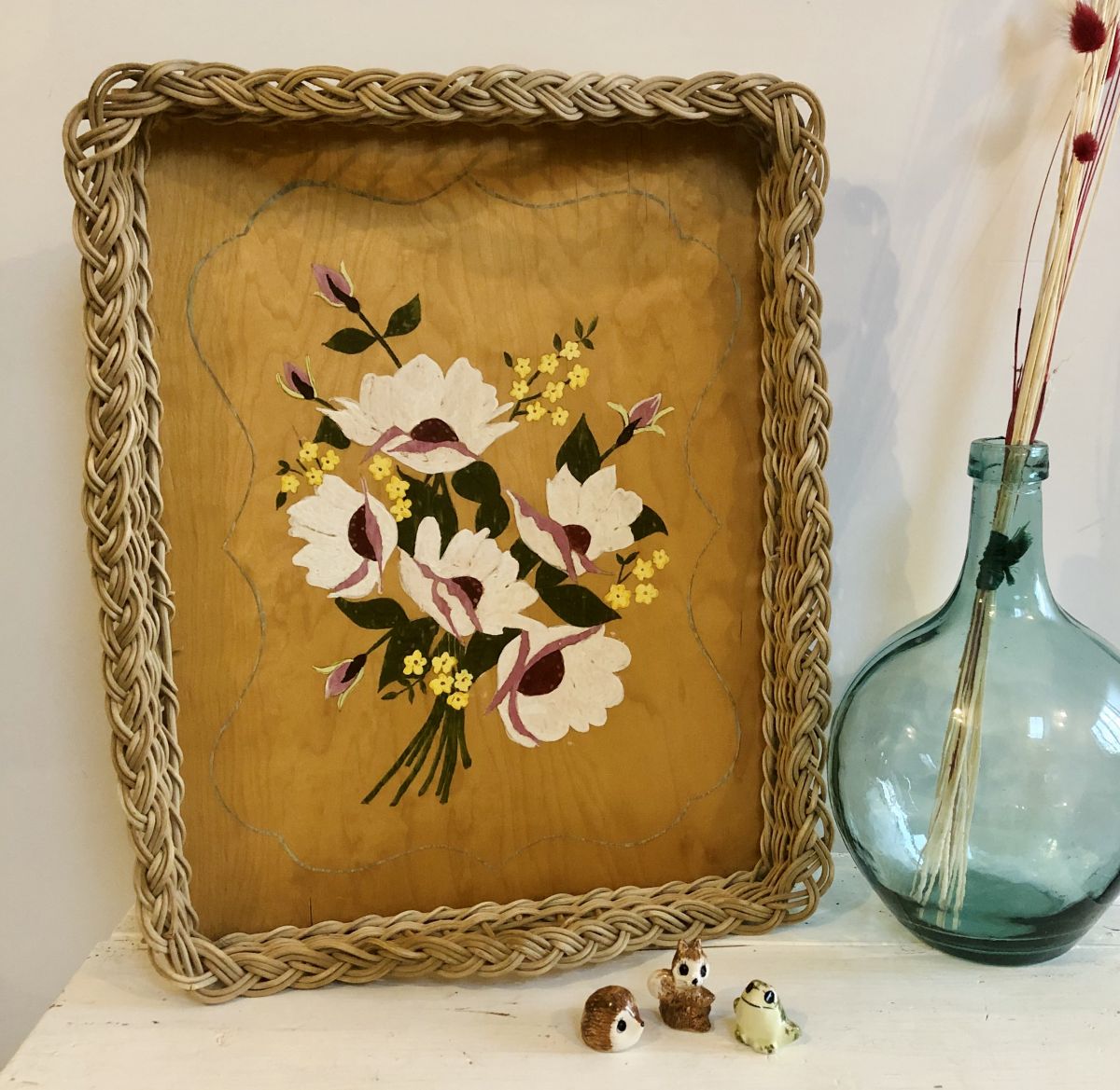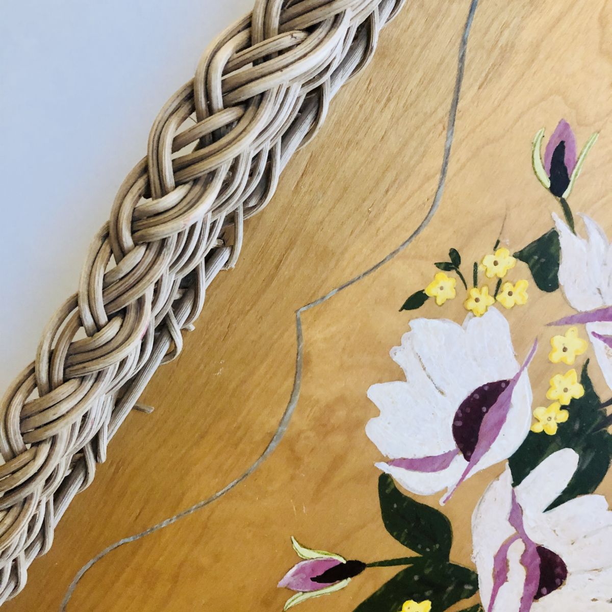 Joli plateau peint, tour et anses en osier, années 70-80.