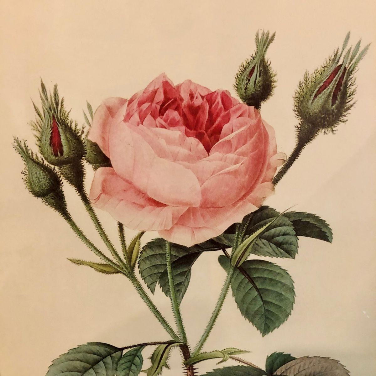 Très jolie reproduction PJ Redouté, Rosa Muscosa, dans son cadre en bois.