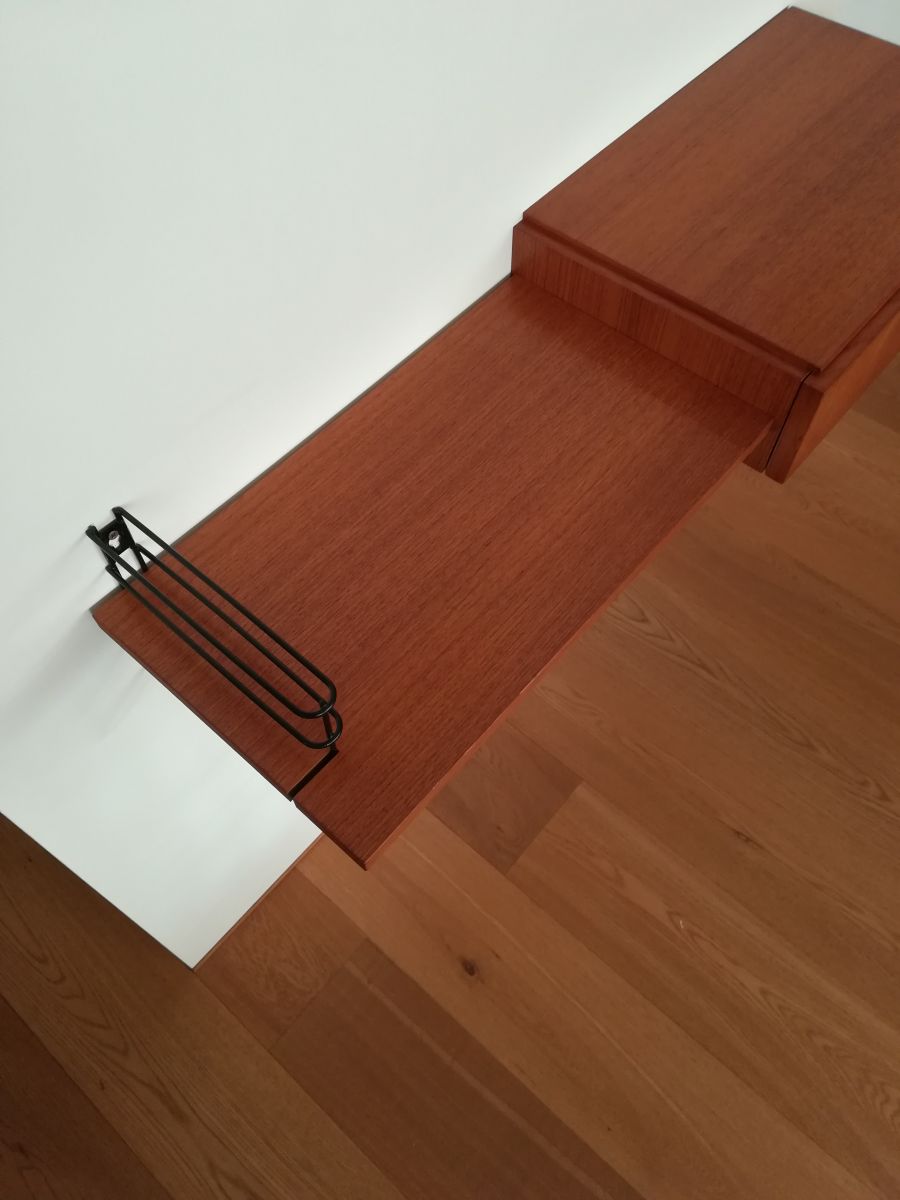 Un bloc tiroir et une tablette en placage teck, reposant à une extrémité sur une section d'échelle Tomado.