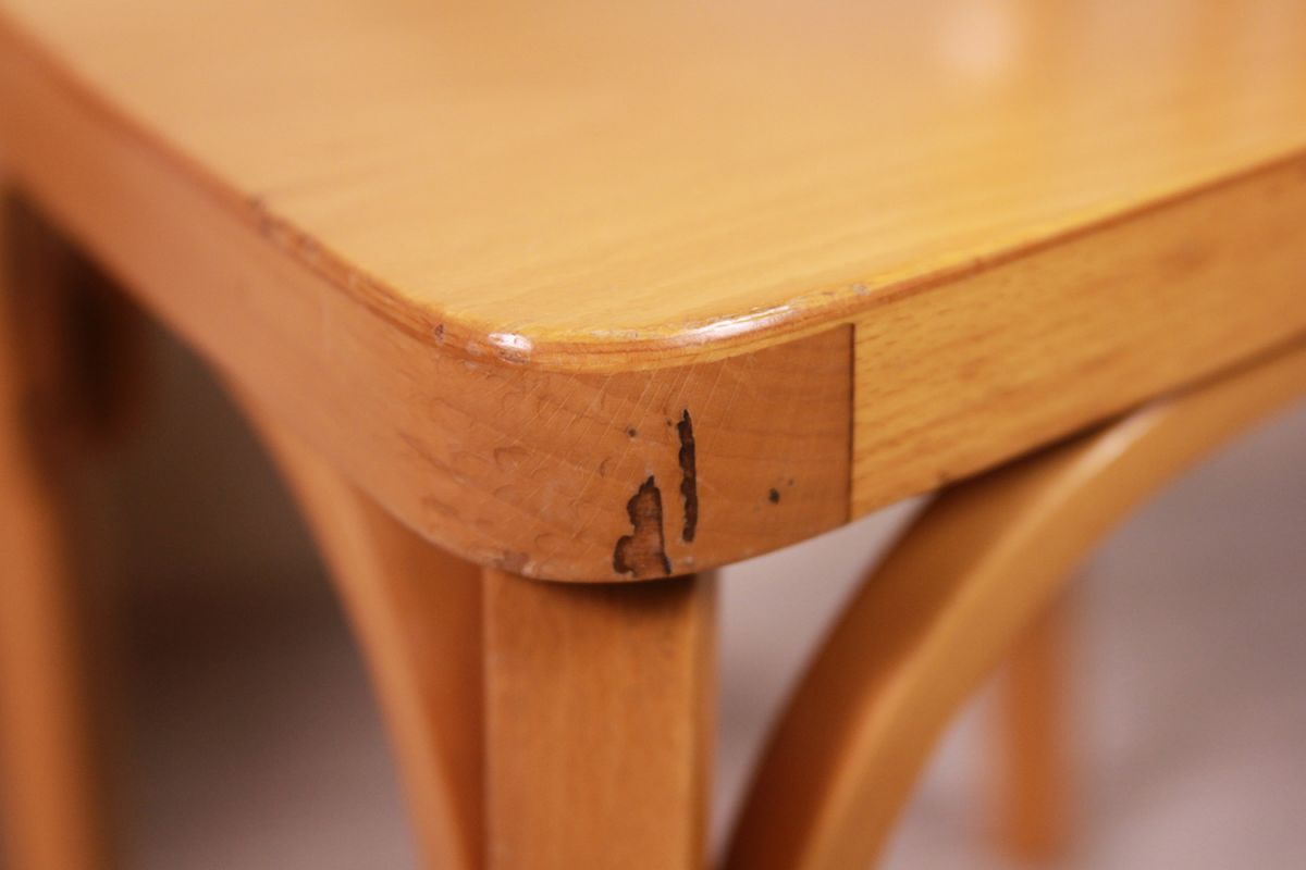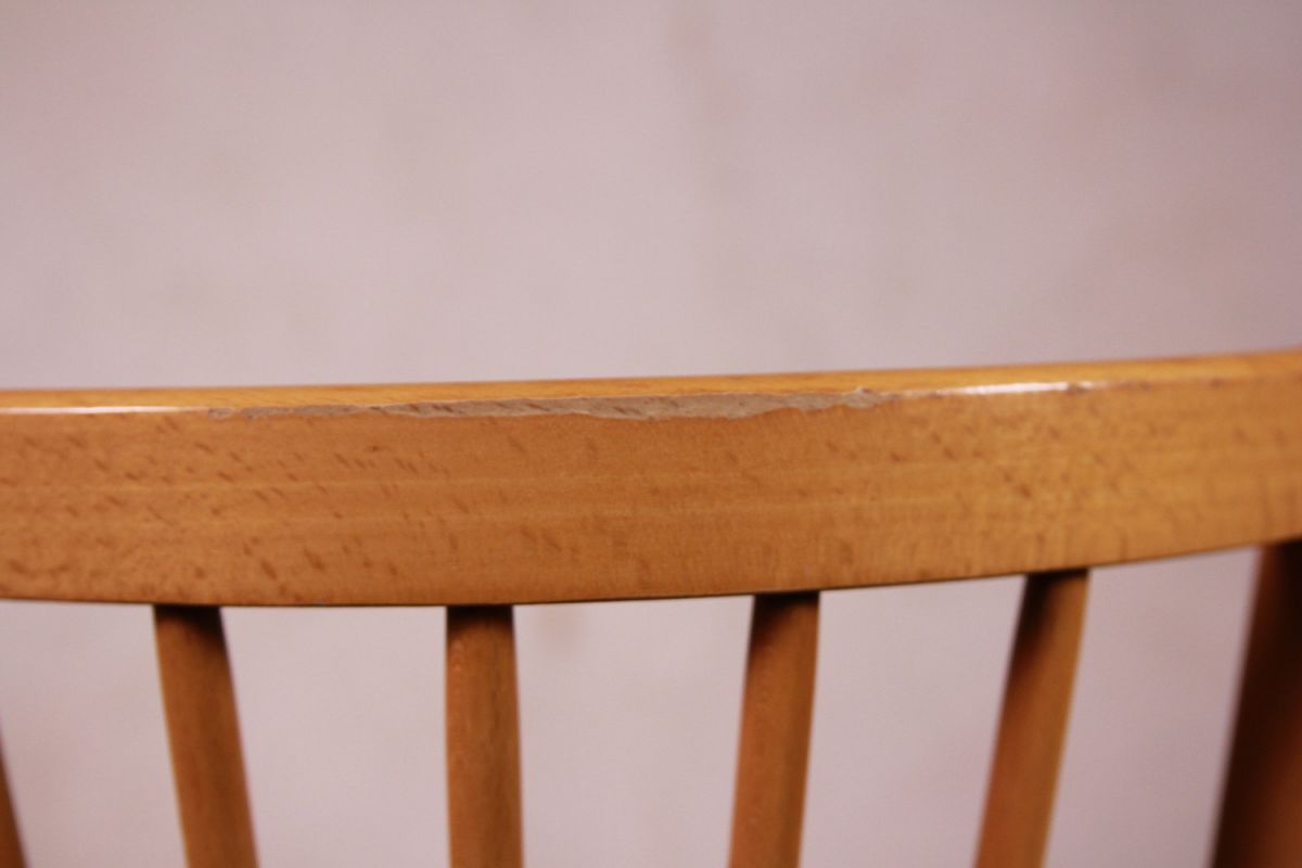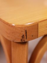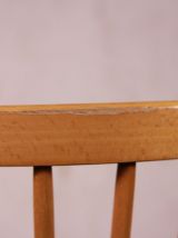 Chaise bistrot baumann style fannett de tapiovaara. Lignes épurées, 4 barreaux centraux. Pieds arrières biseautés. En très bon état, en hêtre clair vernis. Traces d’usures du temps, voir photos. Légère et robuste. Tamponnée baumann. Patins sous les pieds laissés, peuvent être ôtés. Hauteur assise 46, 5cm.