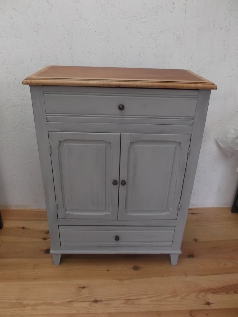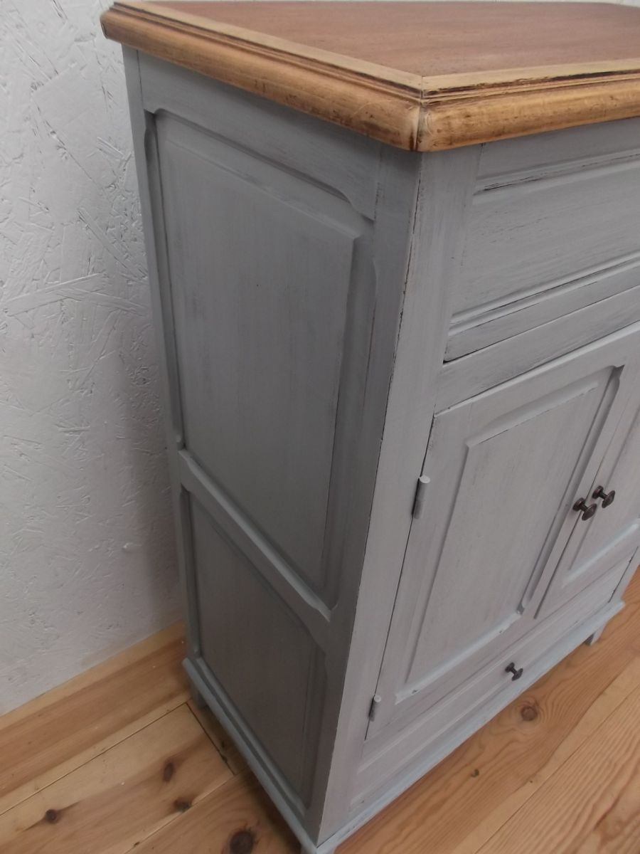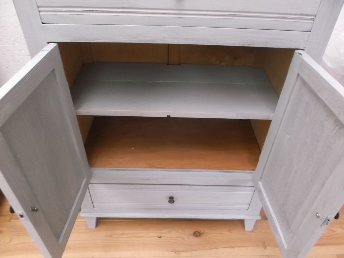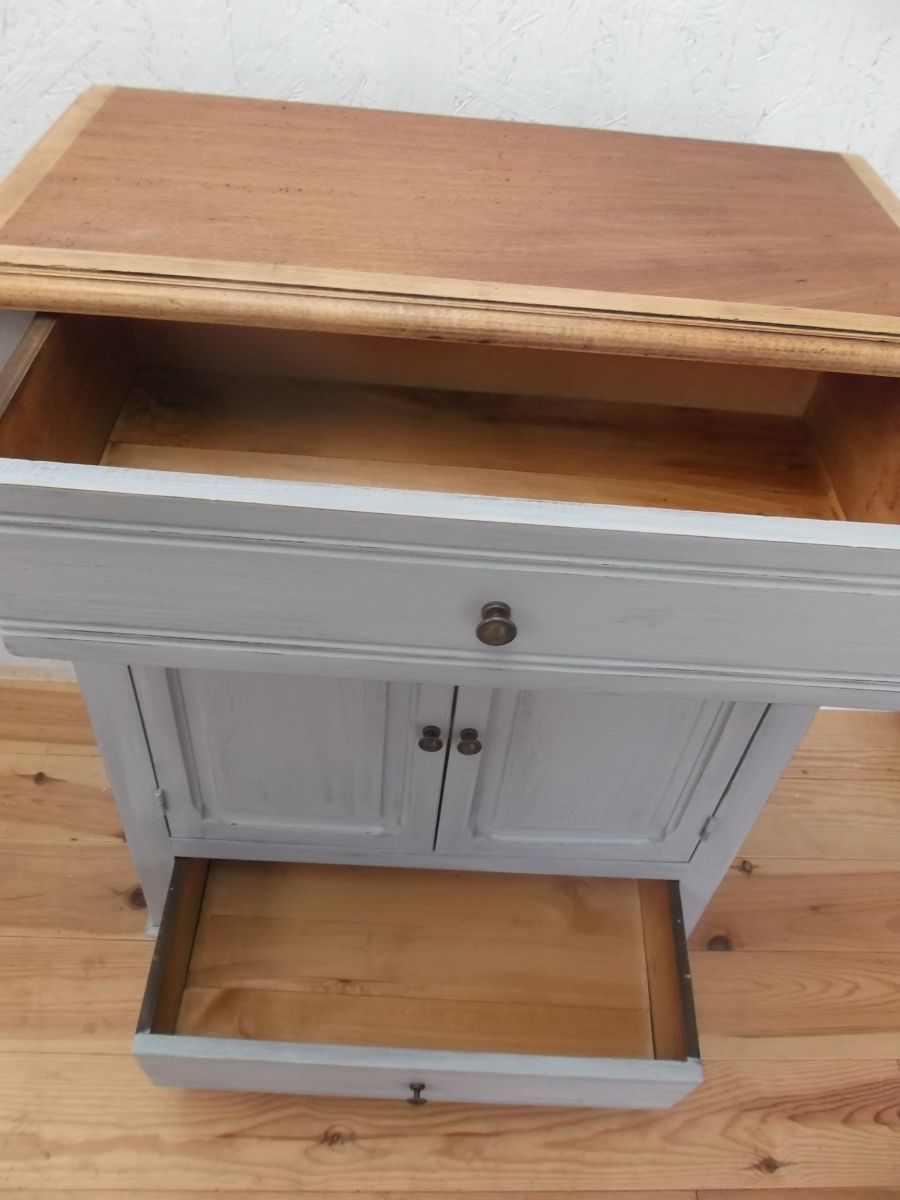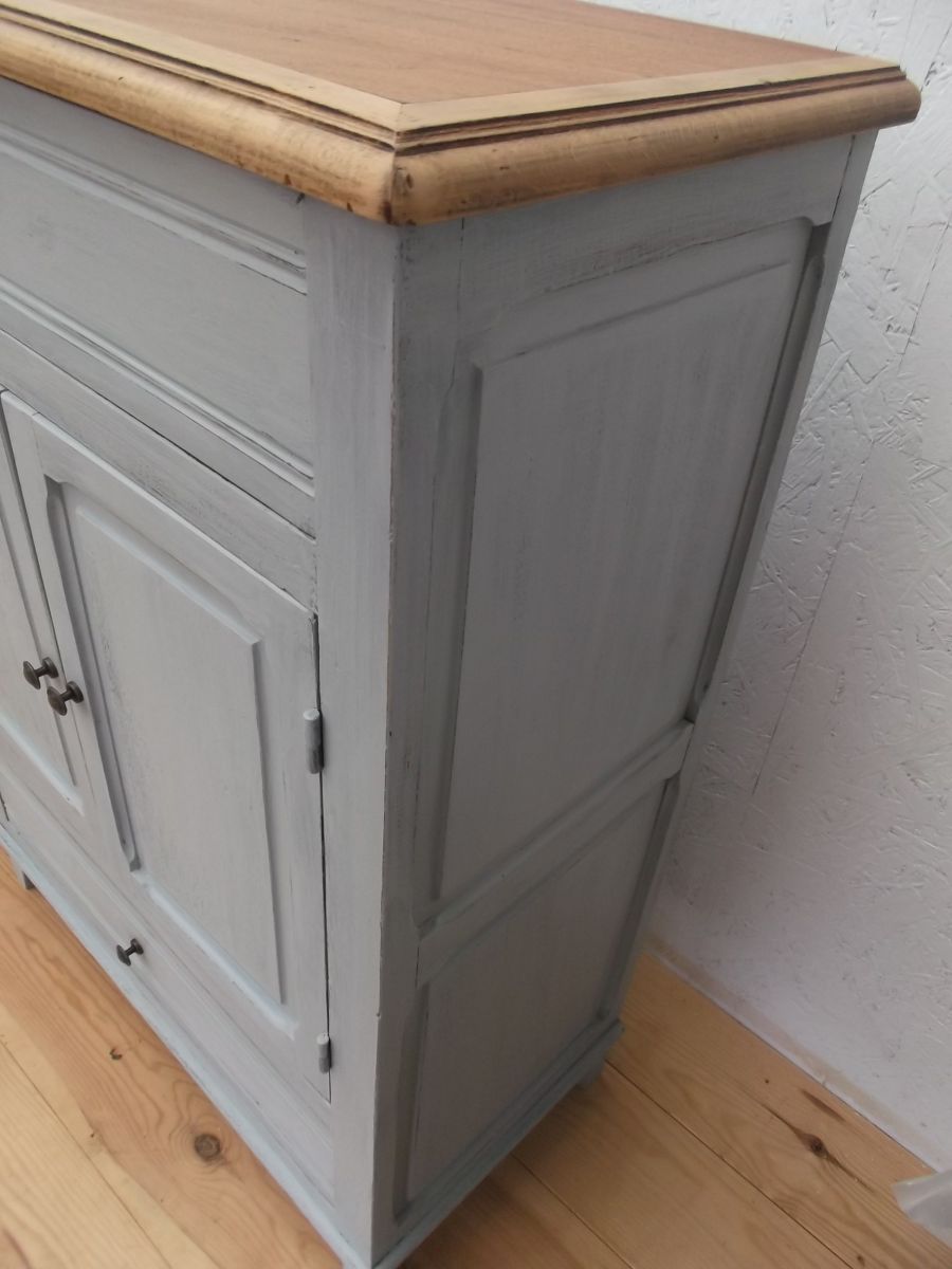 Buffet, style parisien, en hêtre massif, de couleur gris clair, usé et vielli, plateau, brut verni, tiroirs propres, coulissent parfaitement.