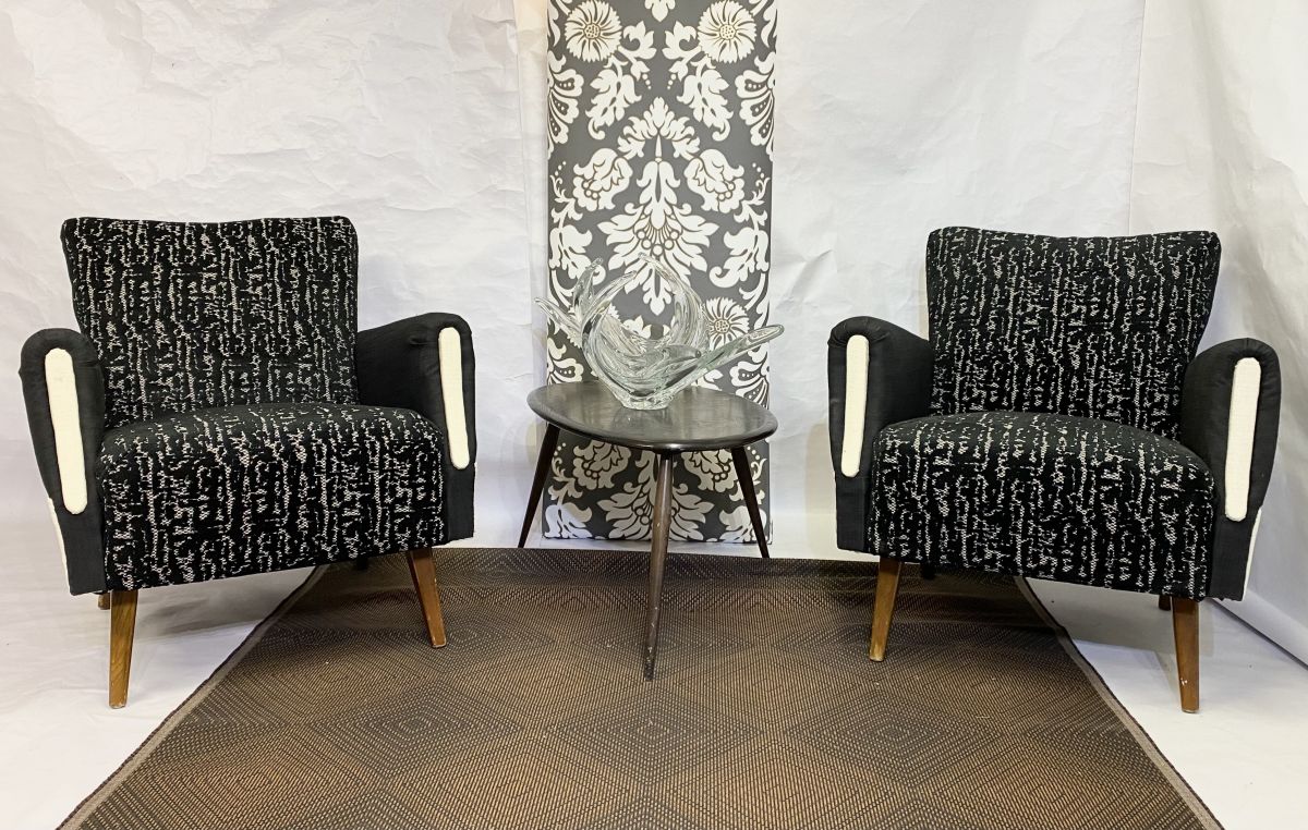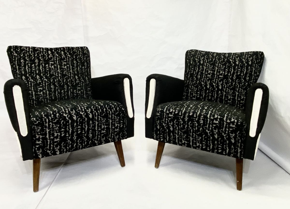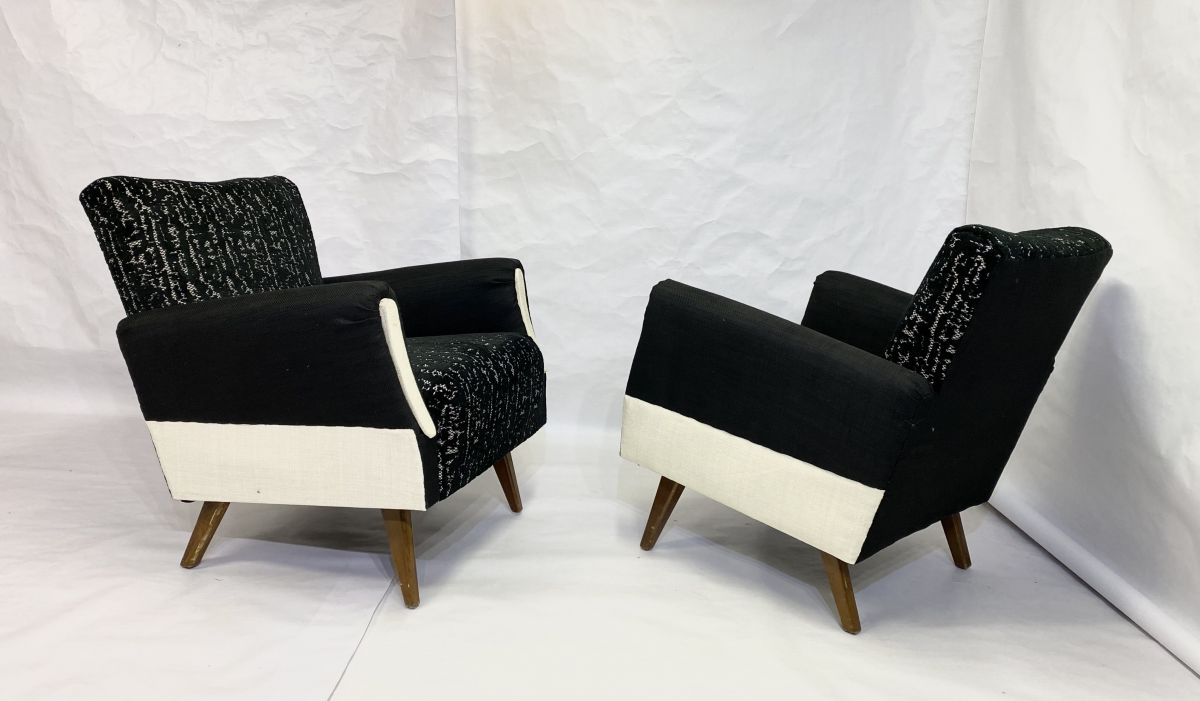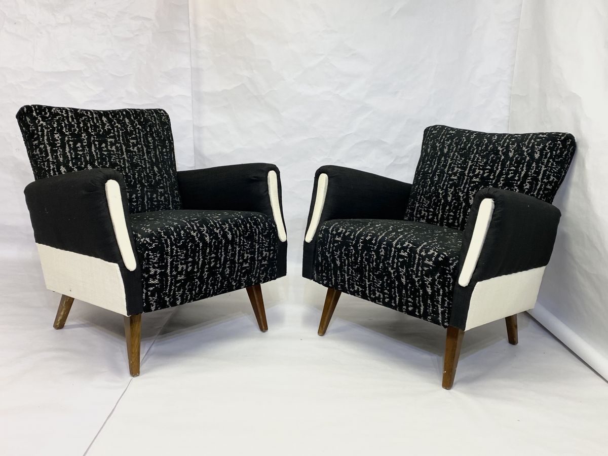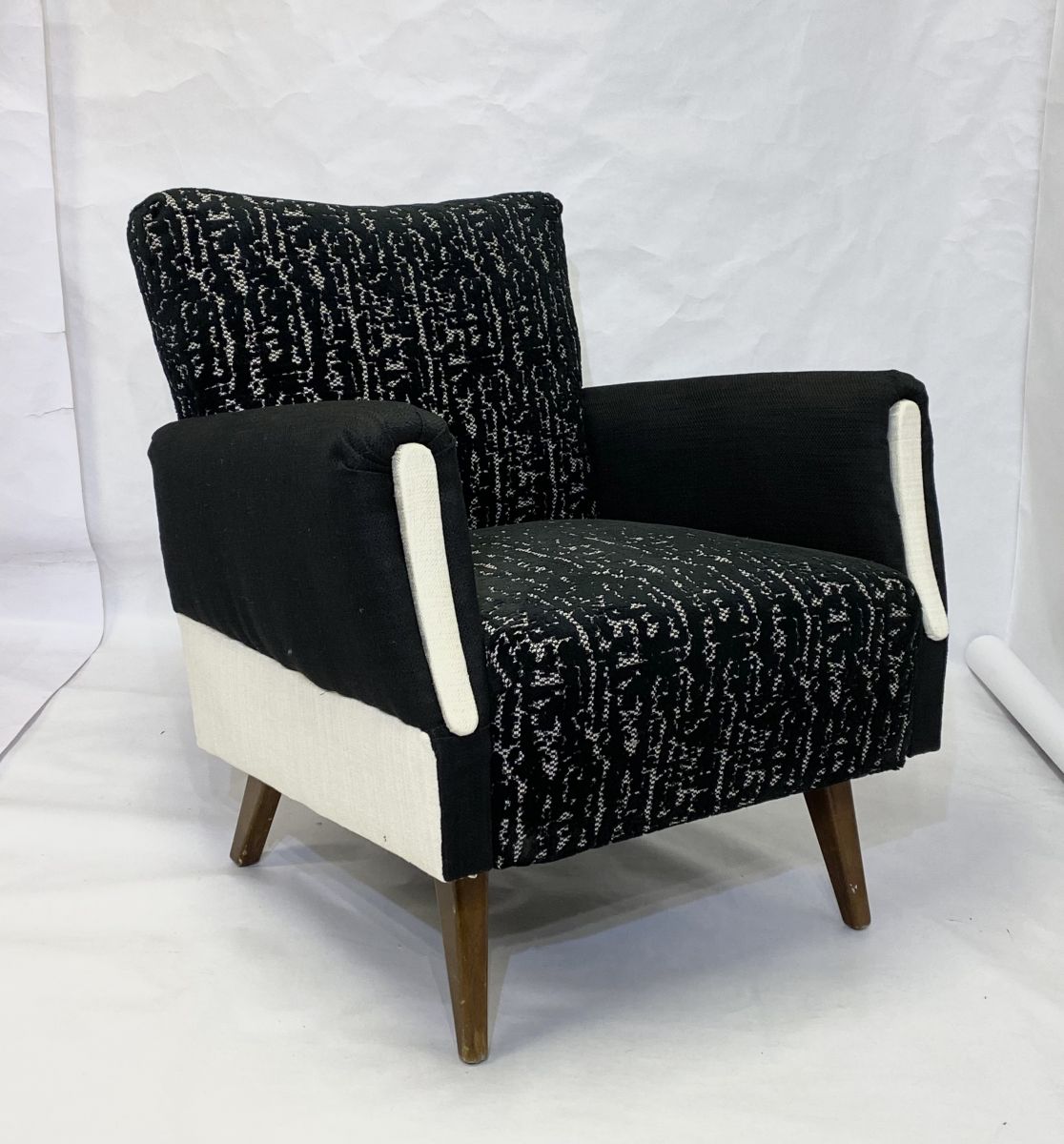 Fauteuils d’origine allemande des années 60. Magnifique forme cubique de ce modèle compact et enveloppant. Légèreté de l'ensemble assuré par les pieds obliques assez haut. Réfection totale incluant: changement de garniture et de ressorts. Tissu jacquard assise et dossier, accoudoir tissu uni texturé antitache noir et blanc.