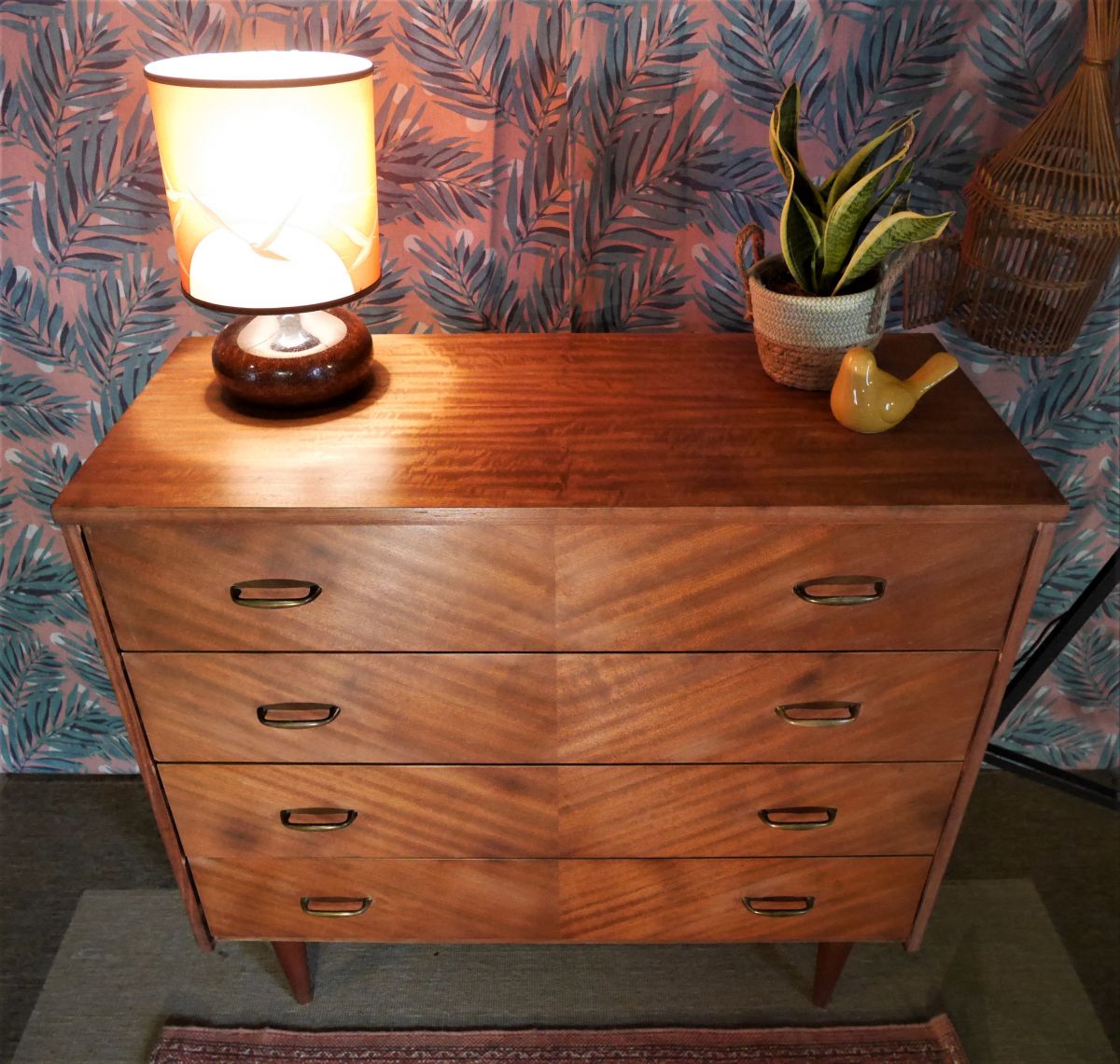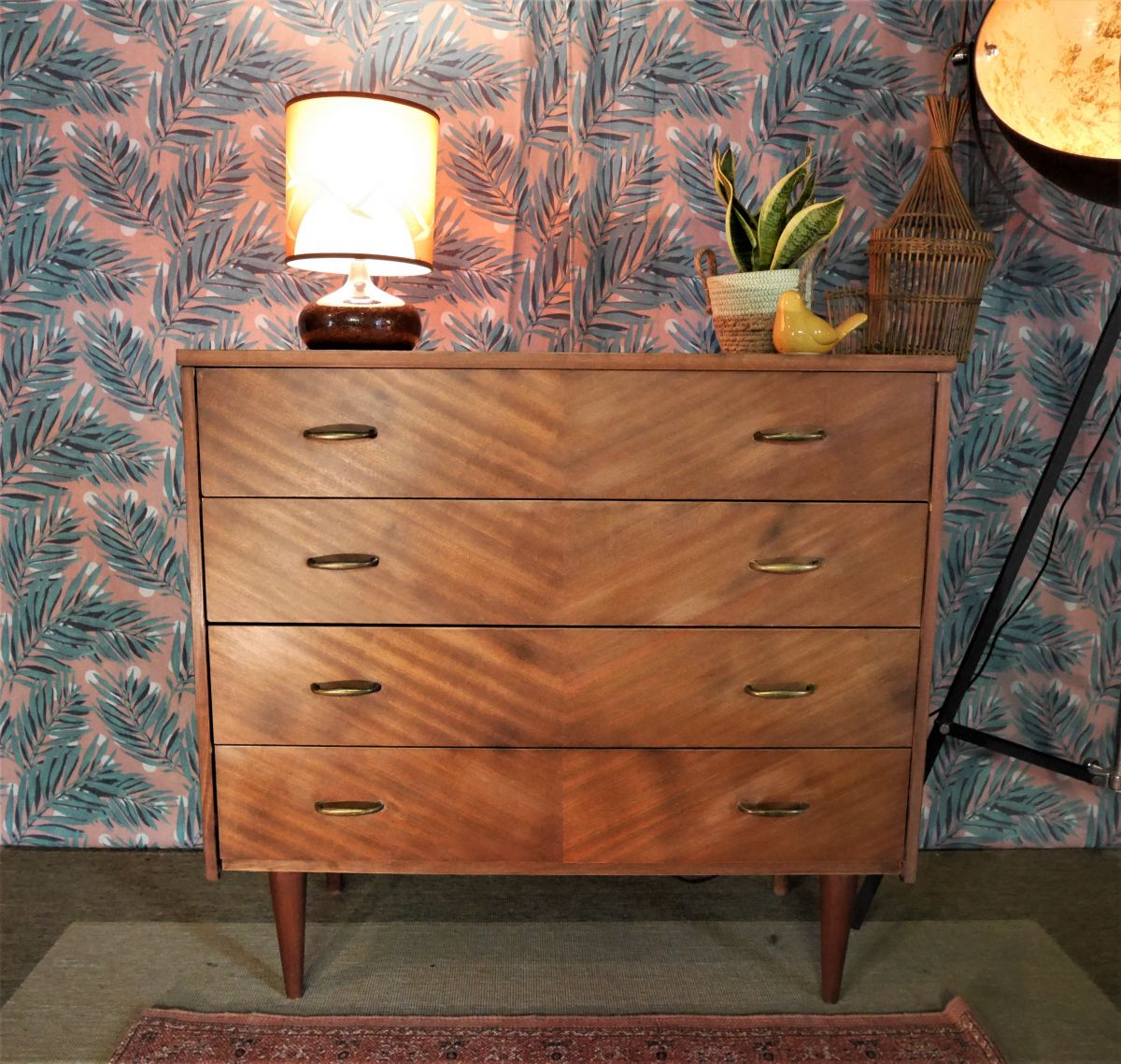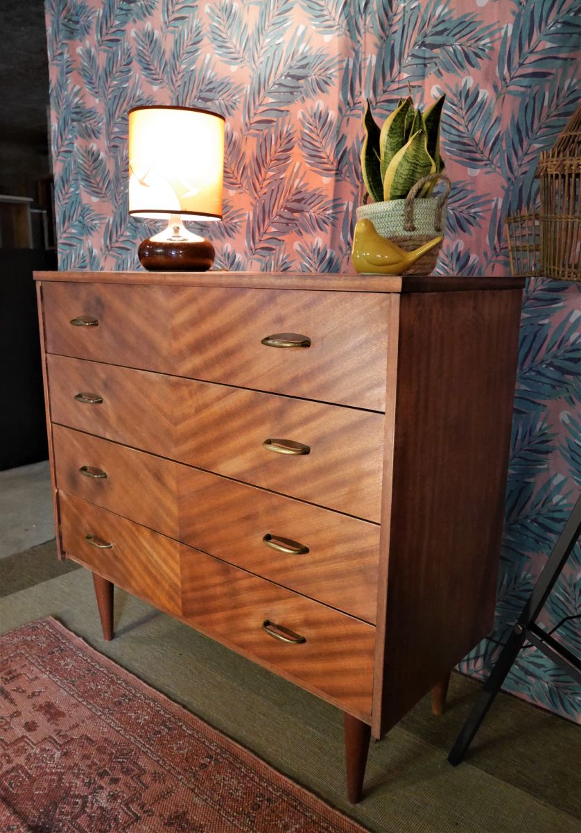Belle commode vintage à la couleur marron (placage en teck), aux pieds compas et aux lignes scandinaves.