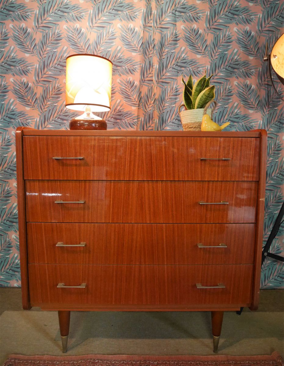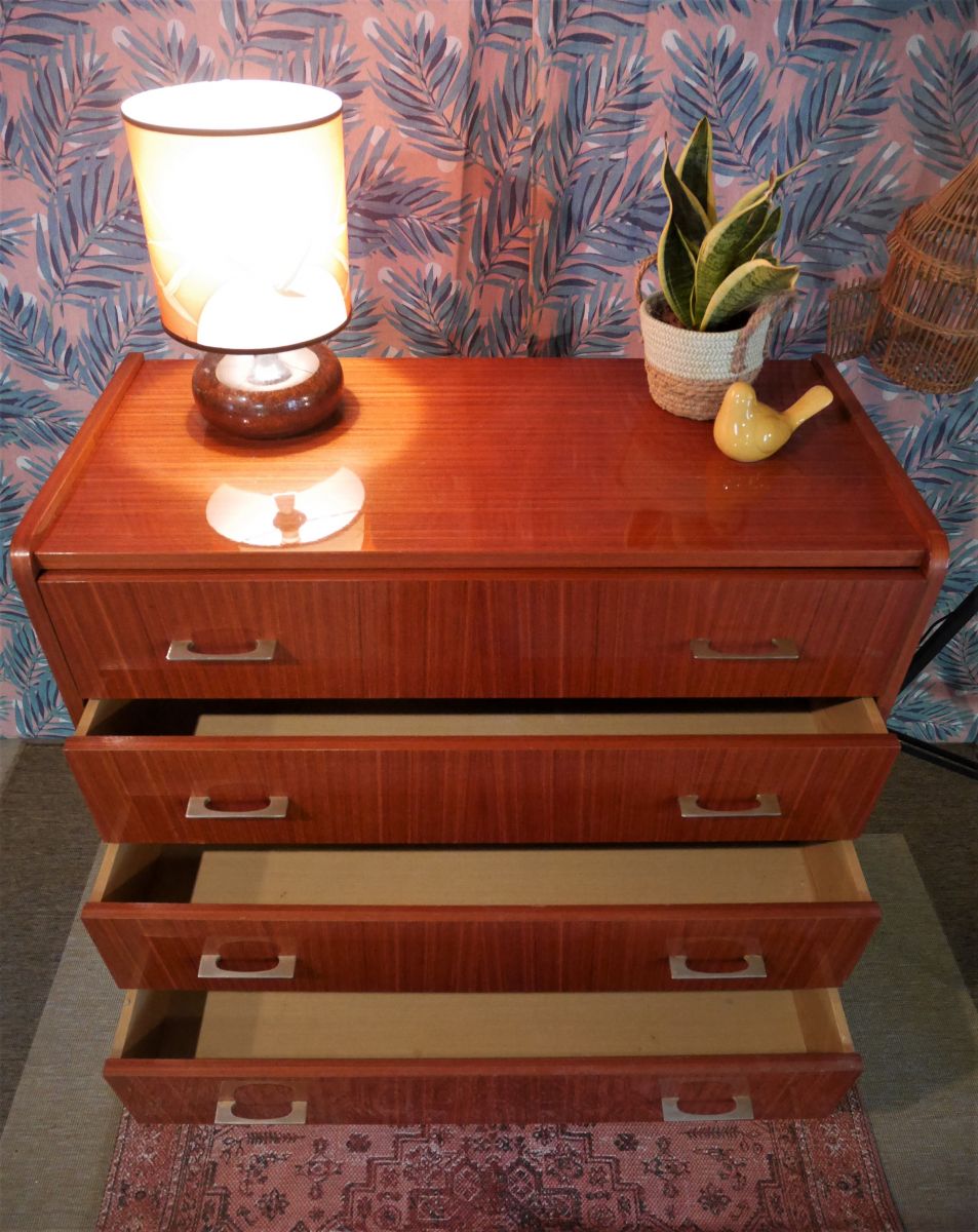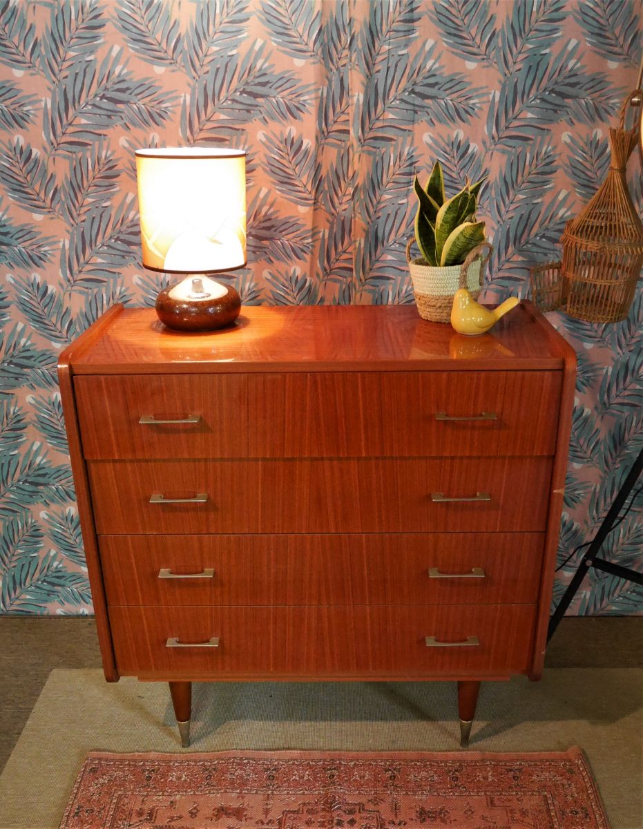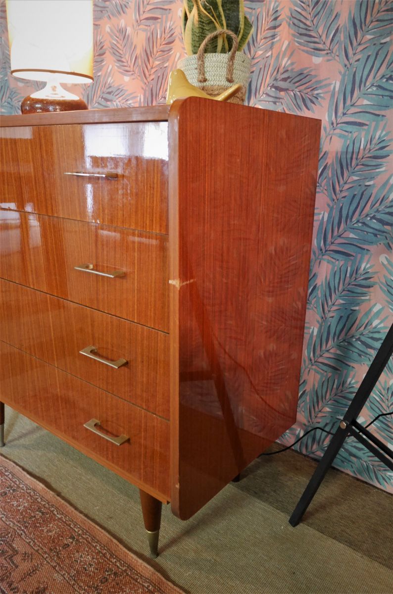 Belle commode vintage à la couleur rouge (placage en teck), aux pieds compas et aux lignes scandinaves.