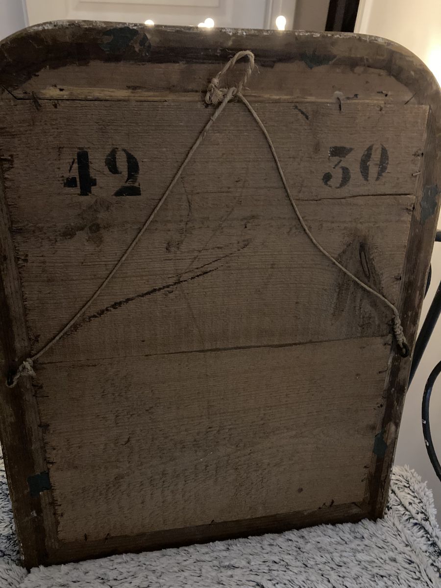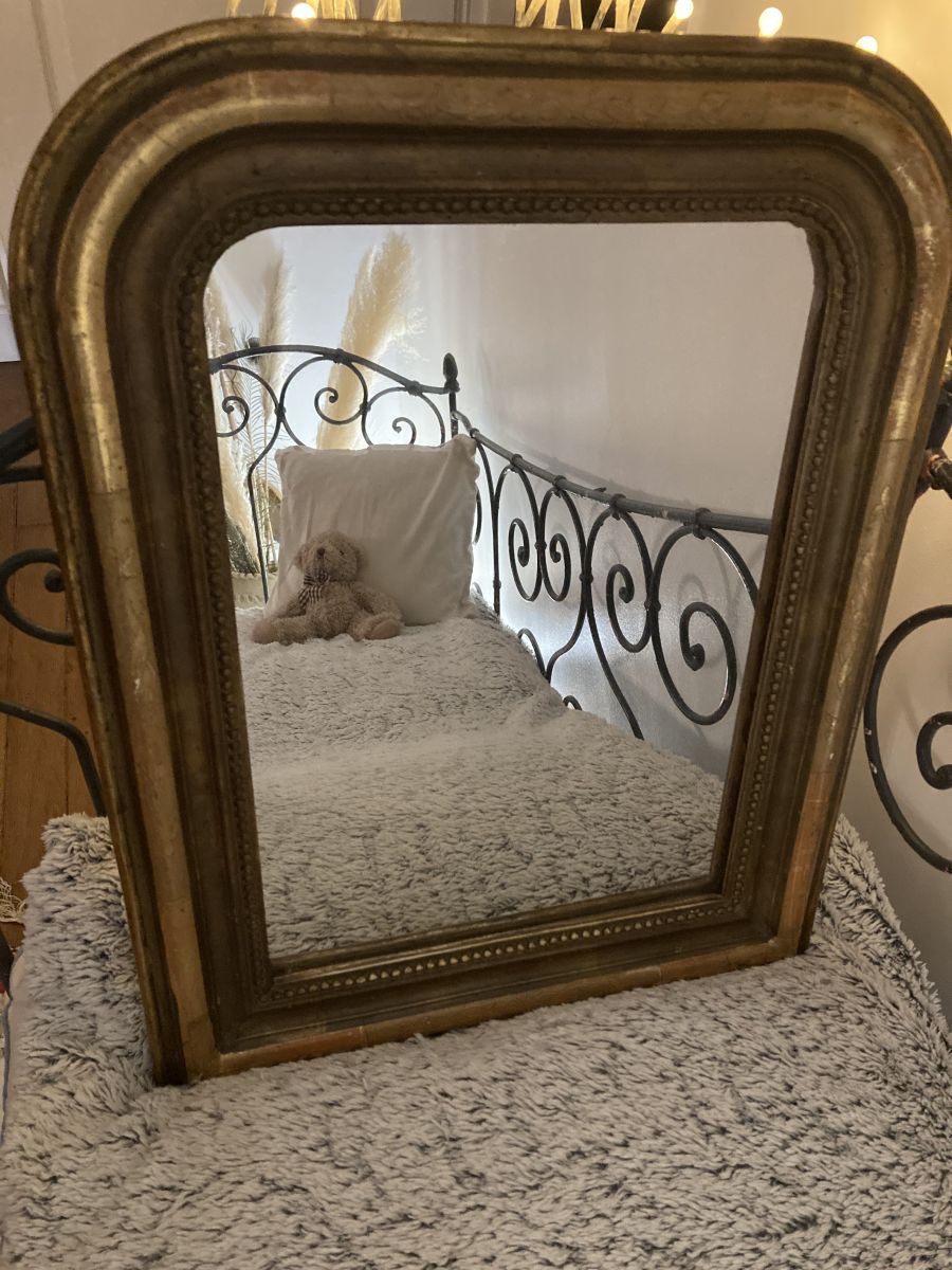 Très beau miroir Louis Philippe en bois mouluré, sculpté et doré, orné d’un filet de perles, gravé de rinceaux fleuris.