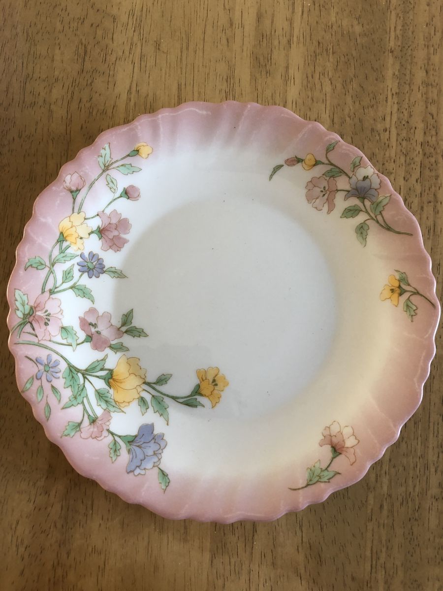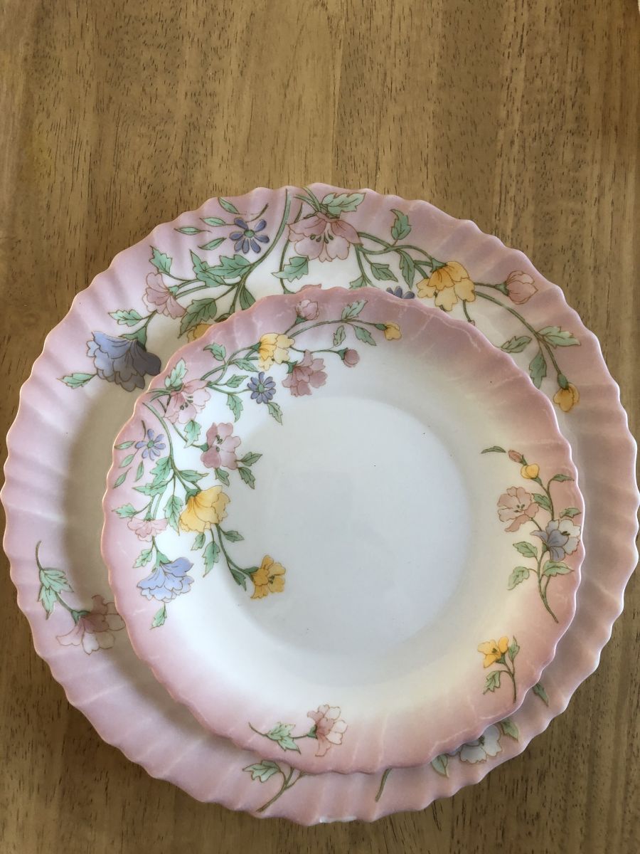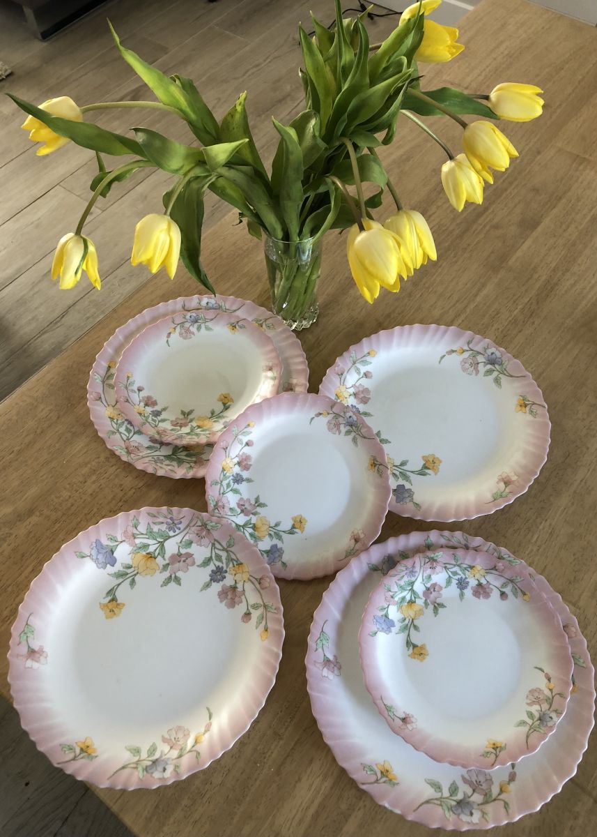 4 assiettes rose Printemps marque Arcopal. Les 4 assiettes creuses ont un diamètre 25 cm, les 4 assiettes dessert ont un diamètre 19 cm