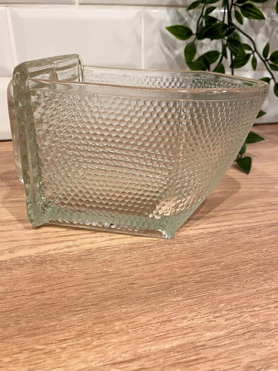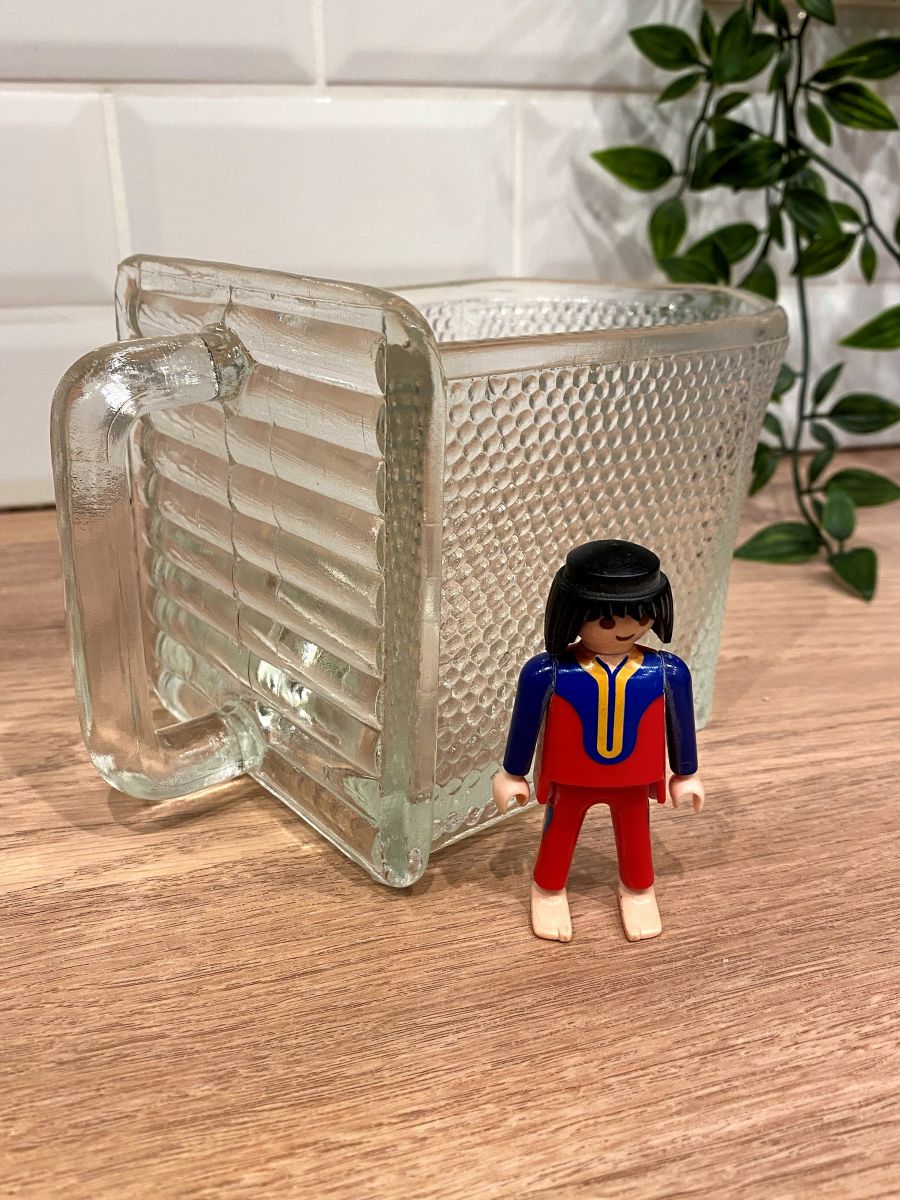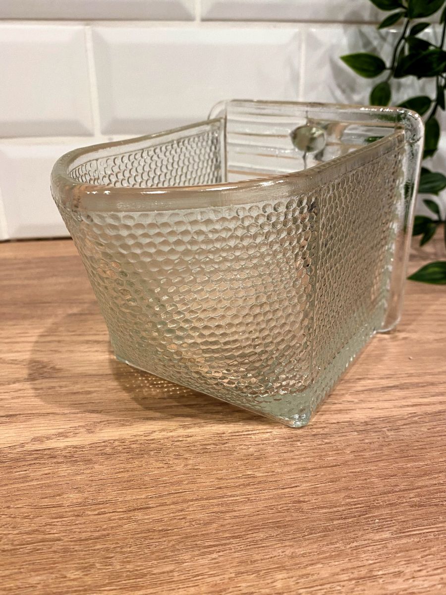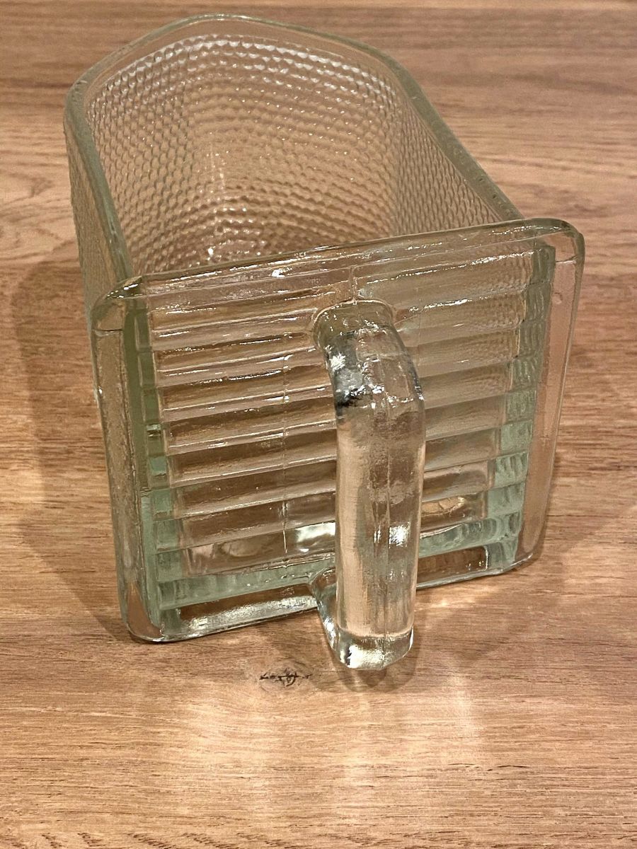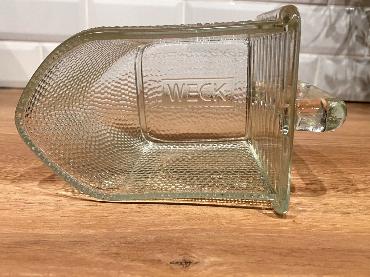 Récipient en verre avec anse de marque Weck. Ces récipients étaient utilisés dans le mobilier des années 50 pour y mettre farine ou sucre. Dimensions : P 18,5 cm avec anse, 15 cm sans. Largeur 11 cm, Hauteur 11 cm