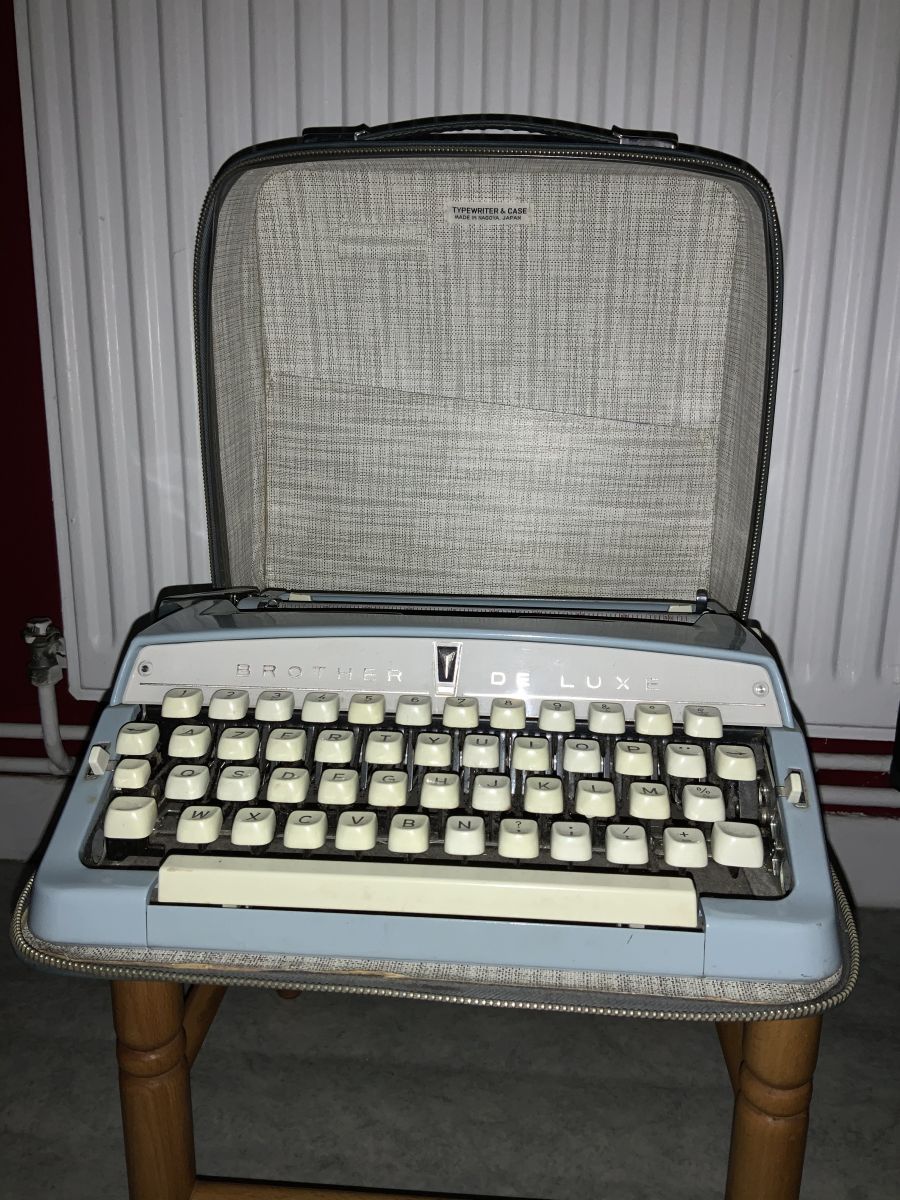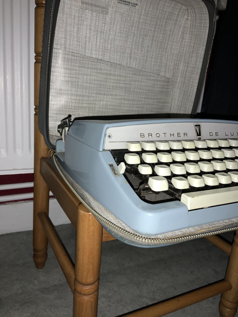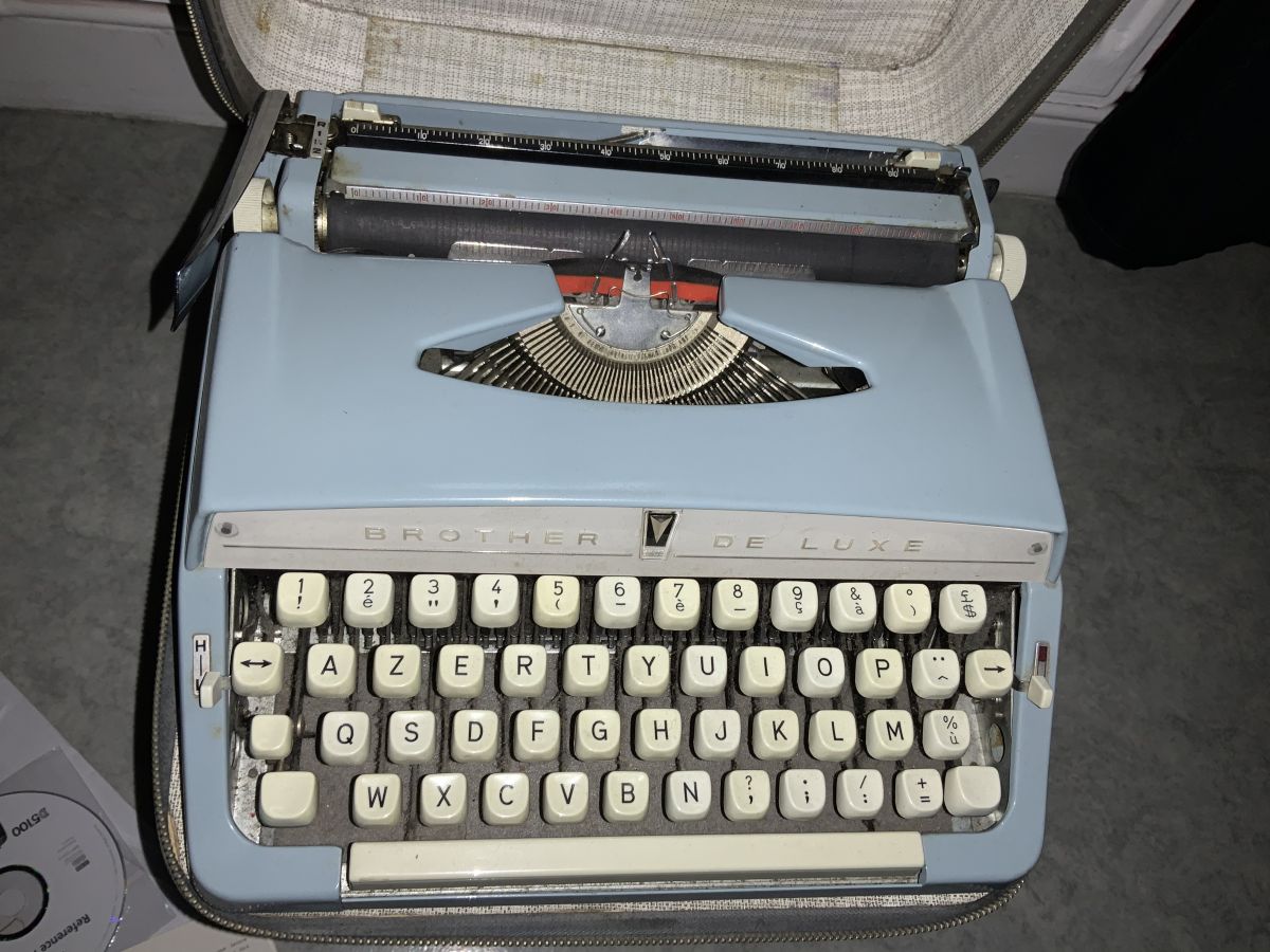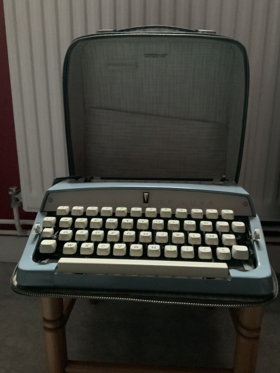 Machine à écrire bleue avec instructions et garantie qui date de 1969 ainsi que sa valise ne semble n'avoir que très peu servie mais fonctionnelle