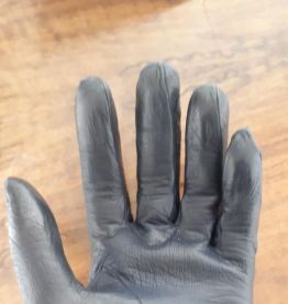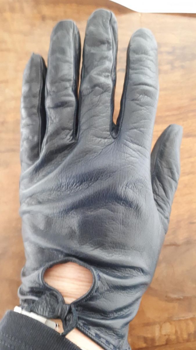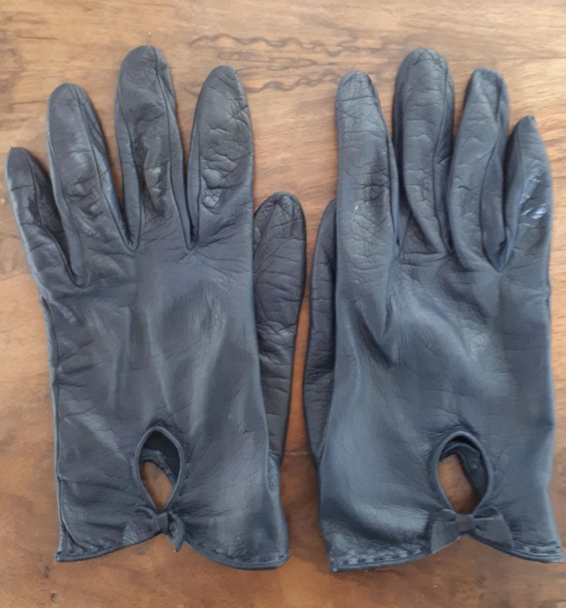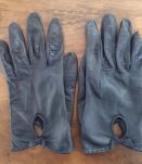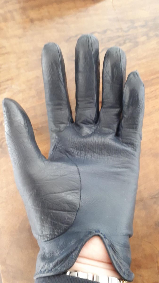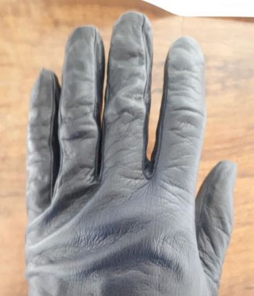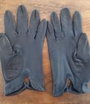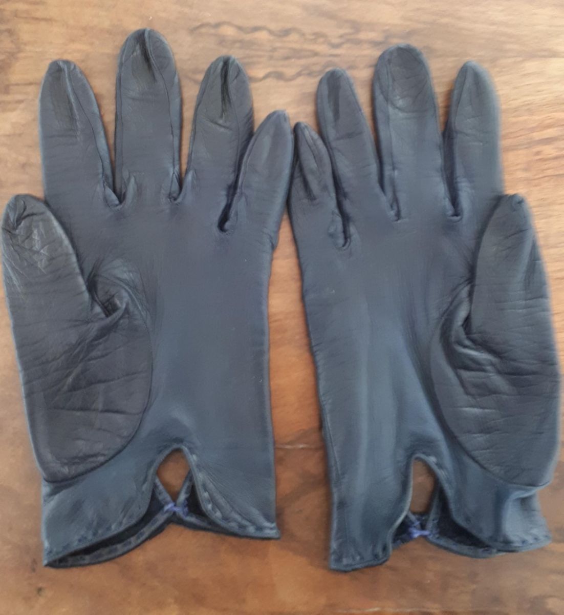 Paire de gant bleu marine en cuir d'agneau. Très souple, cuir très doux. Petit nœud fixe au niveau du poignet. Une taille 7 est inscrite dans le gant.