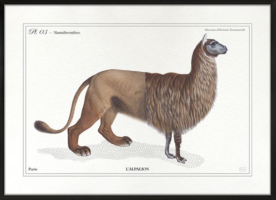 Chimère composée avec 2 anciennes gravures datant de 1850. C’est une manière étonnante et ludique de redécouvrir ces superbes gravures d'époque. Ici, l’alpalion. Pour amateur-rice-s d'illustration hors des sentiers battus ! Le format a5 avec une seule chimère est idéal pour composer un ensemble dynamique de plusieurs cadres. Tirage d'art réalisé en impression pigmentaire de très haute qualité sur papier 300gr. Le résultat est magnifique, d’une grande précision, un rendu identique à une sérigraphie ou l’offset, mat et velouté (c’est la qualité des tirages de galeries d’art). Le tirage sera discrètement signé en bas à droite. Tirage vendu seul sans le cadre (possibilité de l’obtenir encadré). D’autres chimères disponibles. Format A5 = 15 X 21 cm ou A4 = 21 x 30 cm (50€)