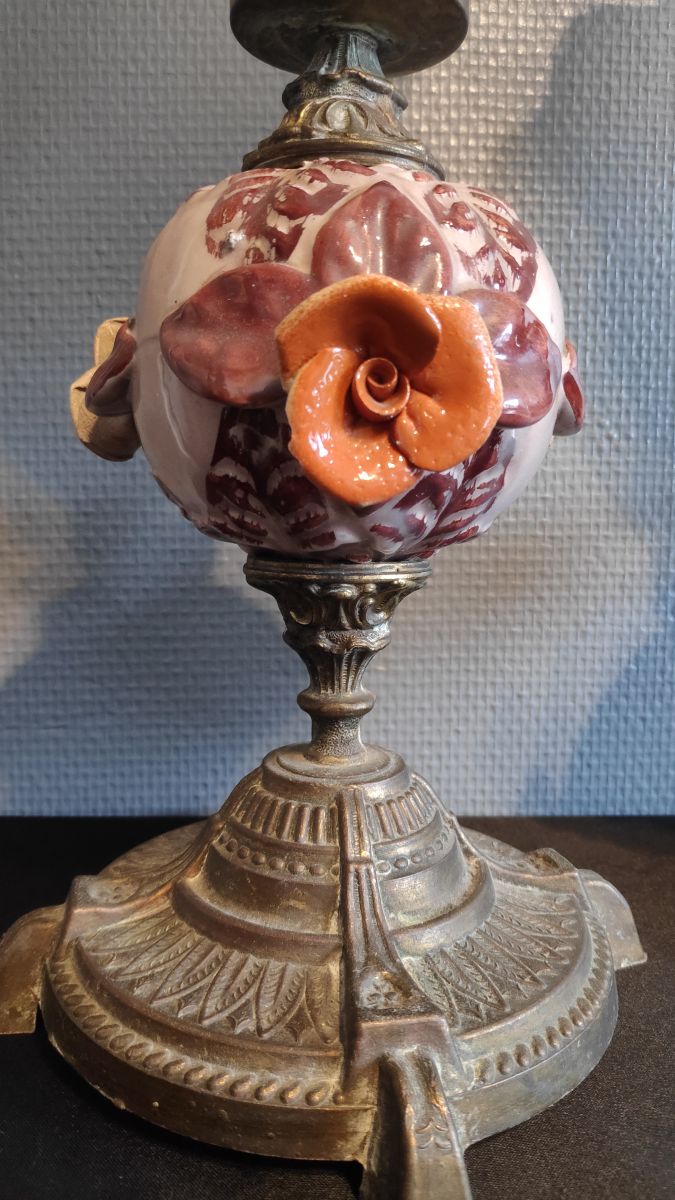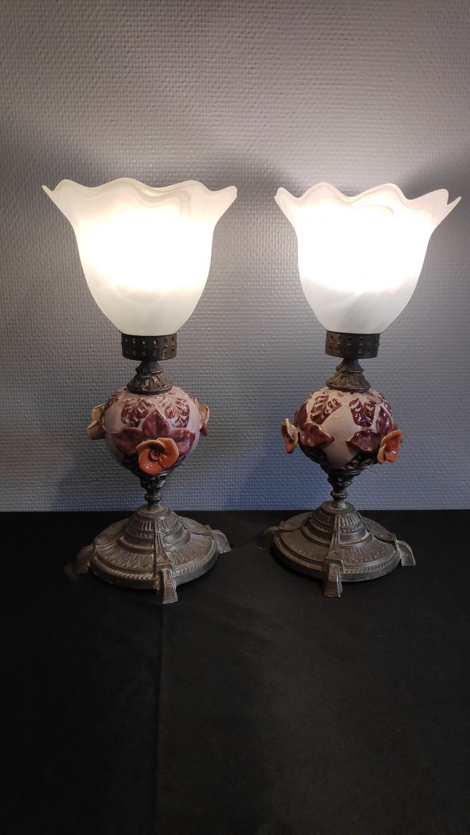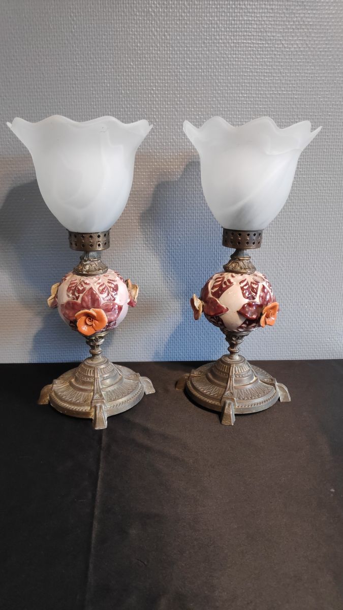 paire de lampes laiton et céramique avec décor floral marron et rose