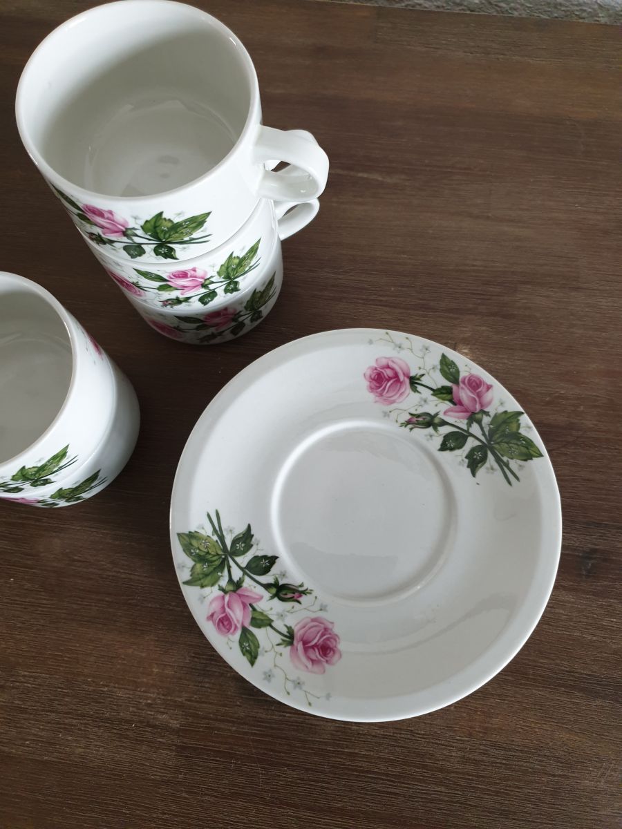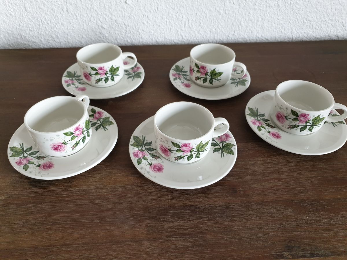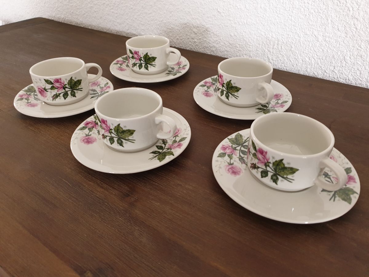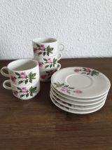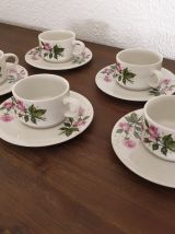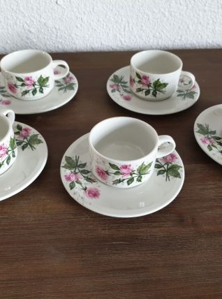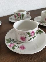 Service à café motifs fleurs style romantique constitué de 5 tasses et 5 sous-tasses en très bon état.