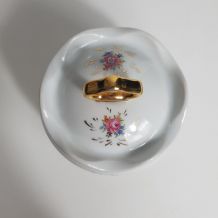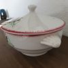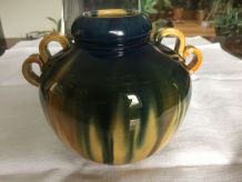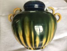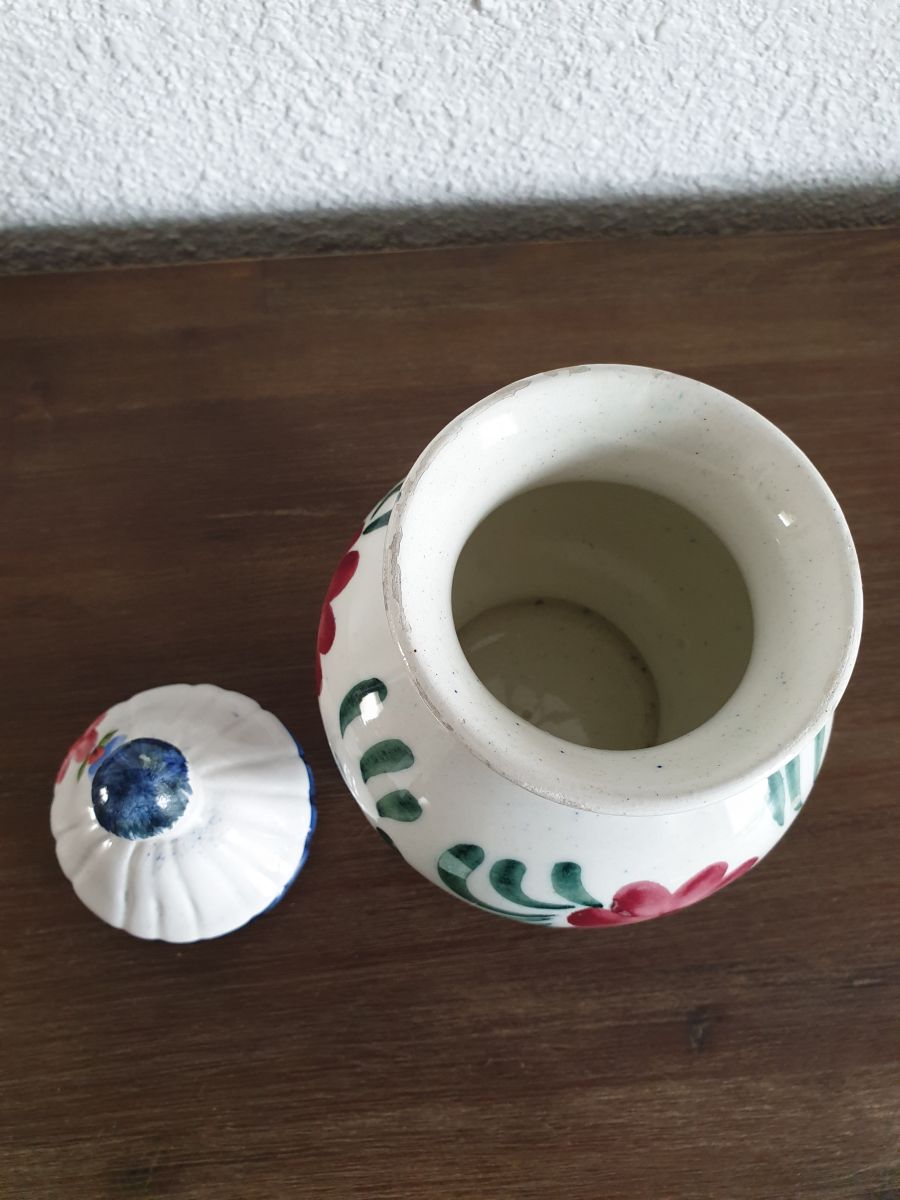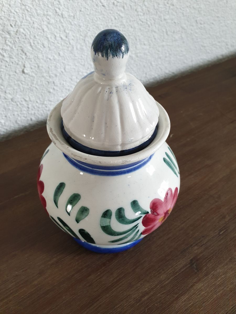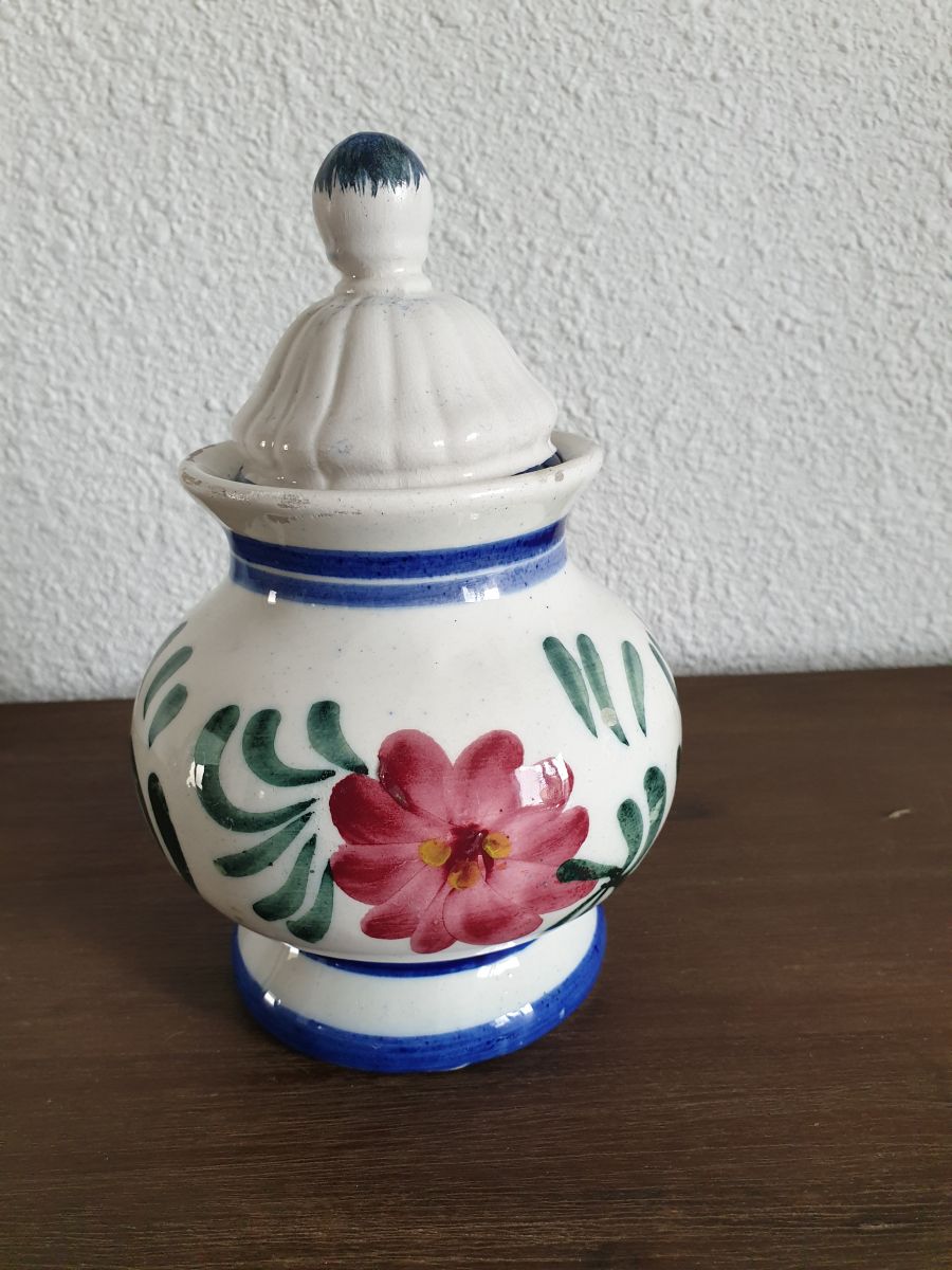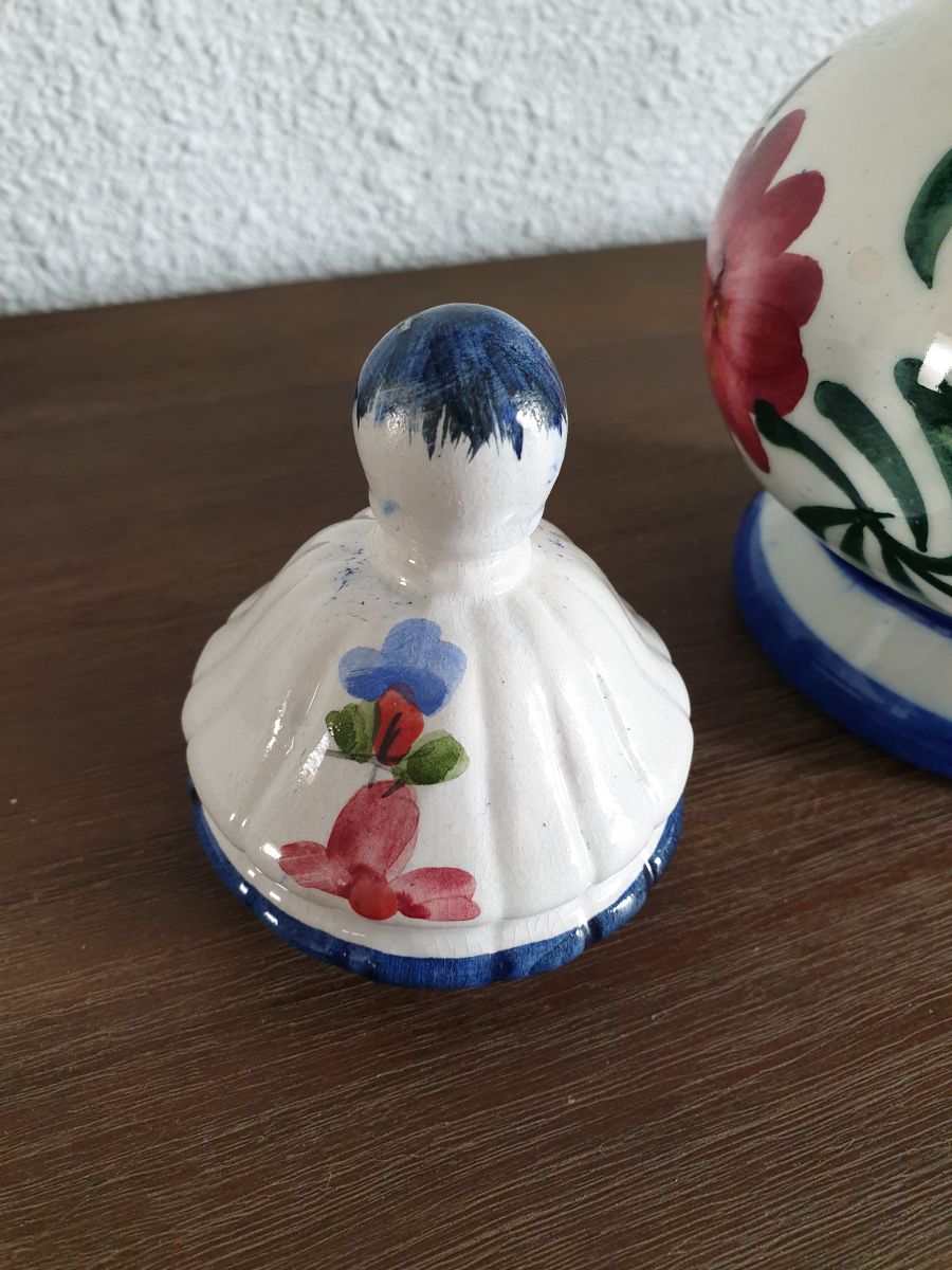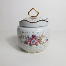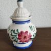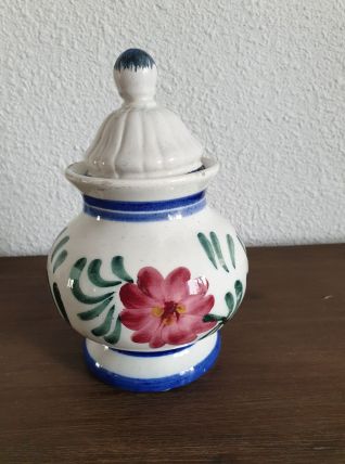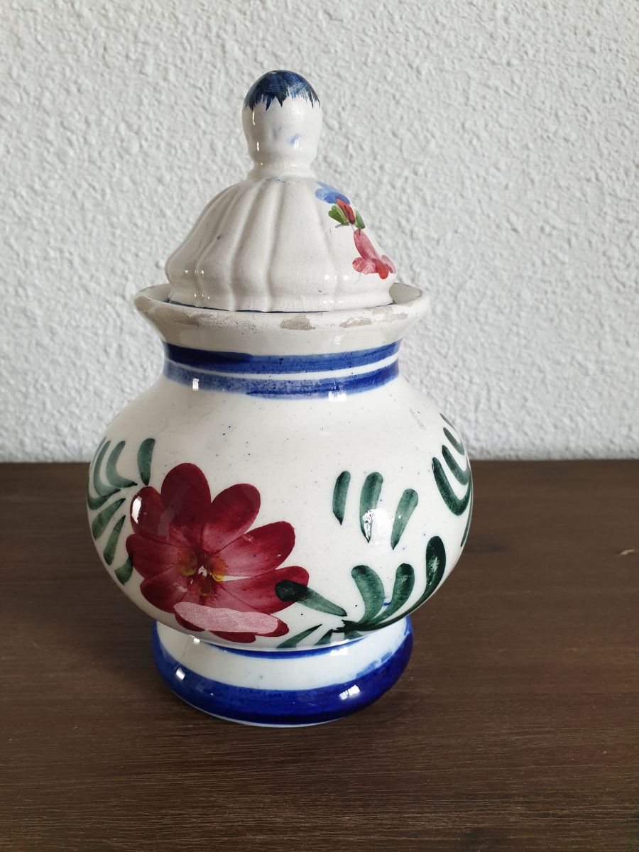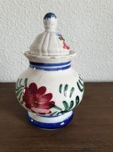 Bonbonnière ancienne peinte à la main, motifs fleurs, parfait pour une décoration style campagne. Quelques traces d'usure sur le col. Hauteur 12, 5cm + couvercle 7, 6 cm.