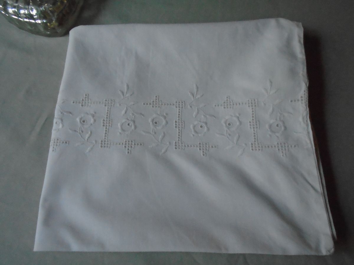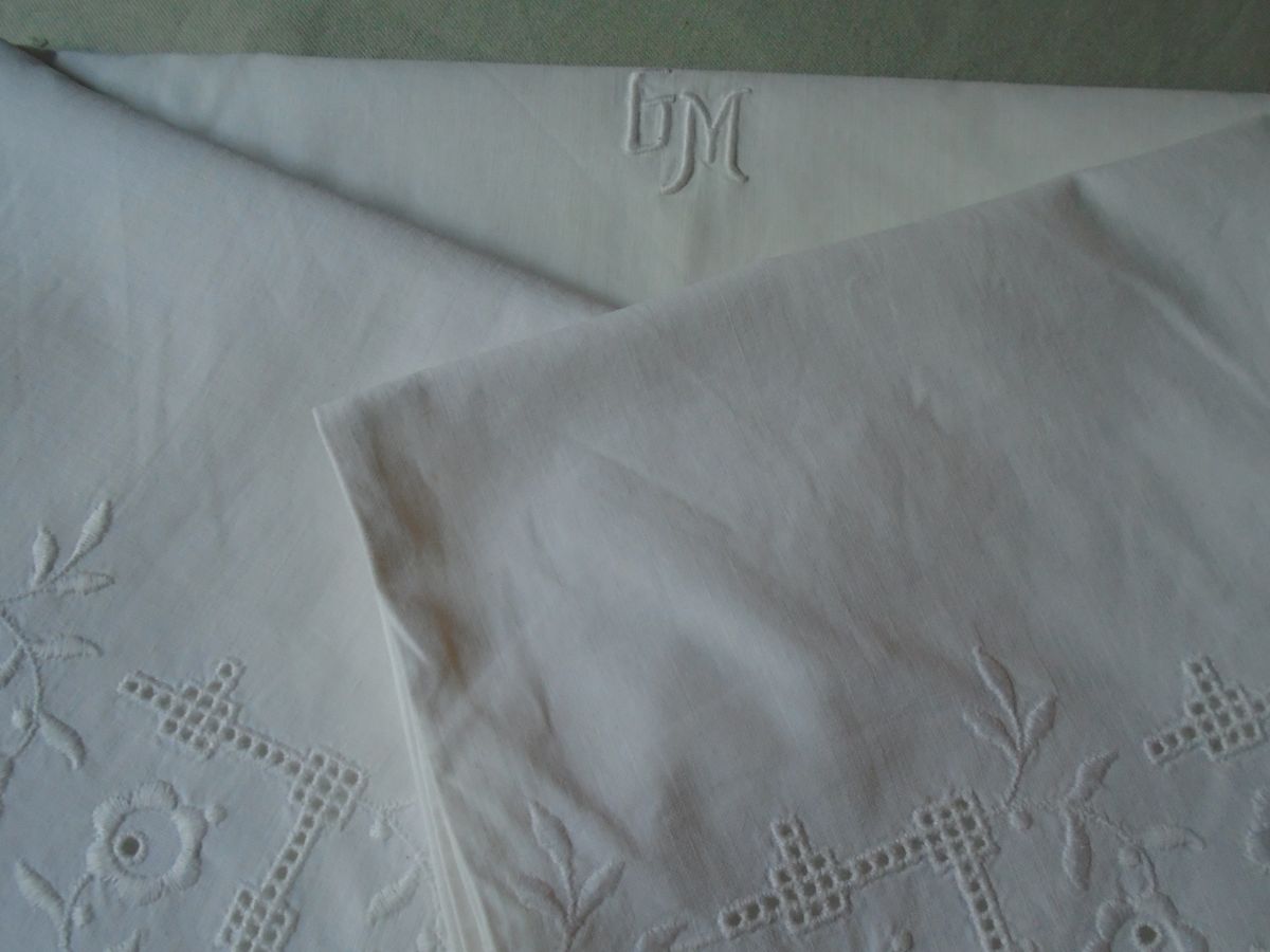 Grande taie en coton blanc, broderies anglaise et monogramme