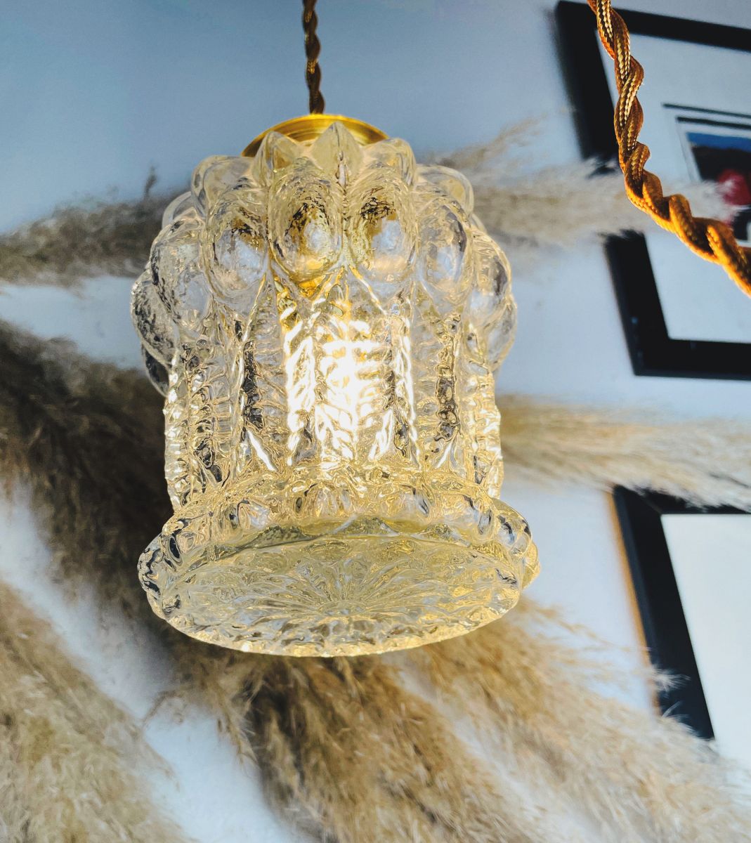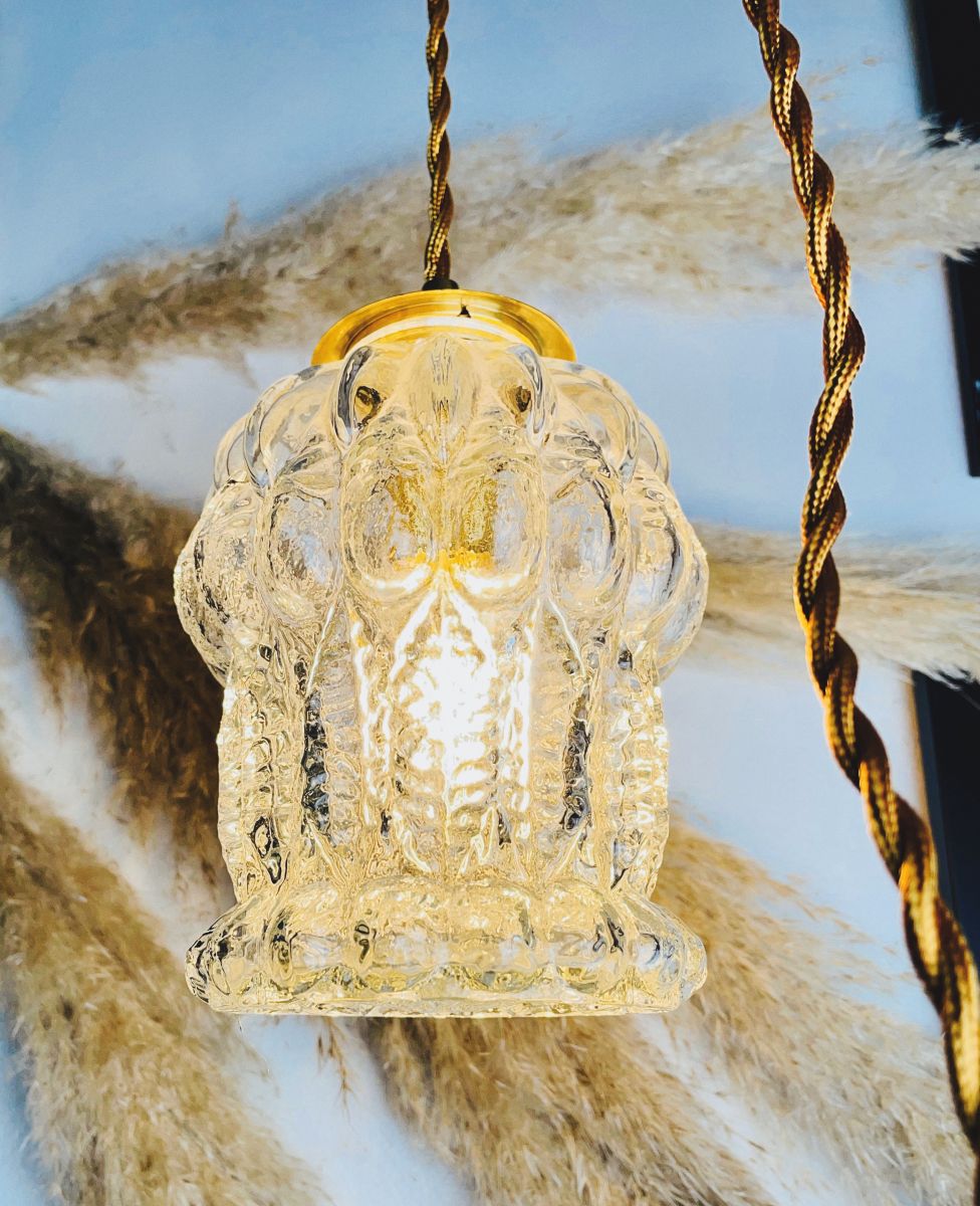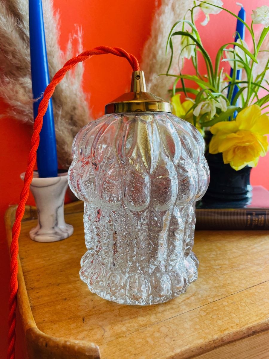 Jolie globe en globe en verre pressé des années 60, originellement utilisé sur un lustre en métal que l'on vous propose détourner en baladeuse ou suspension.