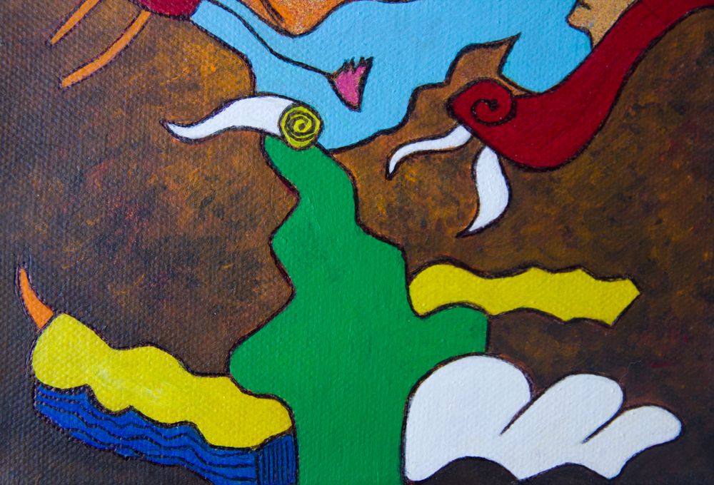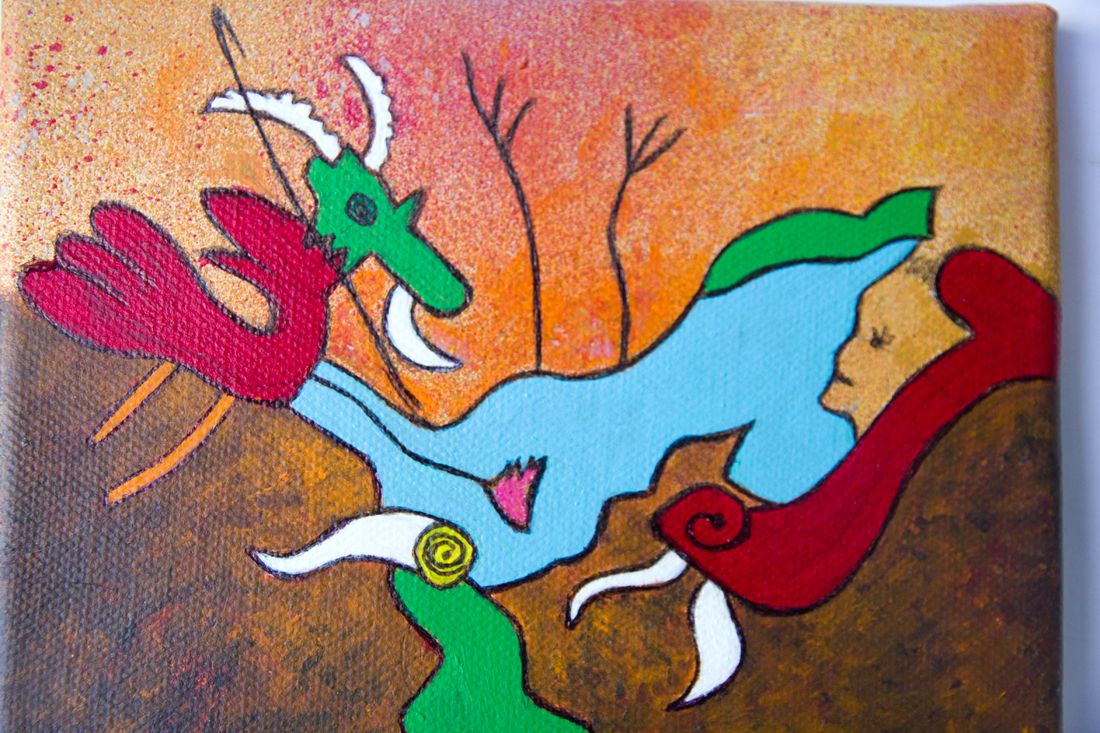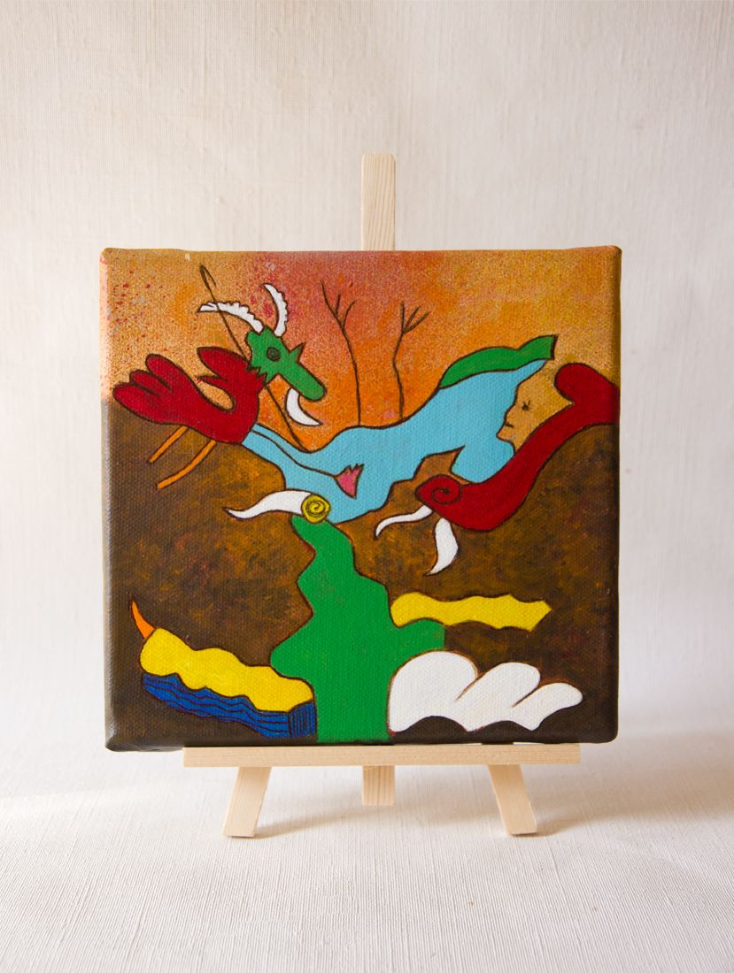 Décoration murale pièce unique de style art singulier. Peinture sur toile châssis petit format carré. Animaux et personnages fantastiques.