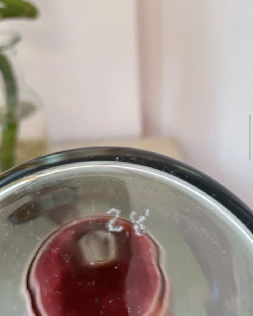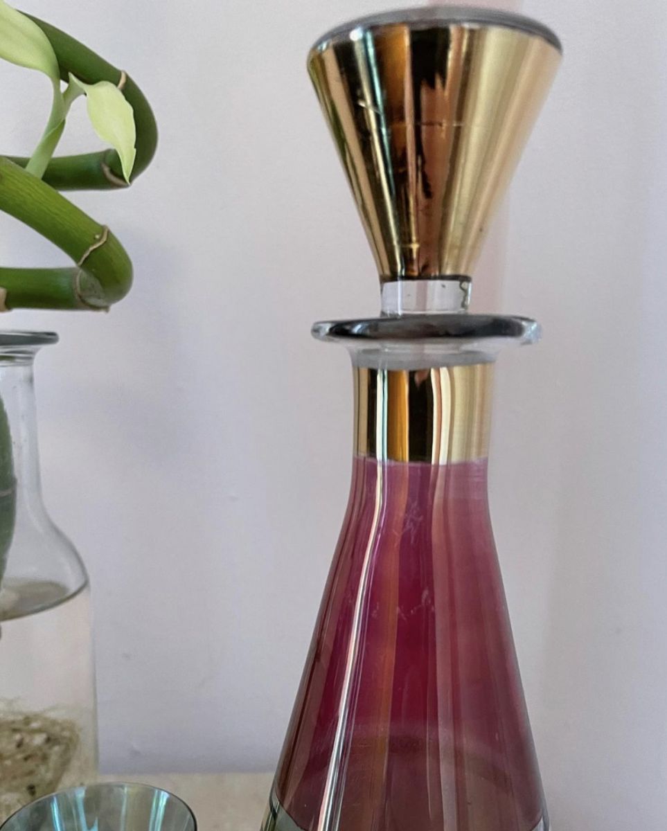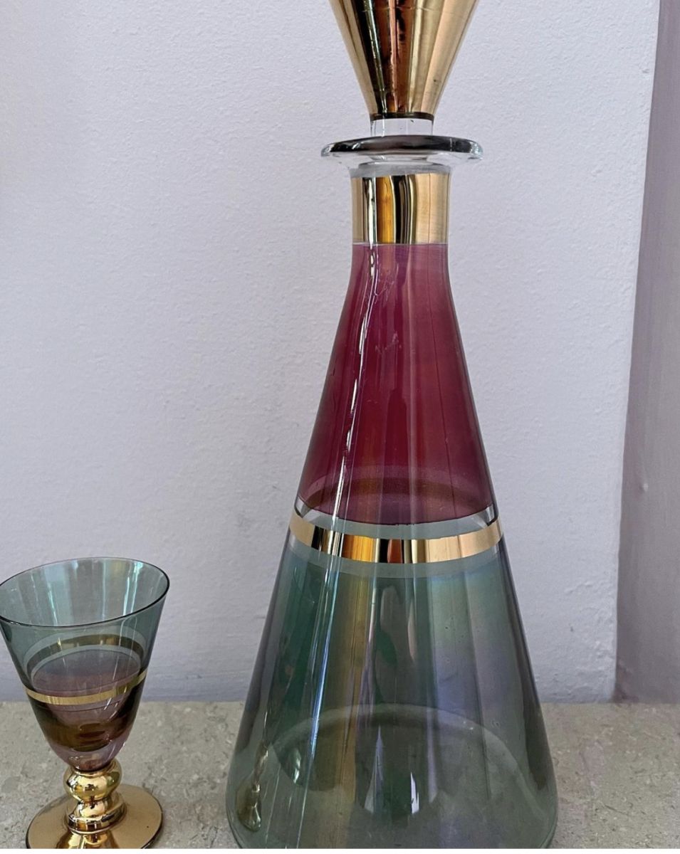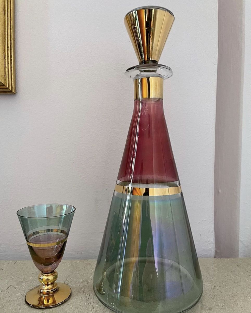 Ancienne carafe à liqueur datant des années 70 avec son unique verre. Dorures en cerclage. Carafe numérotée à sa base par une gravure dans le verre.
