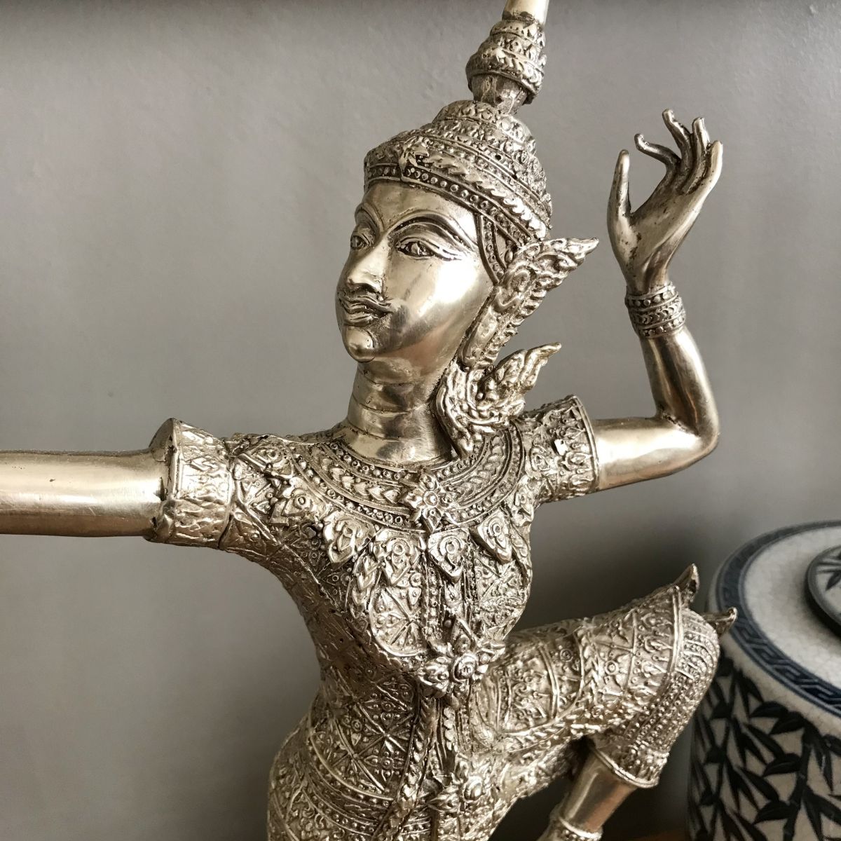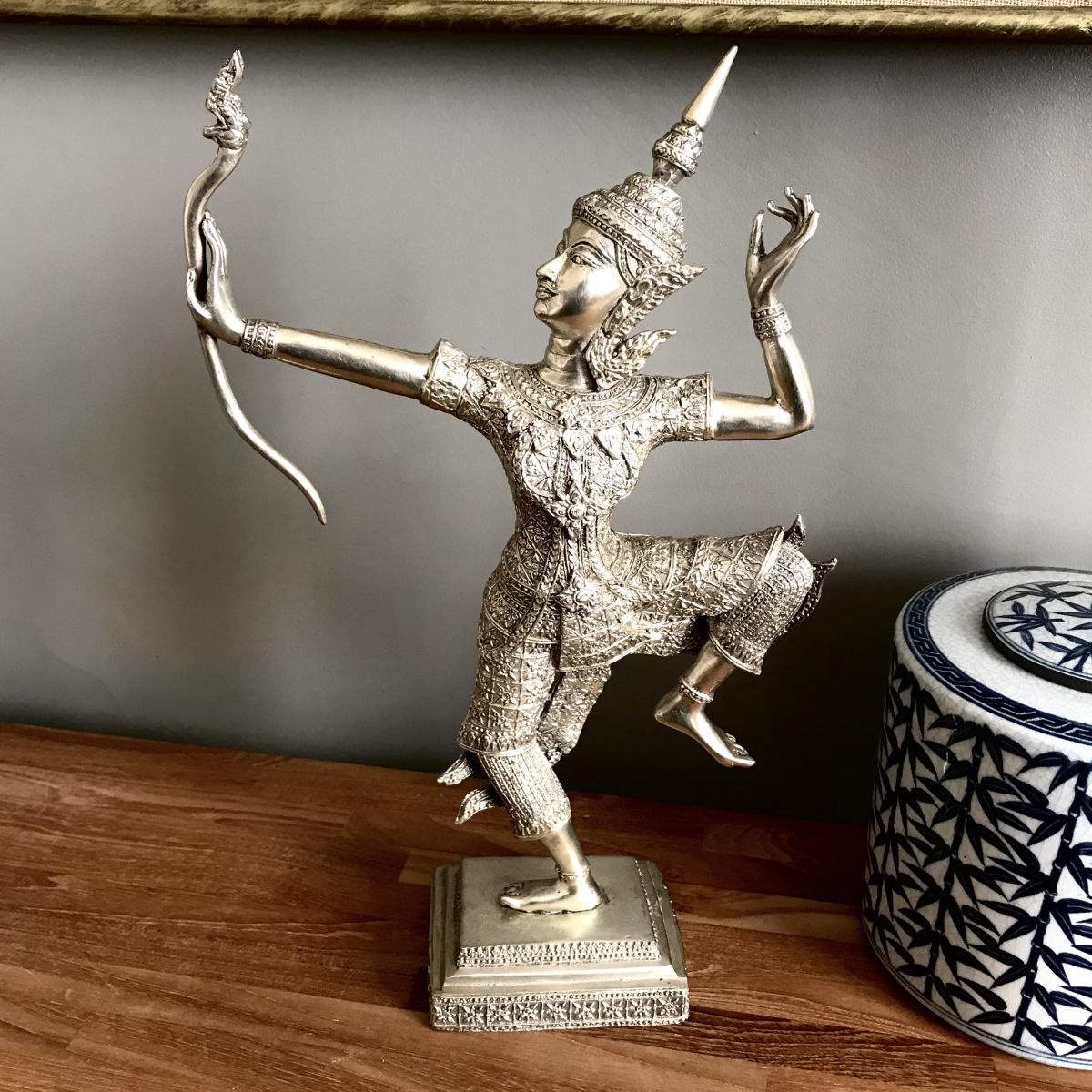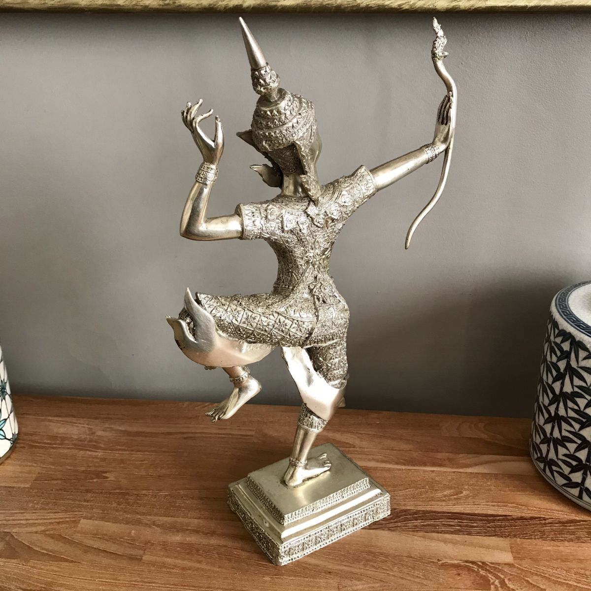 Sculpture en bronze à patine argentée représentant le prince Rama tirant avec son arc. Thaïlande. 37cmx24cm.