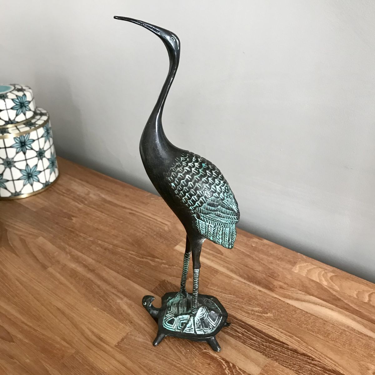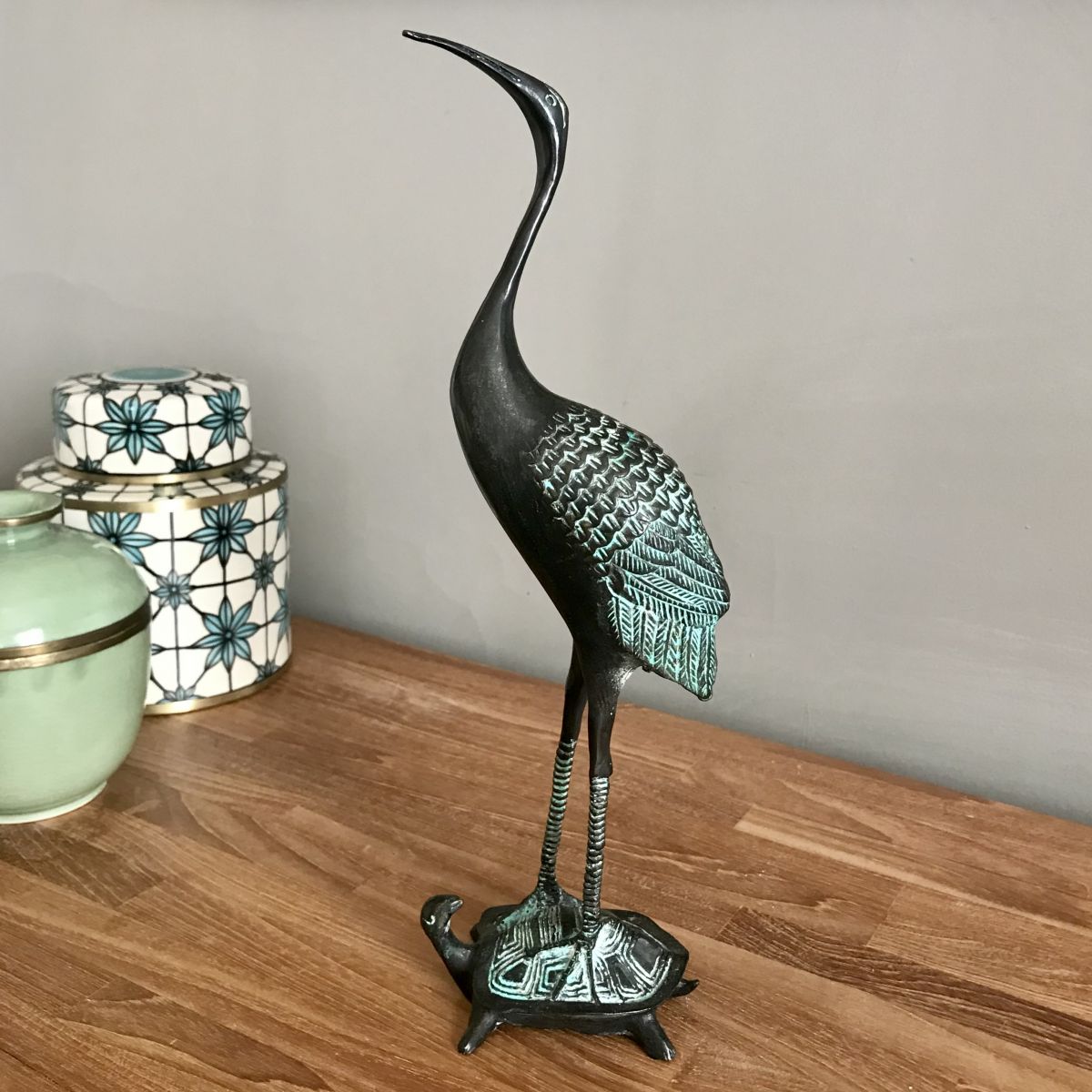 Bronze à patine verte représentant la Grue mythique posée sur la Tortue céleste Lo Shu.