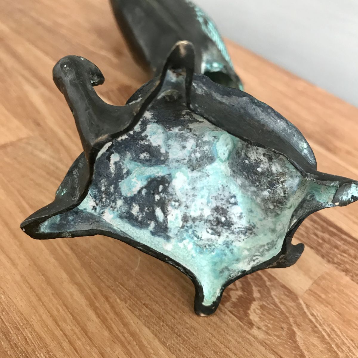 Fabrication traditionnelle. Patine verte avec oxydation naturelle vert de gris. Achetée il y a 20 ans directement aux artisans à Chang Mai en Thaïlande.