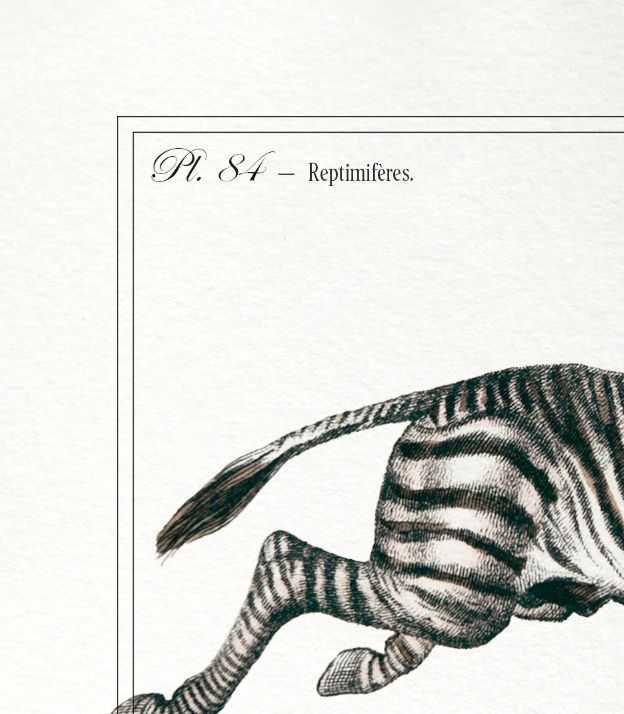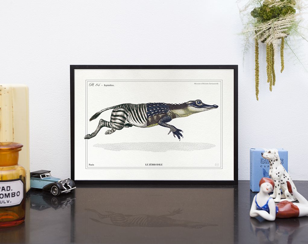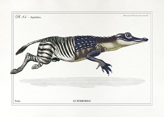 Chimère composée à partir de 2 anciennes gravures datant de 1850. C’est une manière étonnante et ludique de redécouvrir ces superbes gravures d'époque. Ici : le zèbrodile. Pour amateur-rice-s d'illustration hors des sentiers battus ! La composition typographique est dans l’esprit des documents animaliers de cette période. Le format A5 avec une seule chimère est idéal pour composer un ensemble dynamique de plusieurs cadres. Tirage d'art réalisé en impression pigmentaire de très haute qualité sur papier 300gr. Le résultat est magnifique, d’une grande précision, un rendu identique à une sérigraphie ou l’offset, mat et velouté (c’est la qualité des tirages de galeries d’art). Le tirage sera discrètement signé en bas à droite. Tirage vendu seul sans le cadre (possibilité de l’obtenir encadré). D’autres chimères disponibles. Format A5 = 15 X 21 cm ou A4 = 21 x 30 cm (50€)