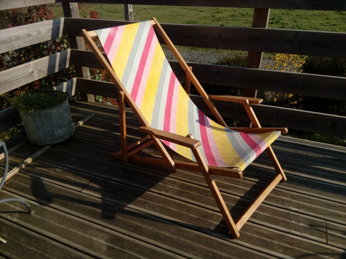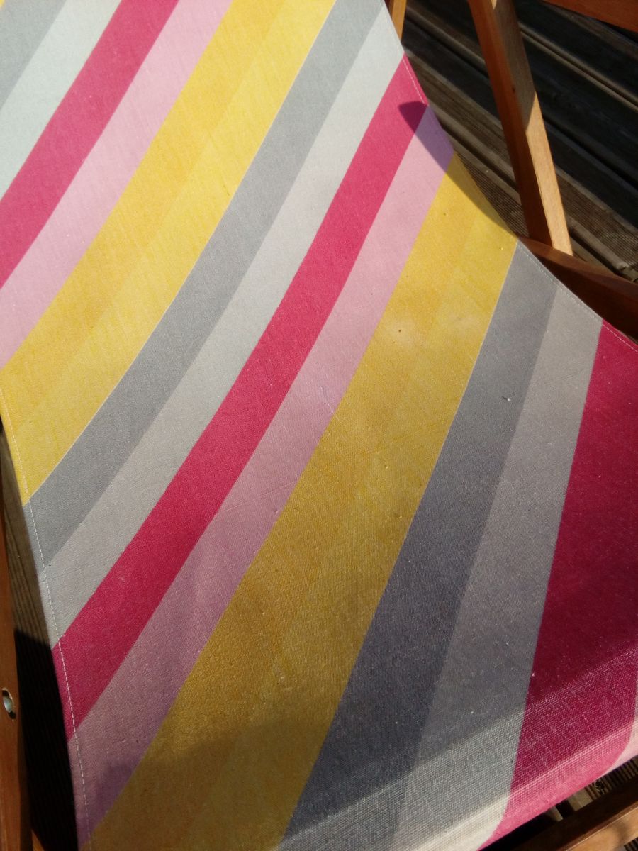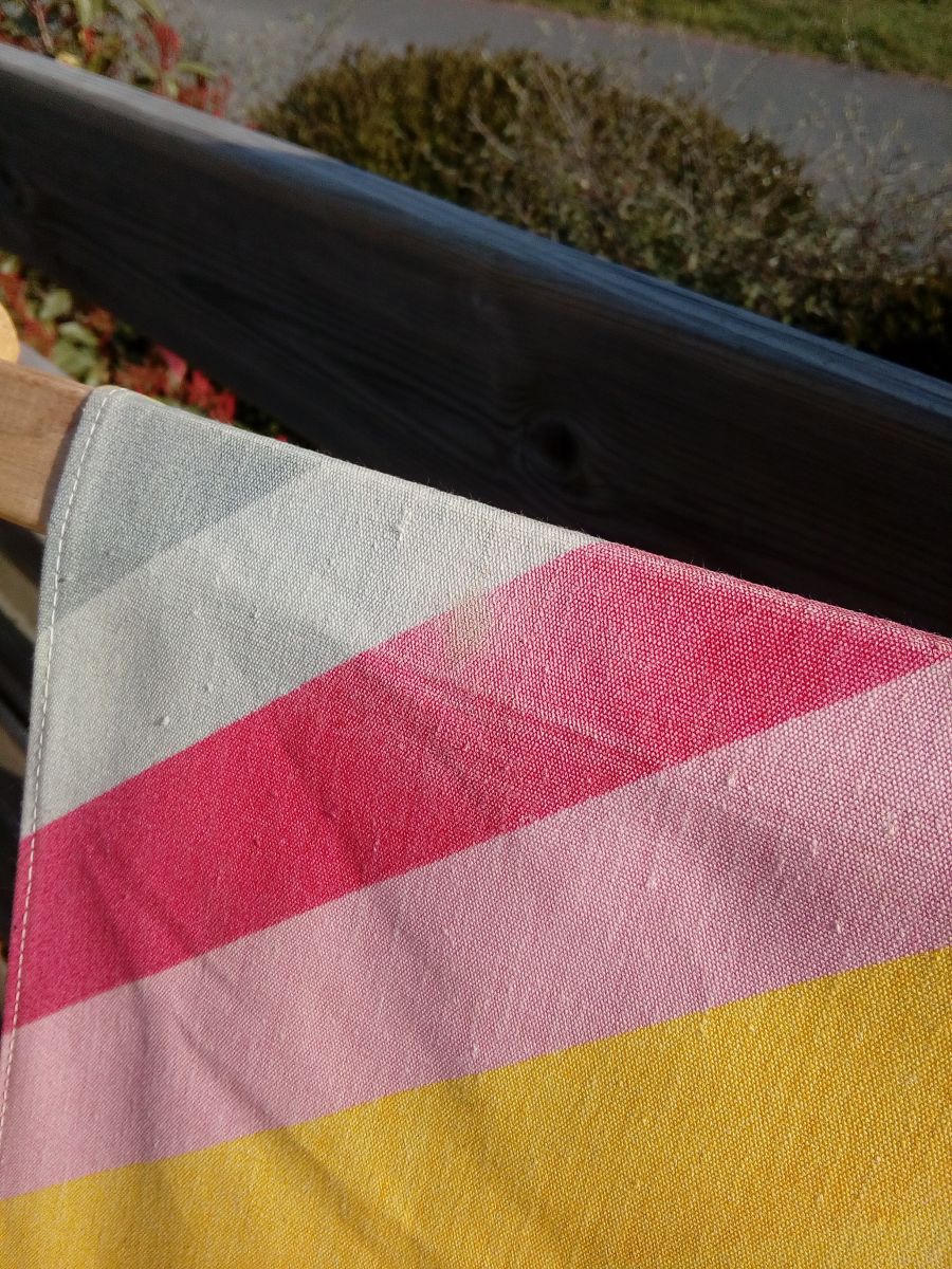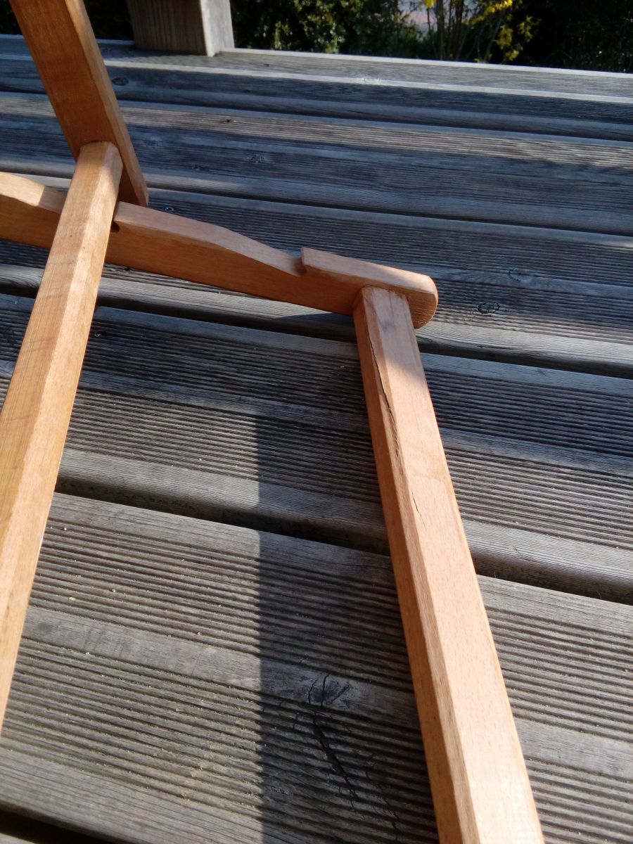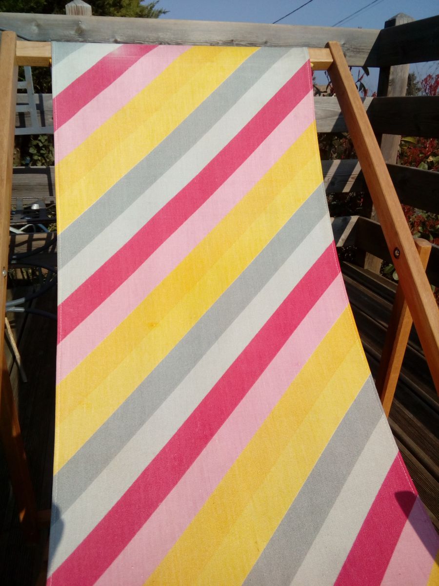 Fauteuil de jardin, des années 60 ou 70, avec une structure tout en bois et une assise en tissu rayé très solide (d'origine je pense), avec 3 inclinaisons possibles. J'ai nettoyé l'ensemble (le tissu a été lessivé en place), puis j'ai légèrement poncé et reverni la structure (une très fine couche de vernis « chêne clair » mat pour la protéger un peu contre l'humidité tout en gardant sa patine). Elle est encore solide mais ne cache pas son âge et les traces d'usages : bouloches, décolorations et quelques taches qui subsistent sur le tissu malgré le nettoyage. Rayures et taches diverses sur la structure et une fissure (assez longue mais peu profonde) sur la traverse arrière, qui ne remet pas en cause la solidité du fauteuil à mon avis. En position ouverte, ce fauteuil mesure 88 cm de hauteur maximale (en position la plus haute). Il mesure 64 cm de largeur maximale (au niveau des accoudoirs). L’empiétement minimal est de 94 cm par 54 cm, et maximal : 102 cm par 54 cm. En position fermée, c'est à dire complètement à plat, il mesure 147 cm de longueur par 64 cm de largeur pour seulement 4 cm d'épaisseur, il peut donc être aisément rangé derrière un meuble quand vient le mauvais temps (mais malheureusement pas envoyé en colissimo). Il doit peser 4 ou 5 kg environ.