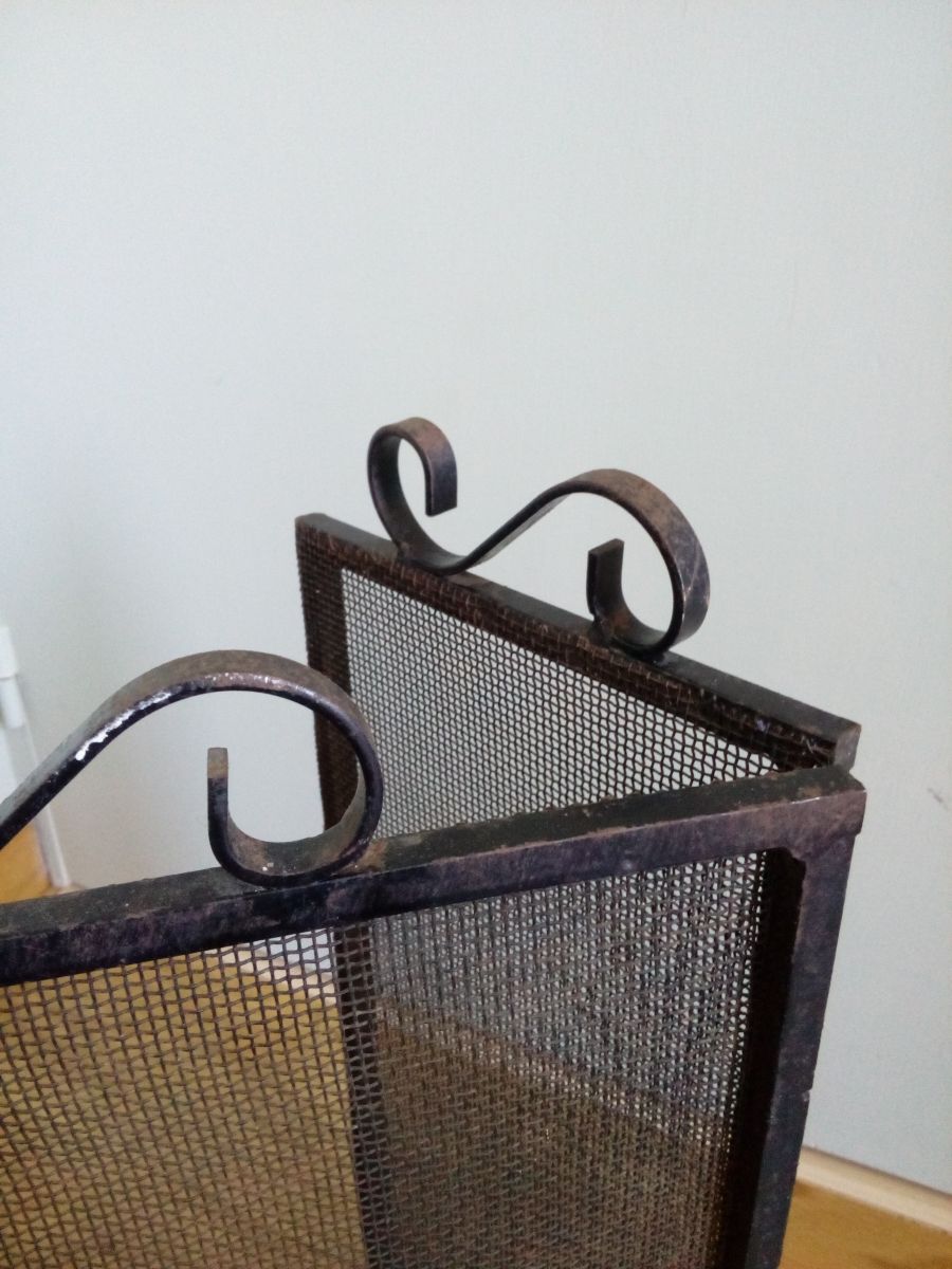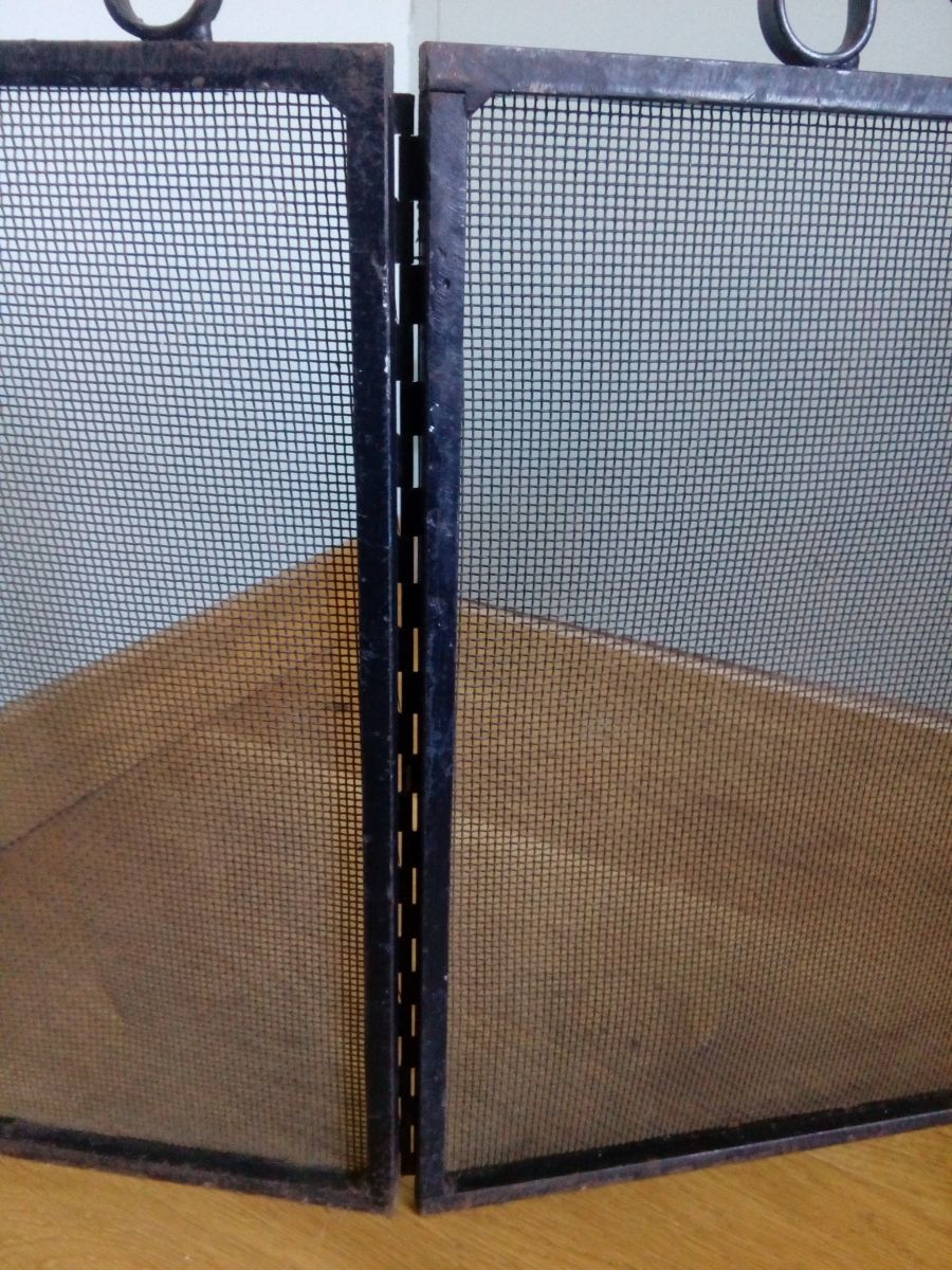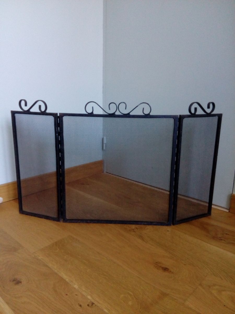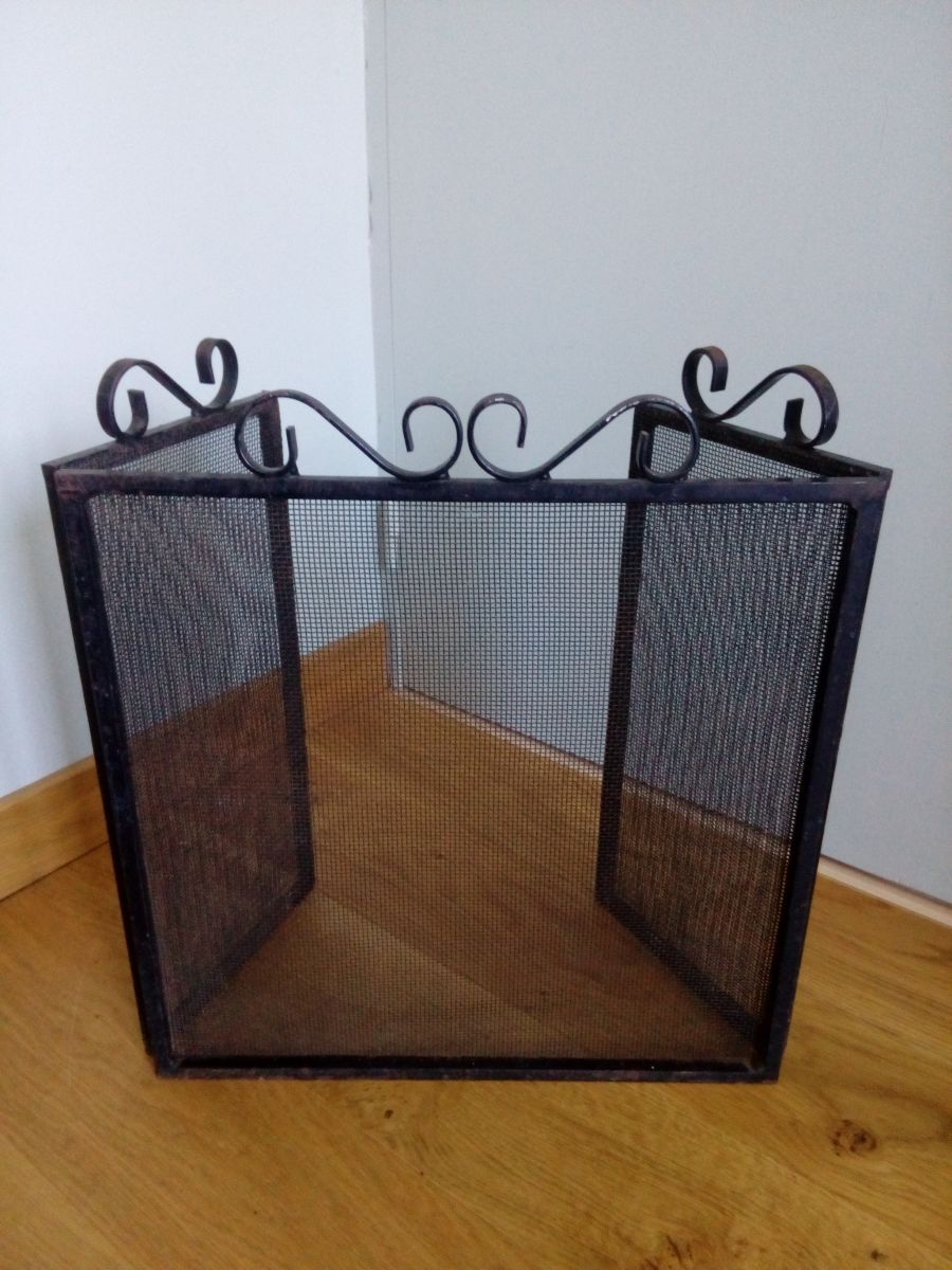 Grille de protection de cheminée en trois parties mobiles, en métal peint en noir, qui doit dater des années 80. Les volets sur les cotés mesurent 19 cm de largeur. Le volet central mesure 40 cm de largeur. L'ensemble mesure 45 cm de hauteur (40 cm sans les volutes en fer forgé). L'ensemble est en bon état, solide, mais présente aussi les traces du temps : manques sur la peinture, rouille (superficielle), quelques déformations (enfoncements) sur le grillage. Cette grille de cheminée pèse 4 kg environ.