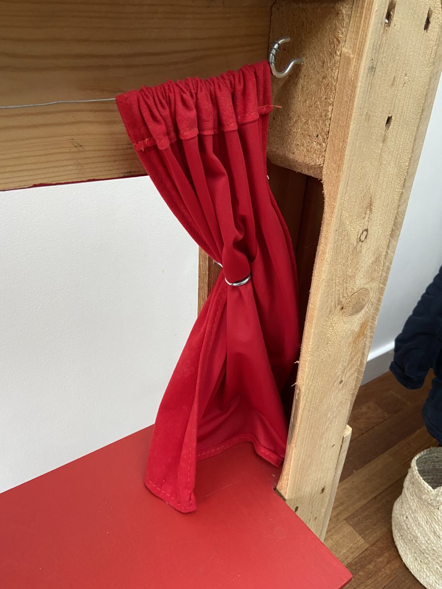 Couleur bois brut et rouge. Petits rideaux en velours ras rouge.