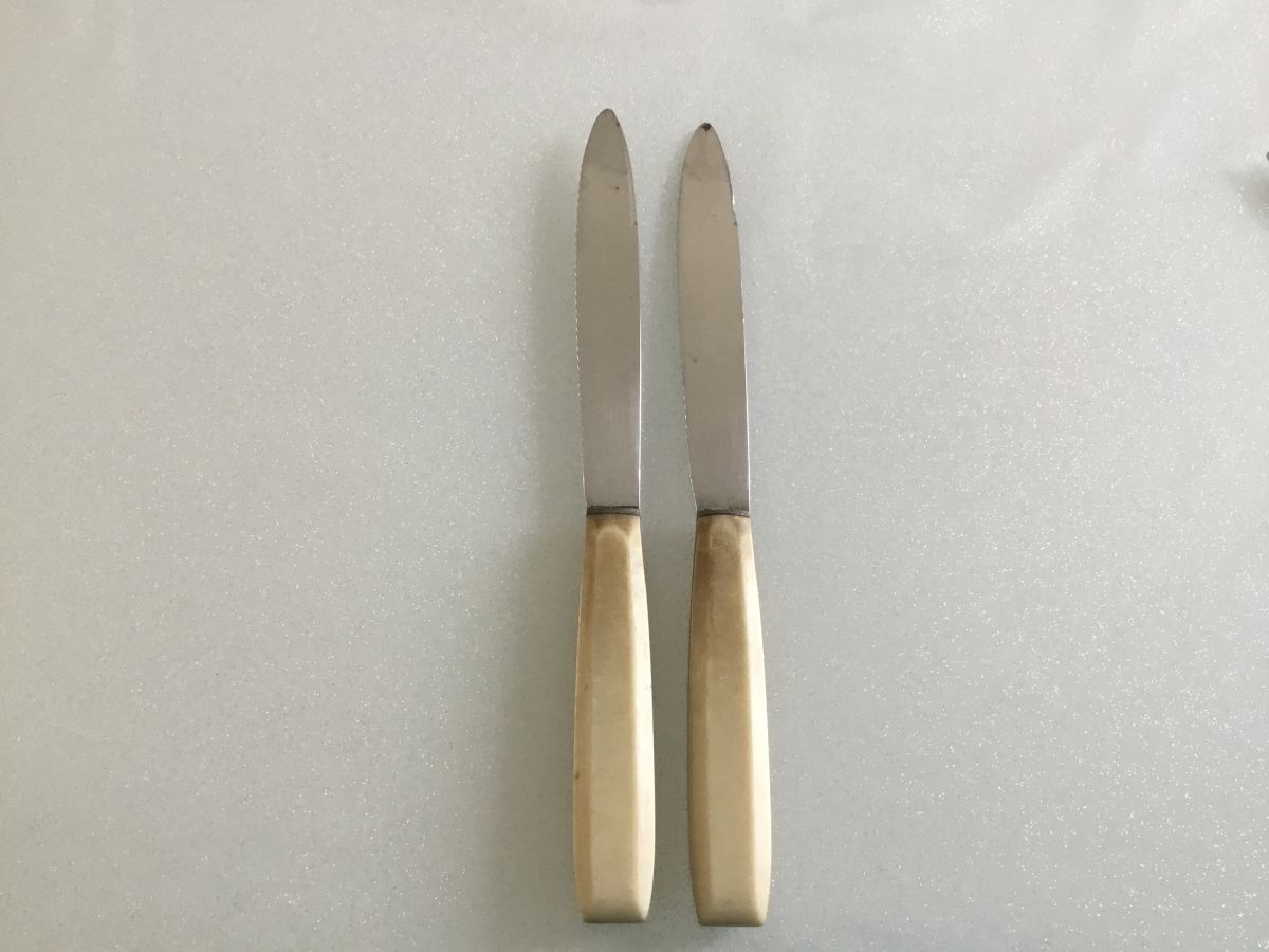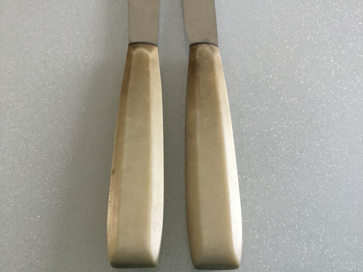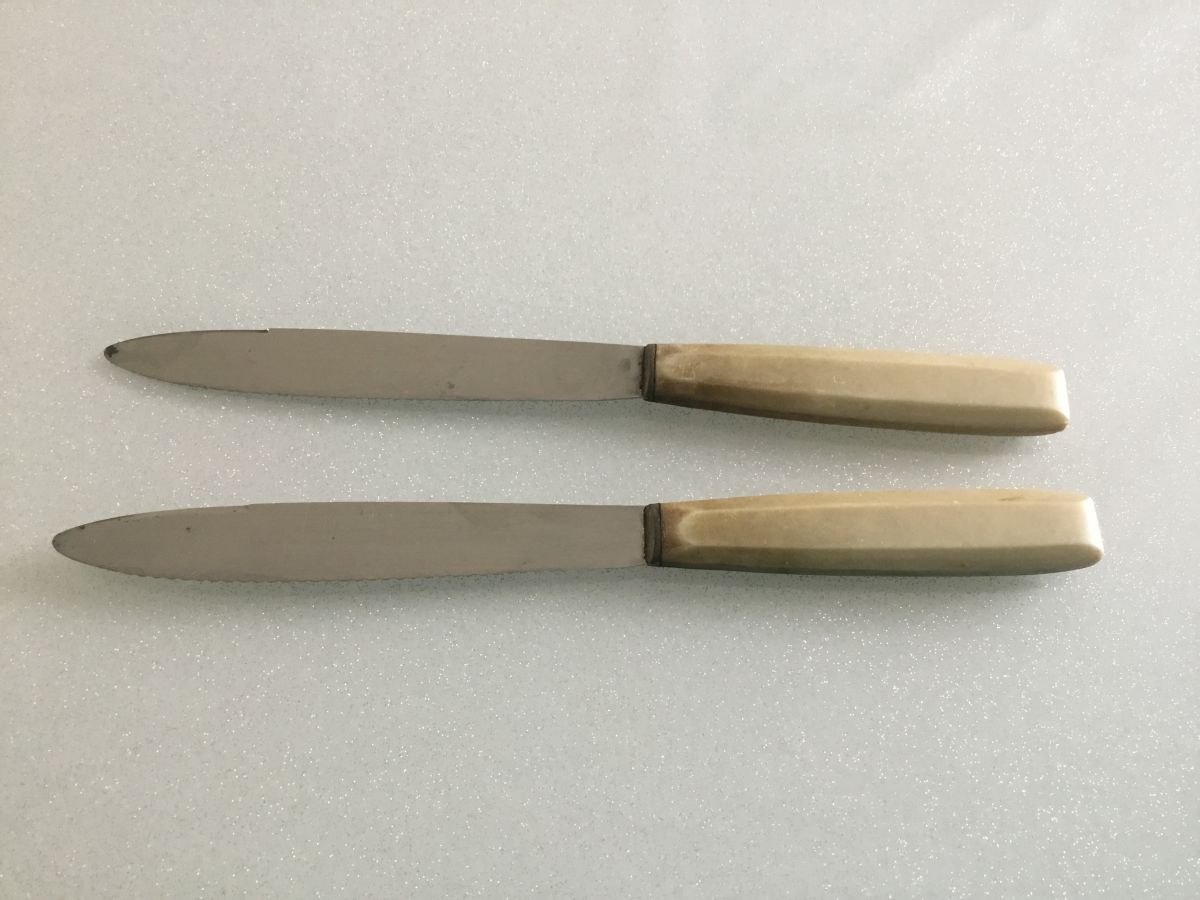 2 couteaux avec manche Bakélite Art Déco lame ´ Joyeuse ´ ´dans leur jus.