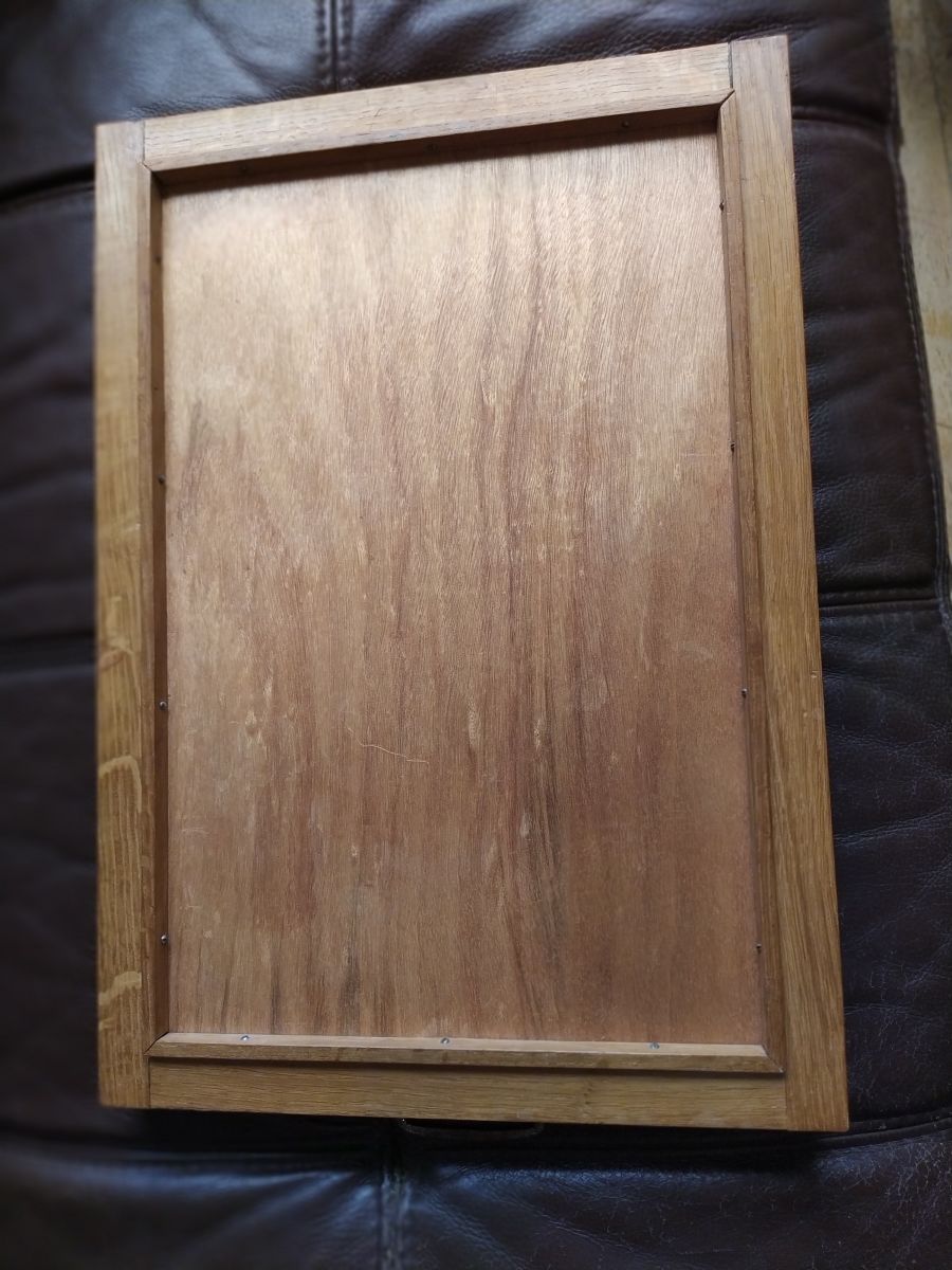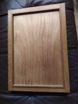 Très beau plateau artisanal en marqueterie. Son motif est très géométrique sans devenir lassant. Dimensions 56 cm (avec les poignées) x 35.5 x 3 cm. Il est en très bon état. Il est recouvert d'une plaque en verre, 2.4kgs.