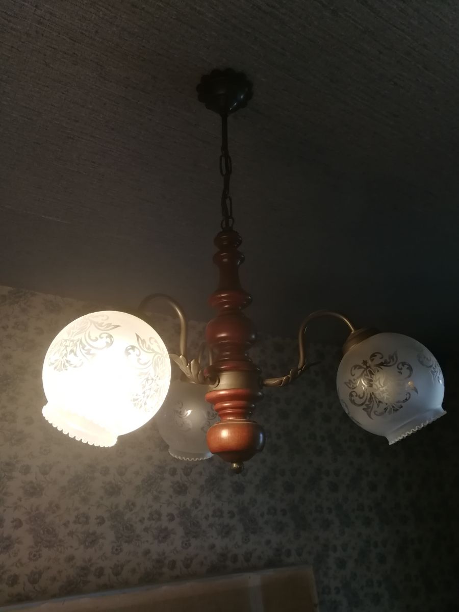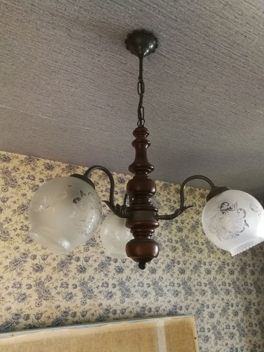 Lustre ancien, stusture en bois et les branches sont en métal, 3 globes en verre. En bon état.