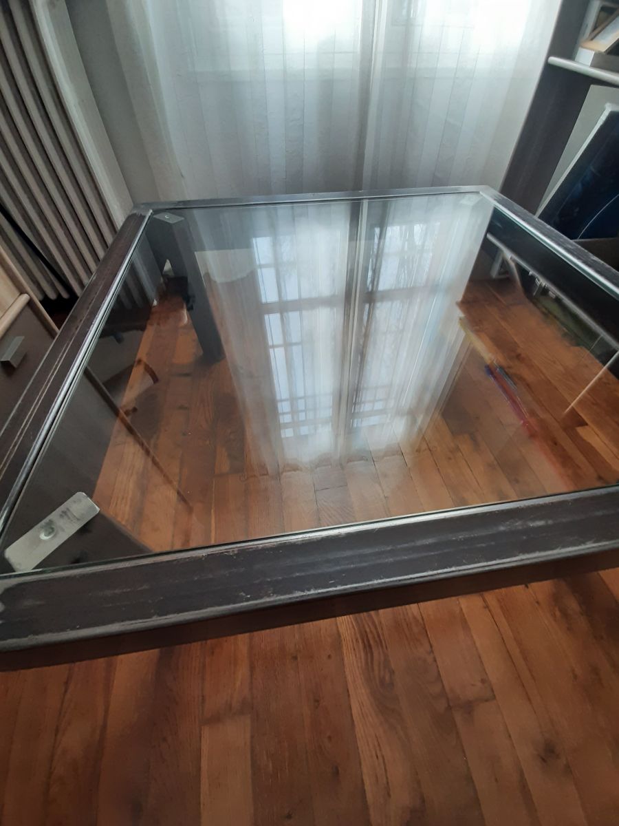 Composé d une large structure en métal et d'un plateau de verre , ses dimensions généreusede 1MX1MX45H font de cette table basse un meuble de charme
