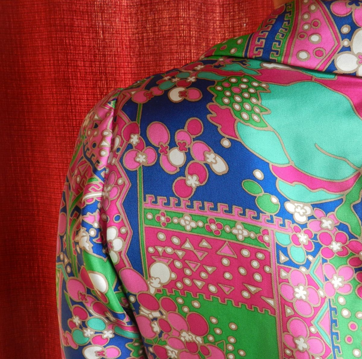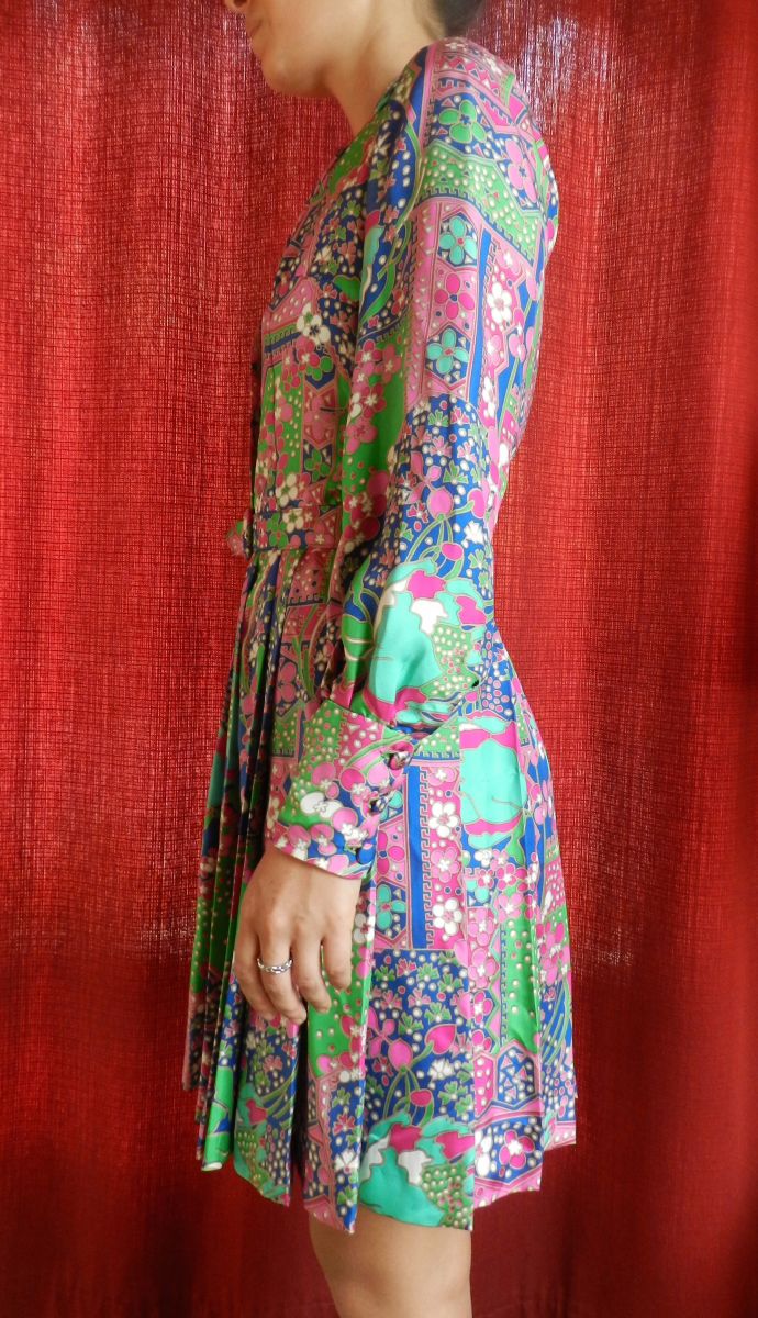 Robe vintage année 70. Jupe plissé et col chemise. Imprimé fleuri. Matière synrthétique douce et légère avec doublure verte. Ceinture amovible.